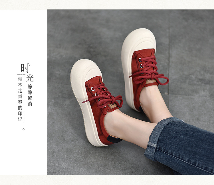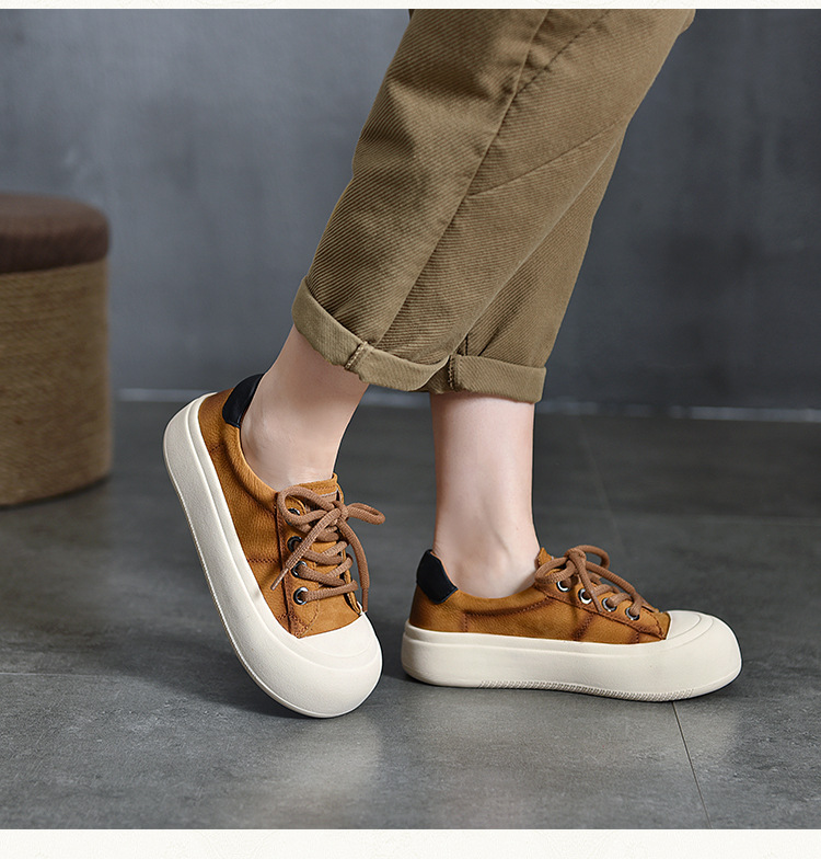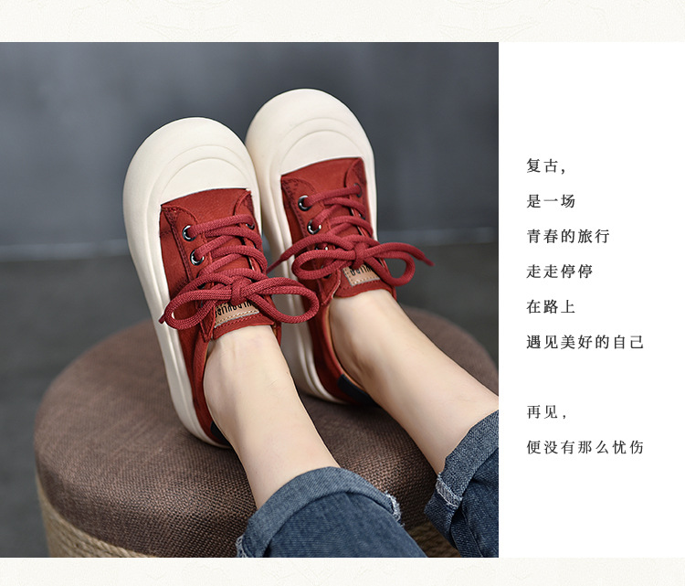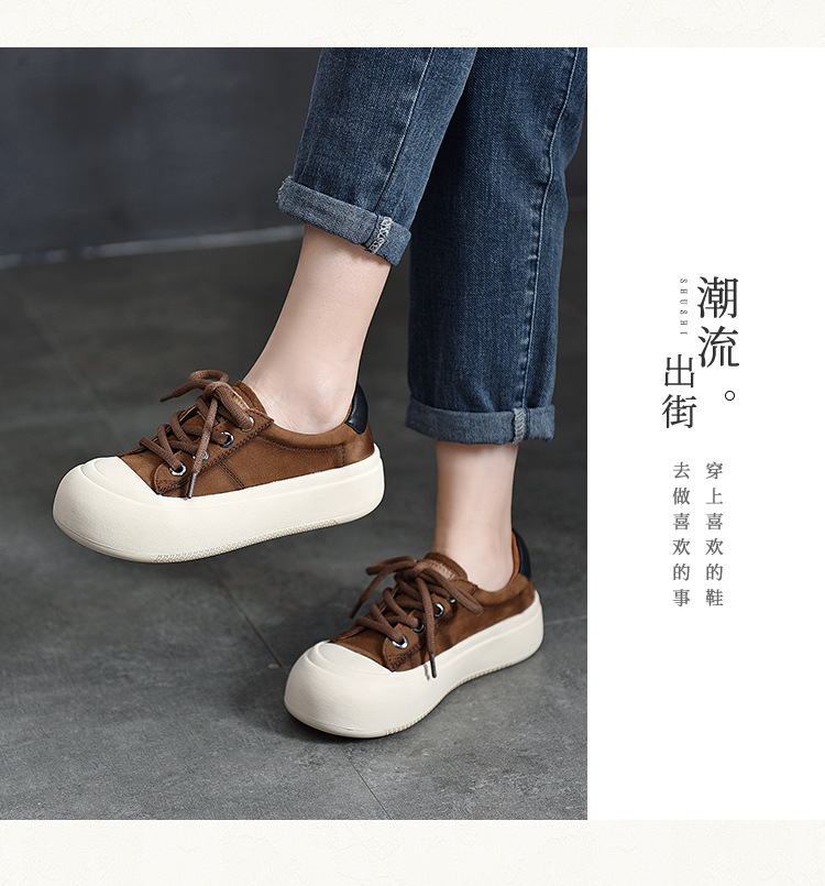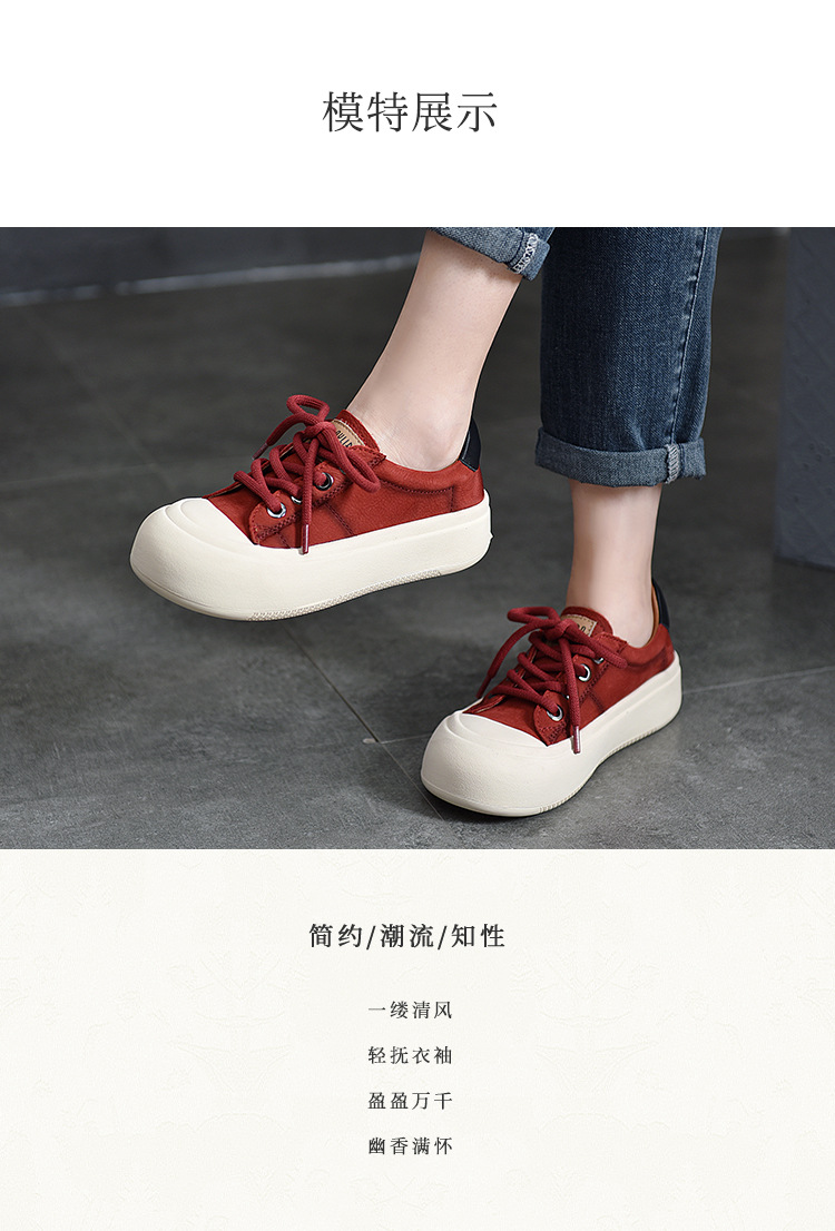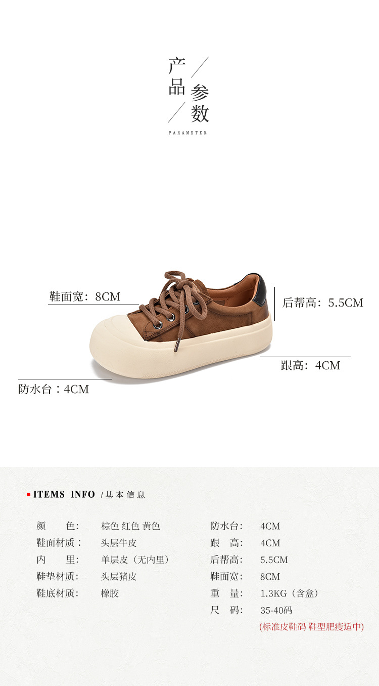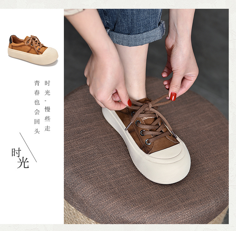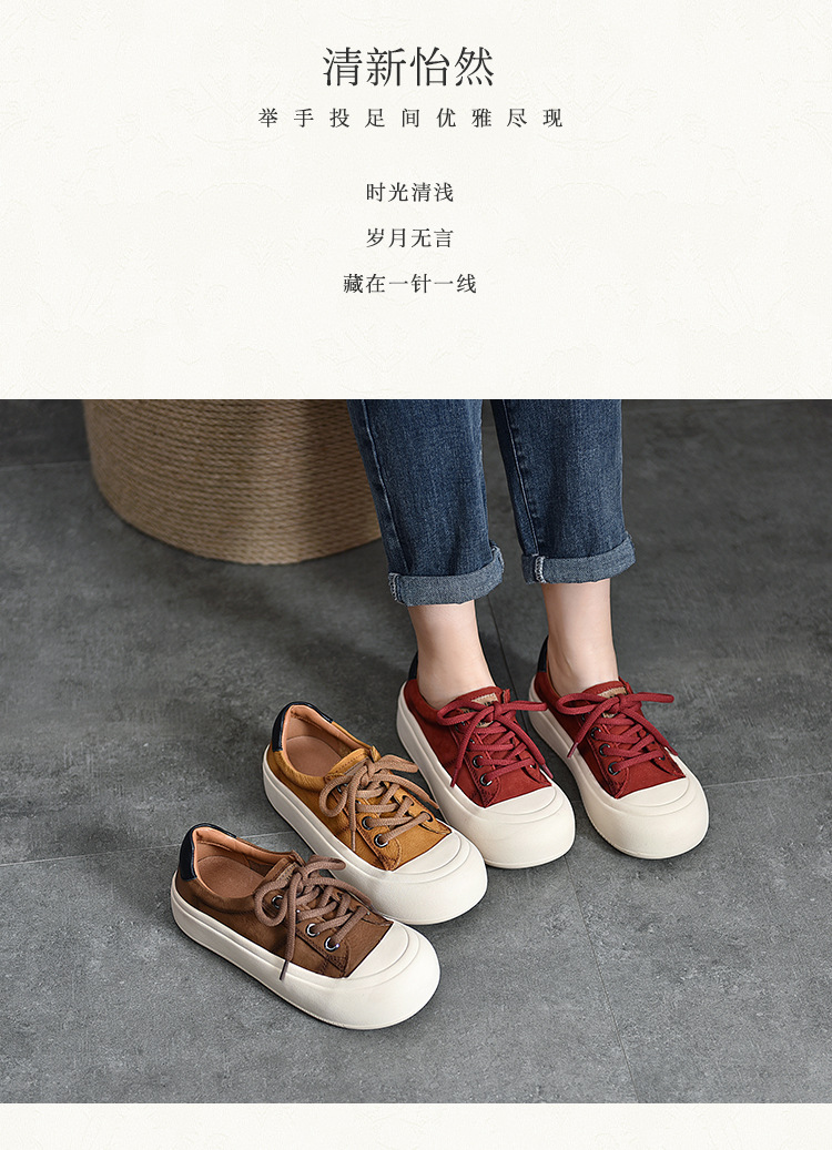 여성을위한 첫 번째 레이어 소 가죽 캐주얼 신발 2025 가을 빨간색 레이스 업 로우 탑 대형 라운드 발가락 여성 신발 복고풍 플랫 힐 스니커즈