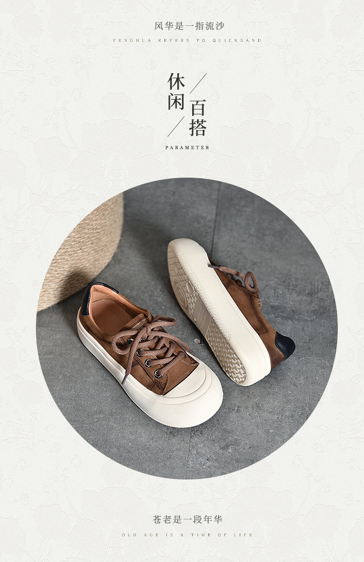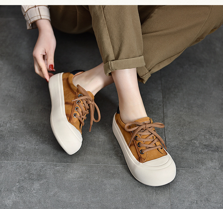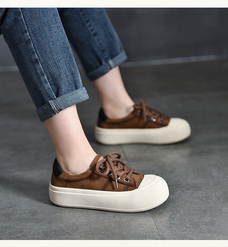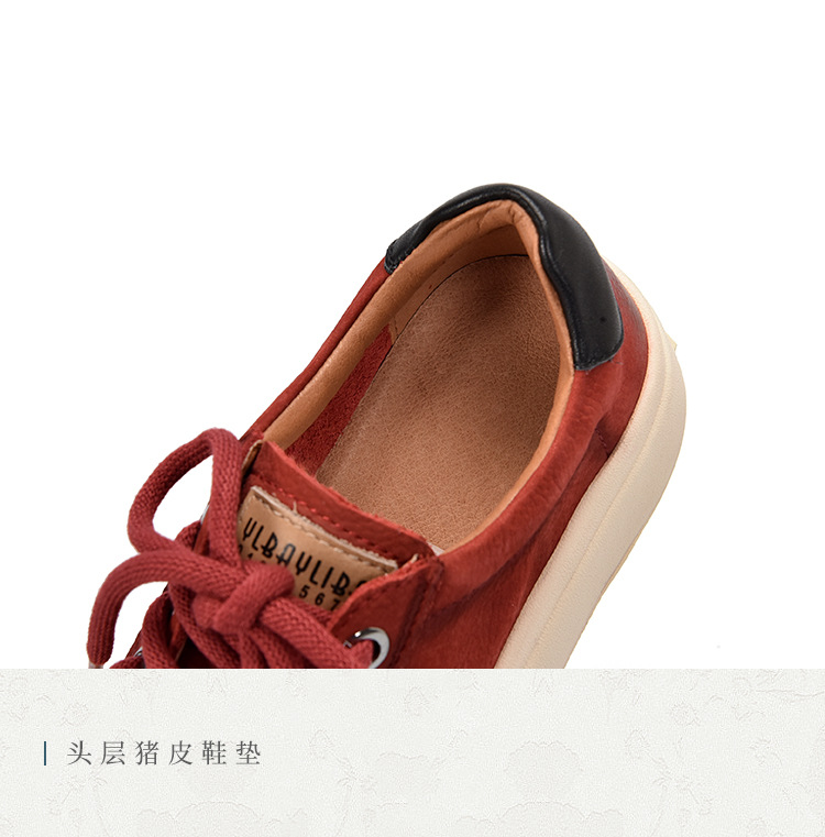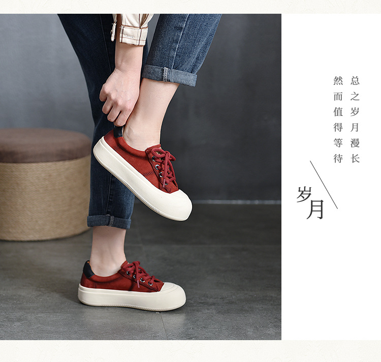 여성을위한 첫 번째 레이어 소 가죽 캐주얼 신발 2025 가을 빨간색 레이스 업 로우 탑 대형 라운드 발가락 여성 신발 복고풍 플랫 힐 스니커즈스토어 가기