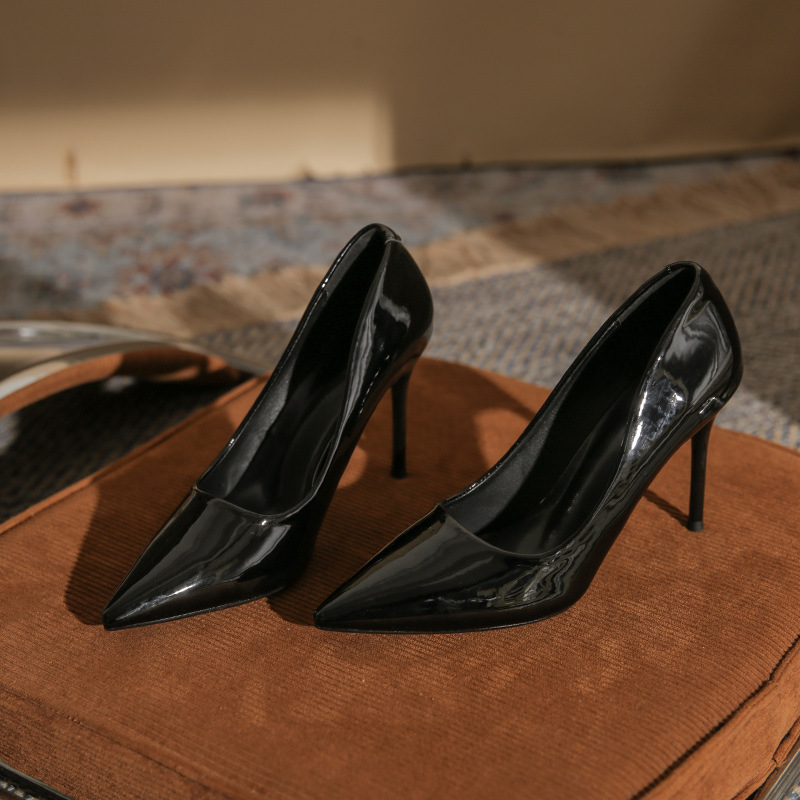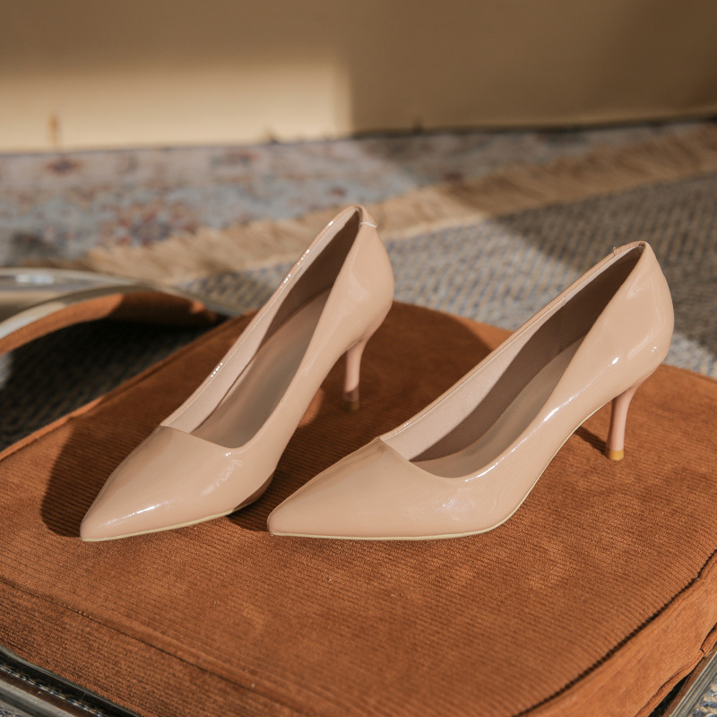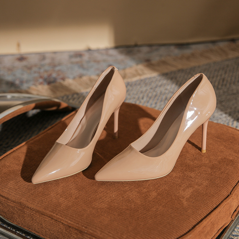 여성을위한 비 연삭 누드 하이힐 신발 2025 새로운 인터넷 연예인 섹시한 특허 가죽 스틸레토 지적 발가락 부드러운 가죽 신부 들러리 신발스토어 가기