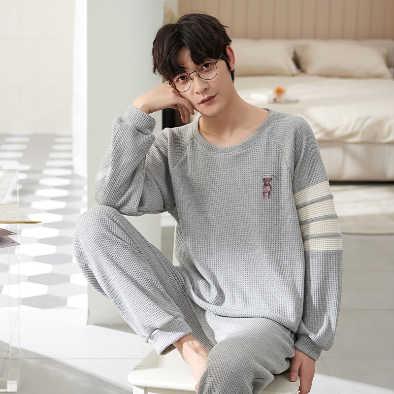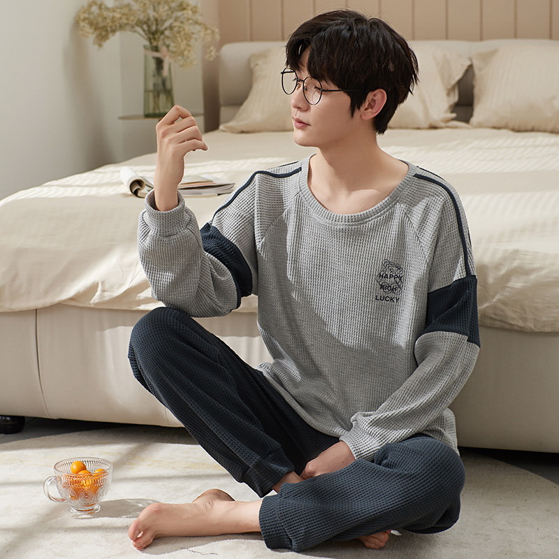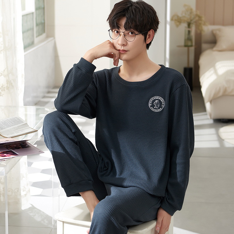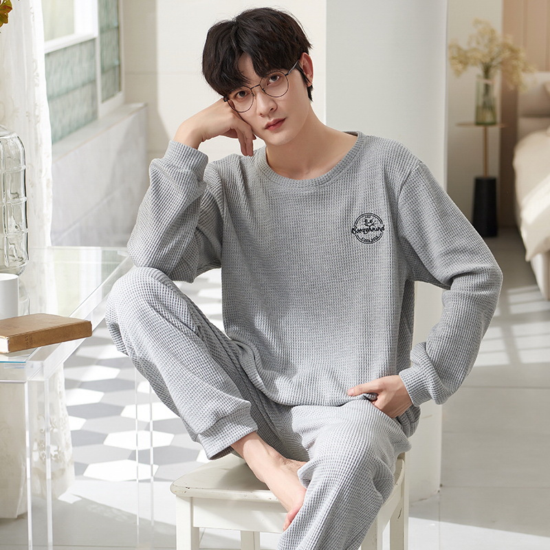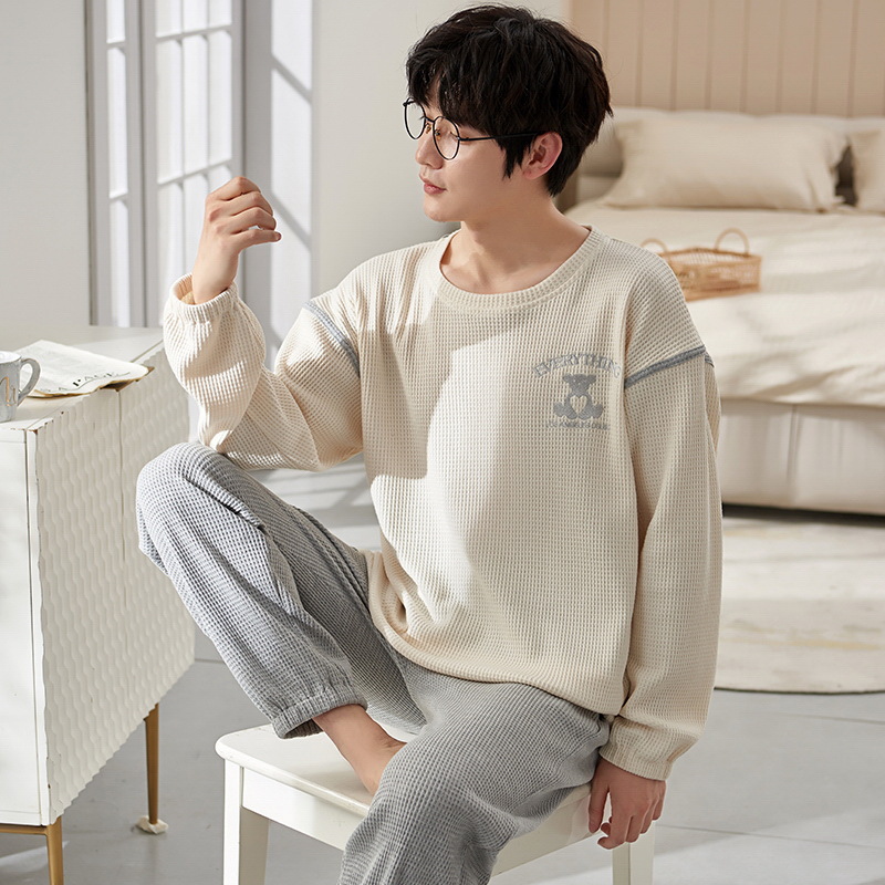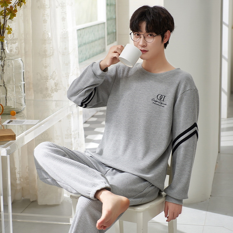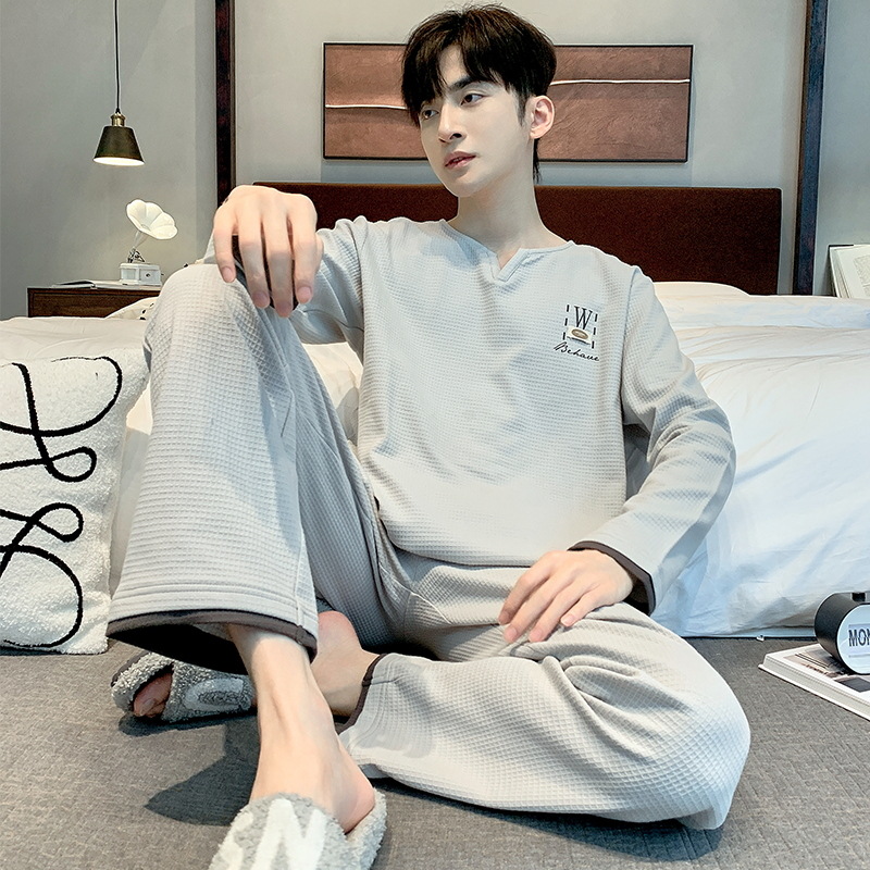와플 잠옷 남자의 면 봄과 가을 새로운 스타일 긴 소매 젊은 남자의 가정 옷 세트 하이 엔드 웨어러블스토어 가기