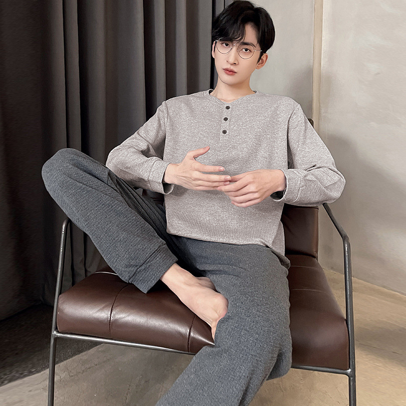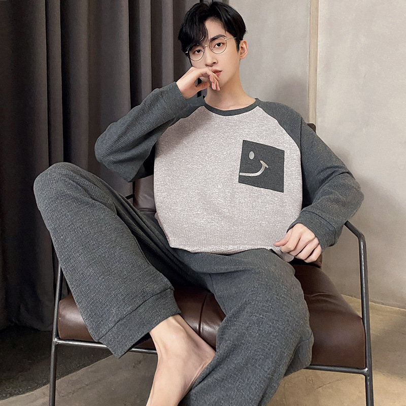 와플 잠옷 남자의 면 봄과 가을 새로운 스타일 긴 소매 젊은 남자의 가정 옷 세트 하이 엔드 웨어러블