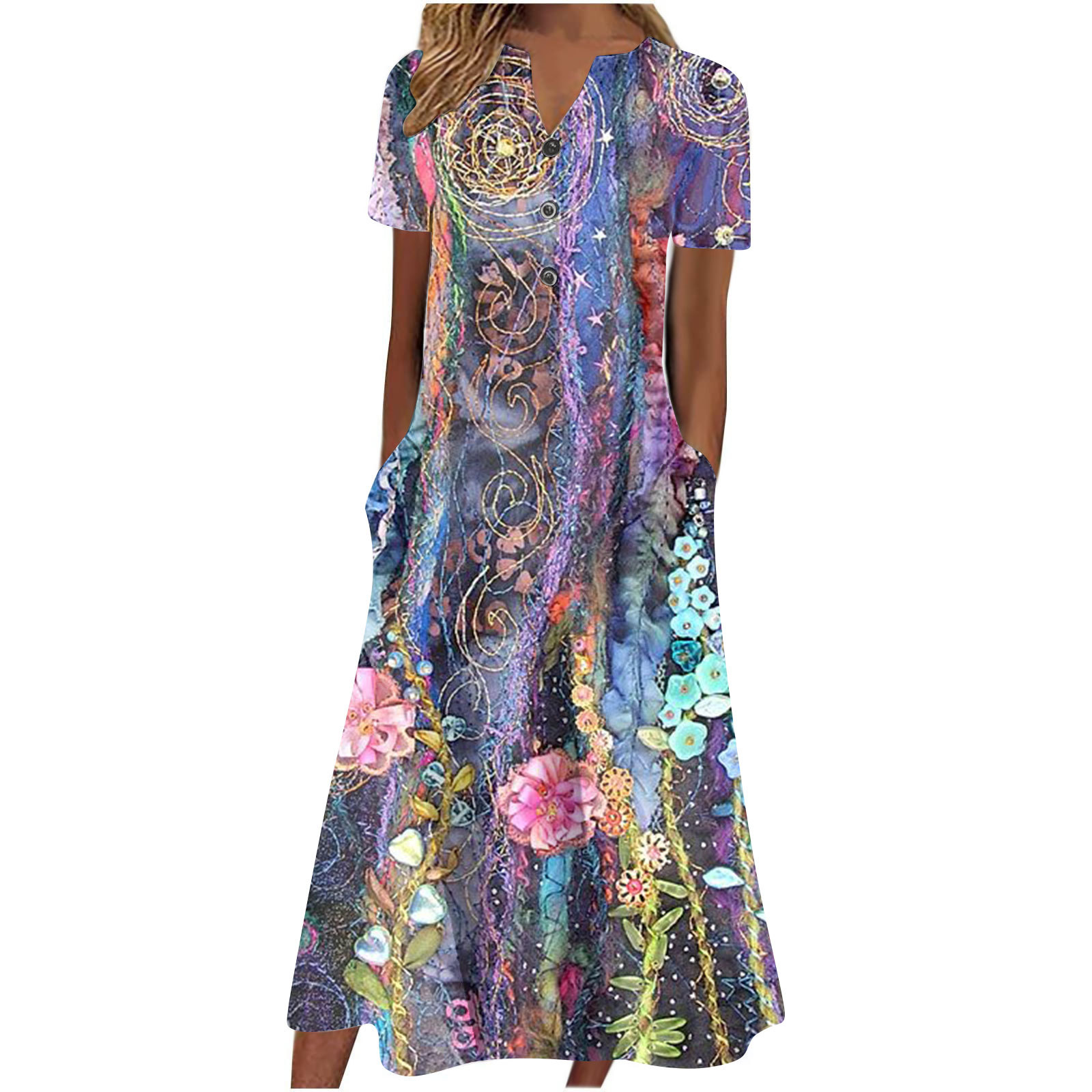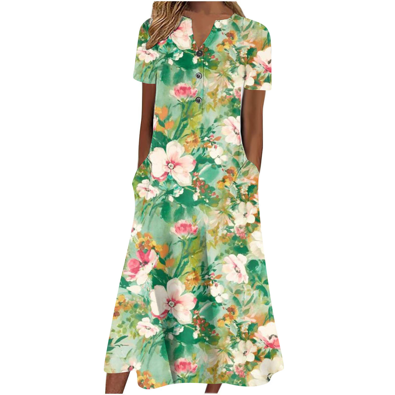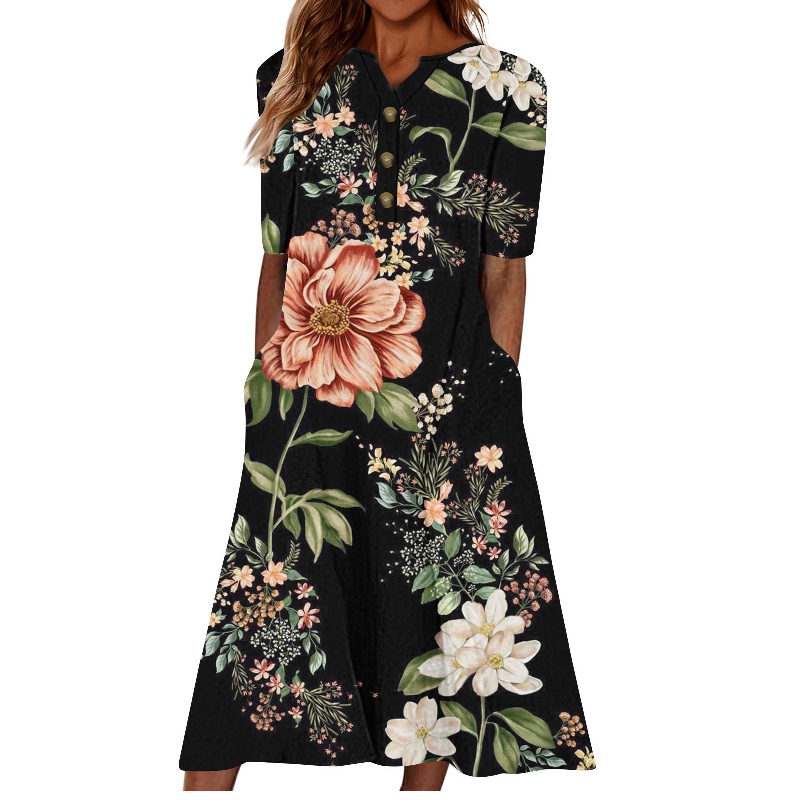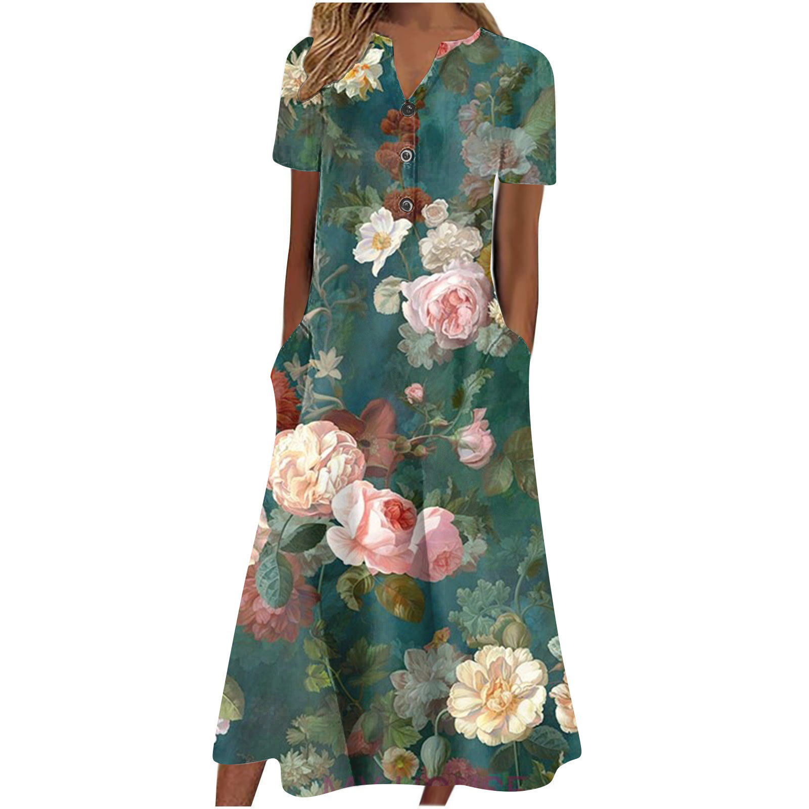 2024 아마존 유럽과 미국 국경 여성 여름 새로운 V 넥 버튼 짧은 소매 느슨한 대형 스윙 인쇄 원피스스토어 가기