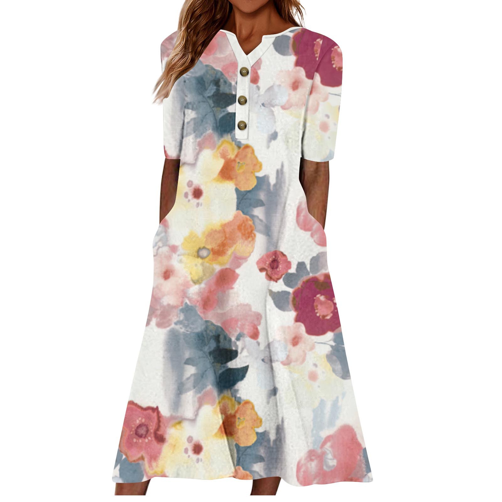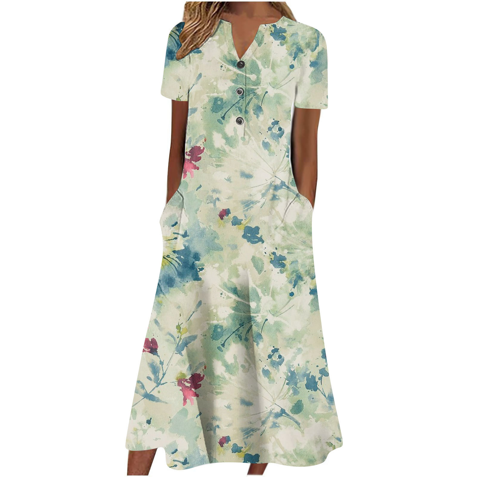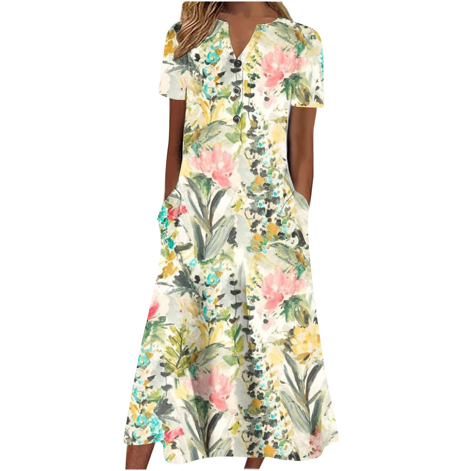 2024 아마존 유럽과 미국 국경 여성 여름 새로운 V 넥 버튼 짧은 소매 느슨한 대형 스윙 인쇄 원피스스토어 가기