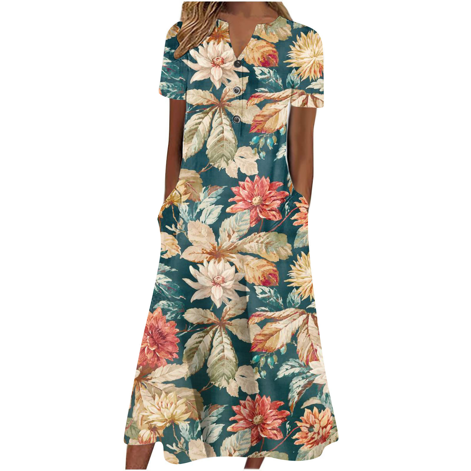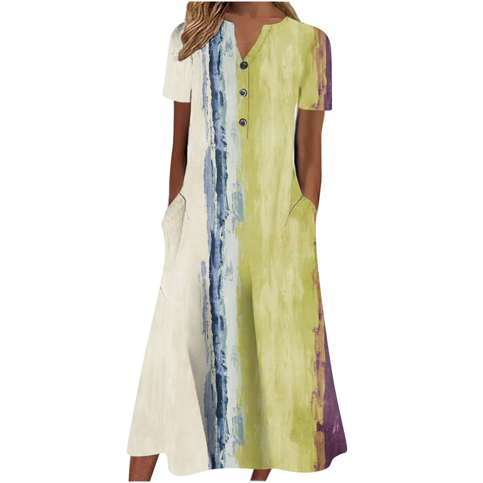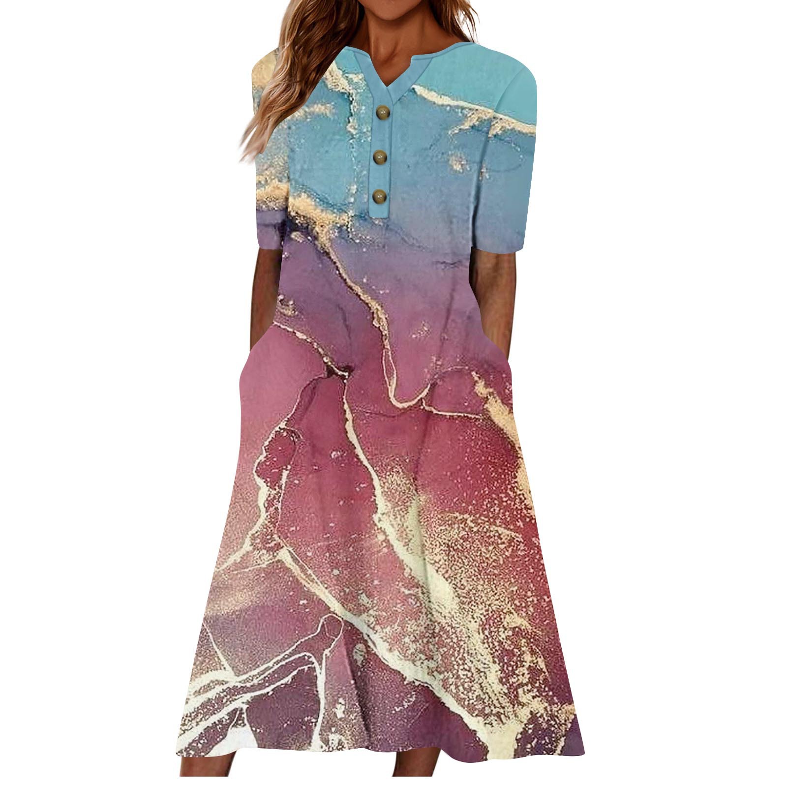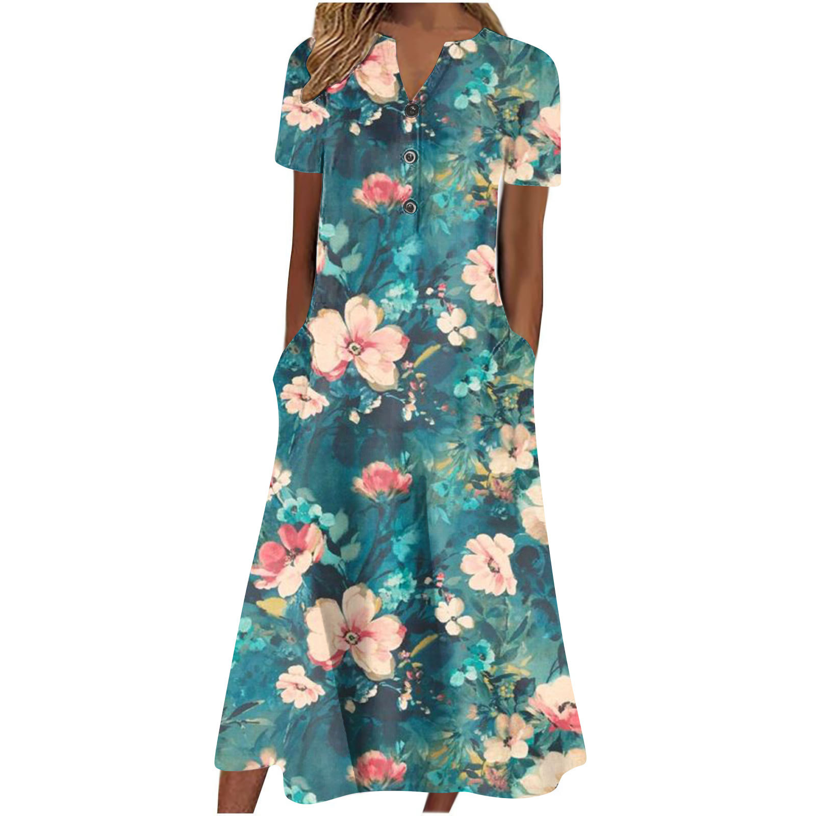 2024 아마존 유럽과 미국 국경 여성 여름 새로운 V 넥 버튼 짧은 소매 느슨한 대형 스윙 인쇄 원피스스토어 가기