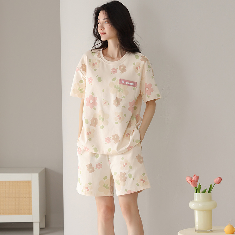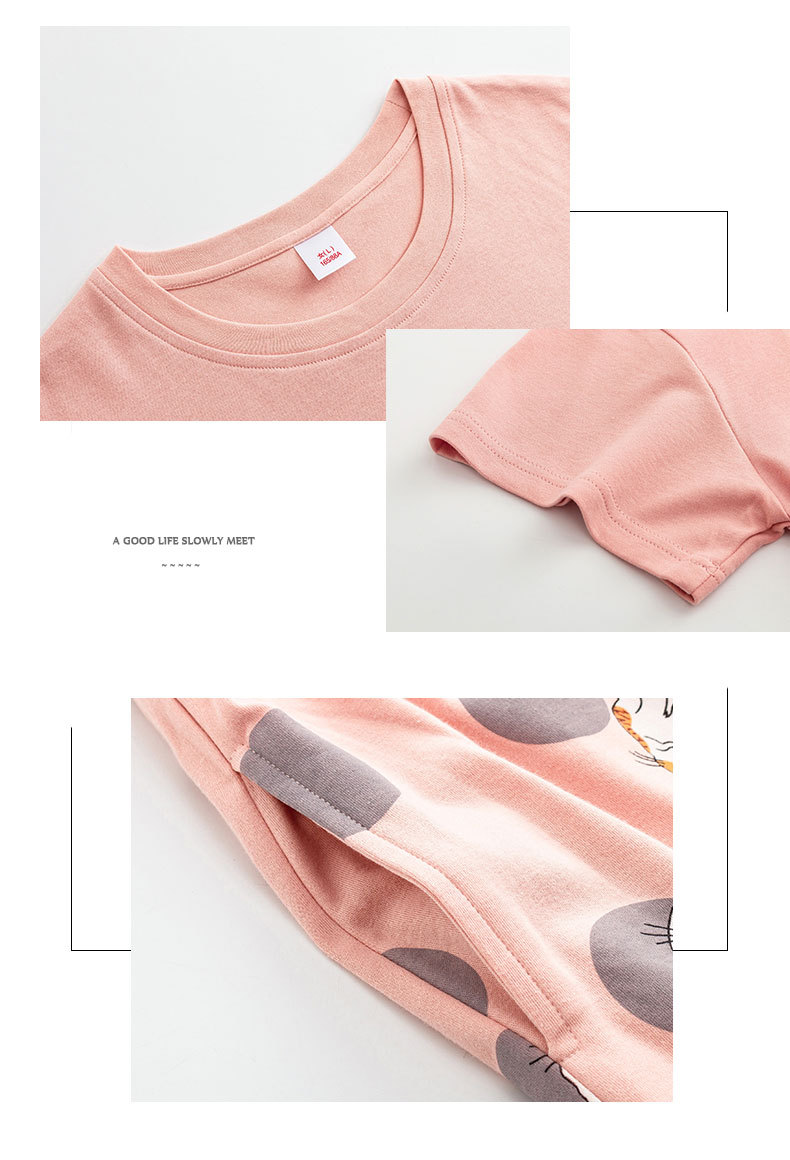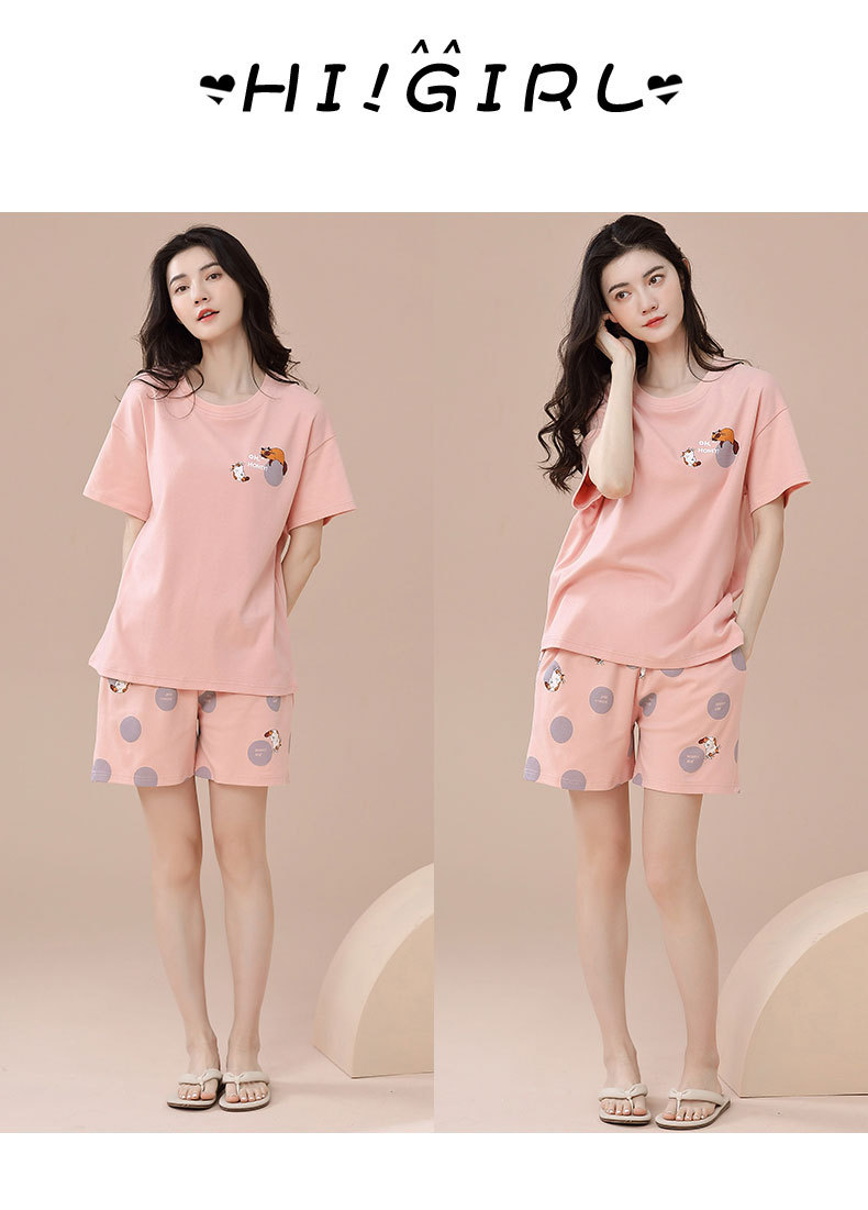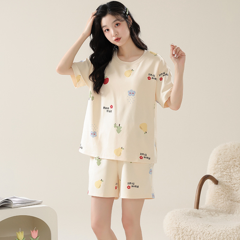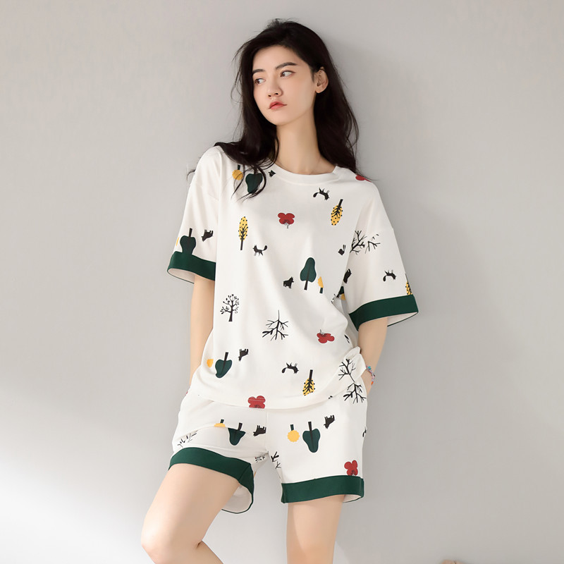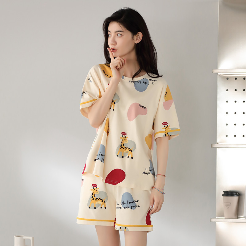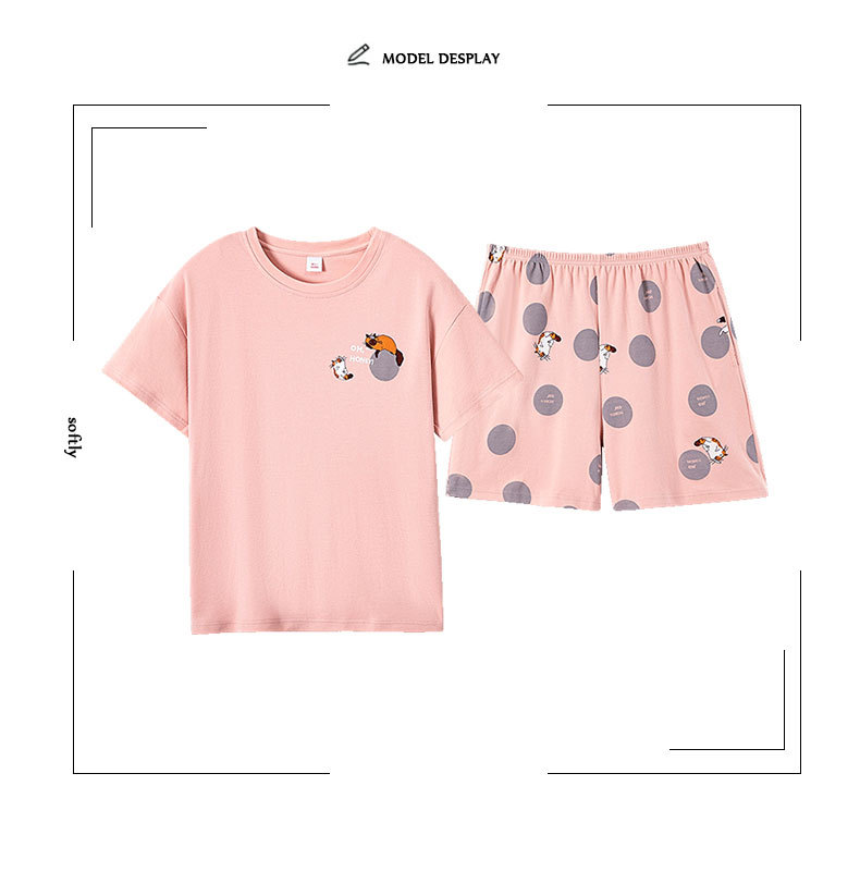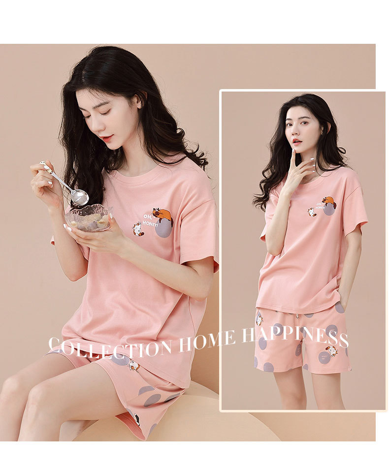 100% 면 잠옷 여성 여름 순면 얇은 라운드 넥 반팔 반바지 귀여운 여름 면 홈웨어 세트스토어 가기