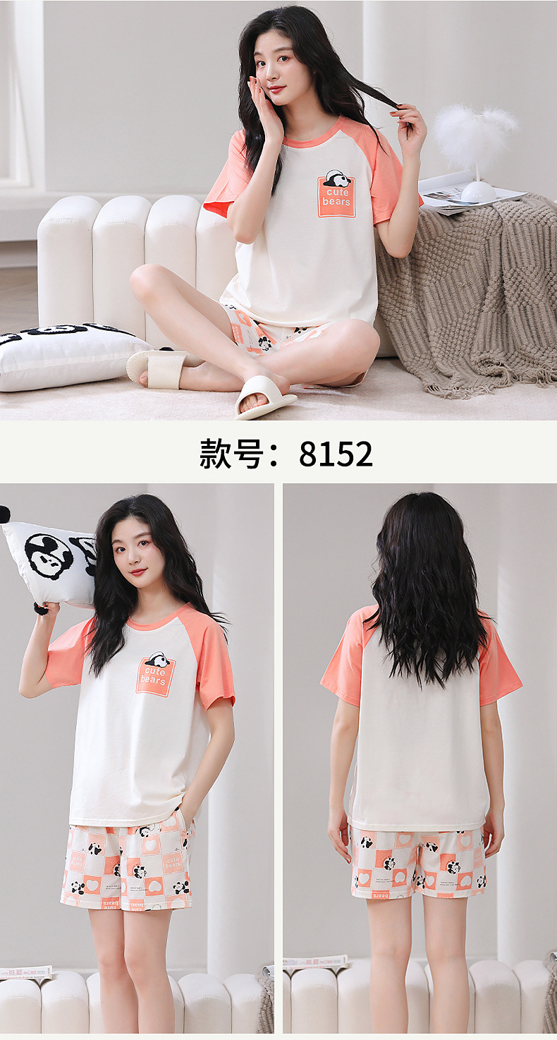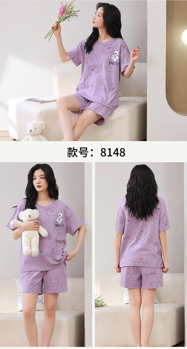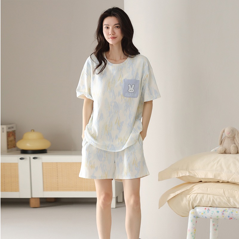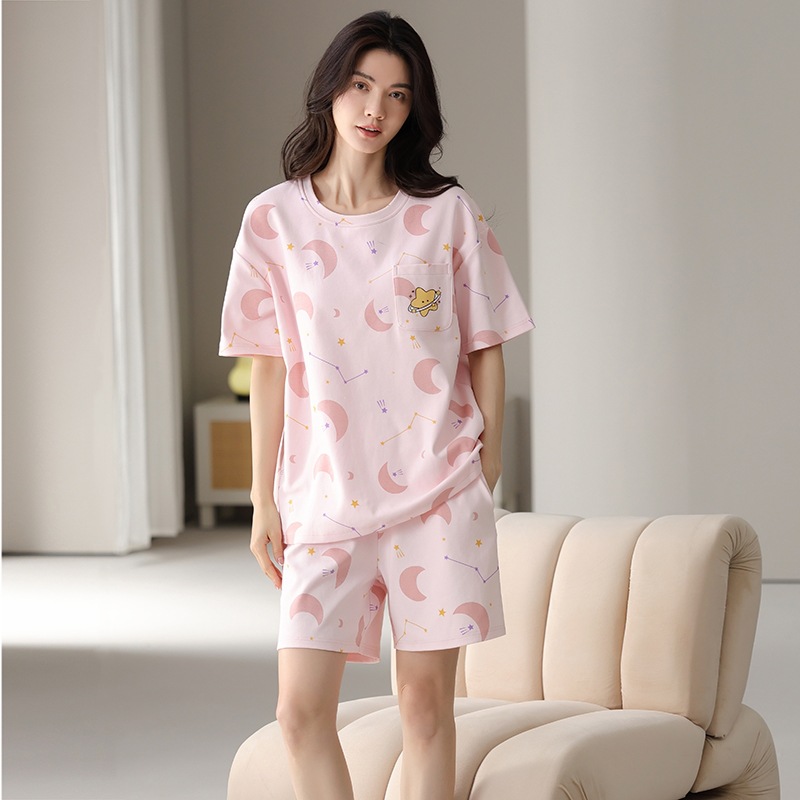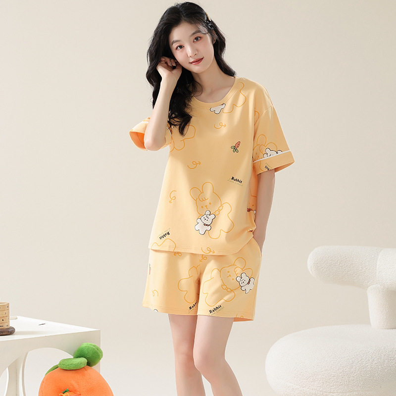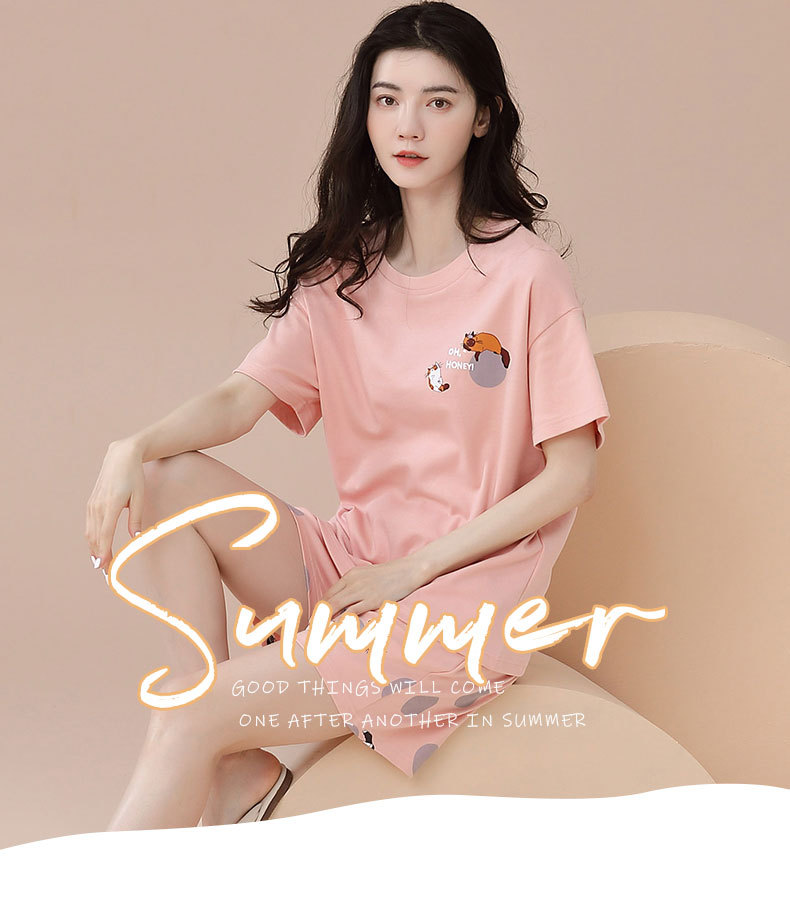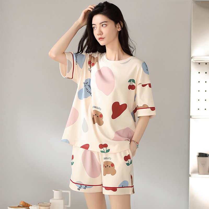 100% 면 잠옷 여성 여름 순면 얇은 라운드 넥 반팔 반바지 귀여운 여름 면 홈웨어 세트스토어 가기
