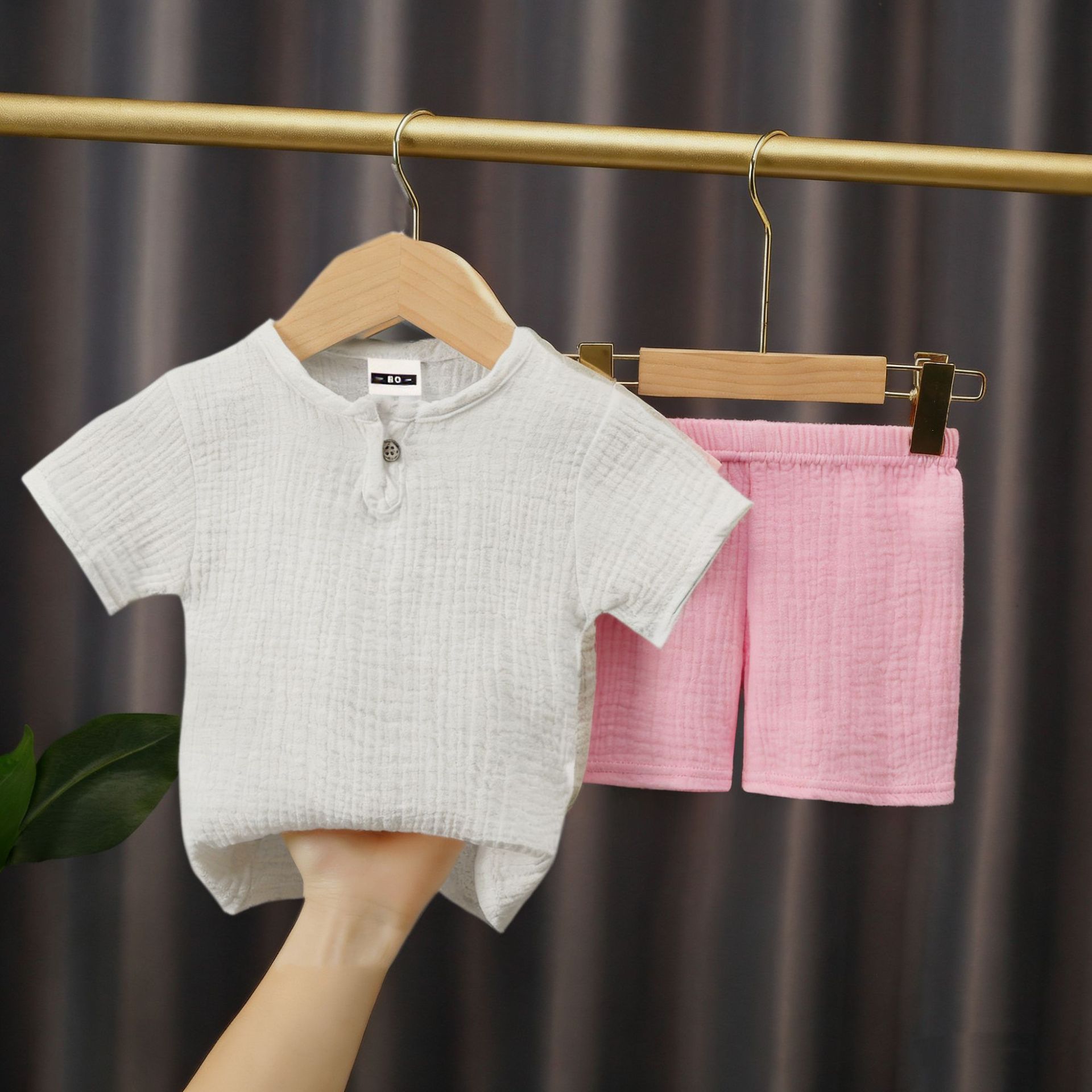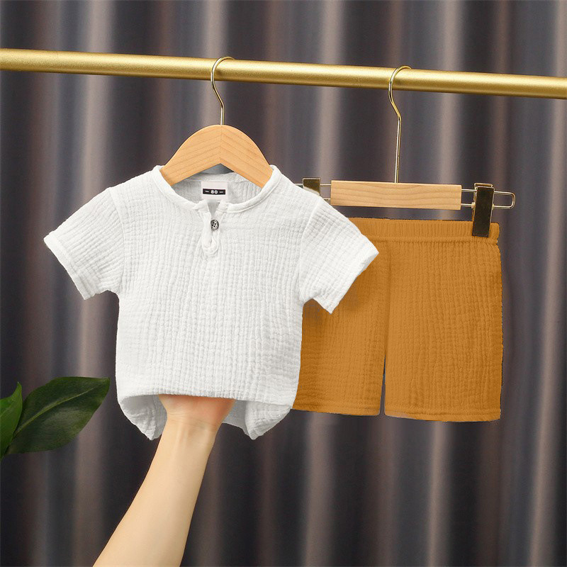 어린이 여름 면 린넨 반팔 반바지 세트 아기 단색 더블 레이어 면 거즈 중국 스타일 느슨한 투피스 세트