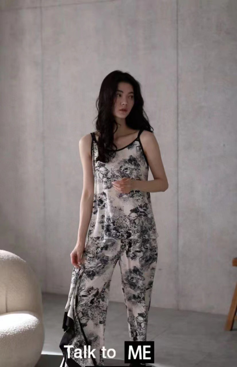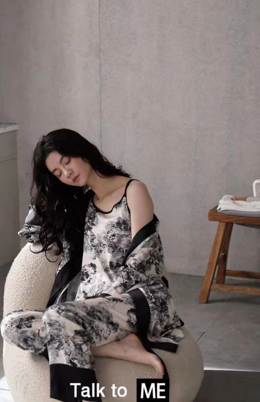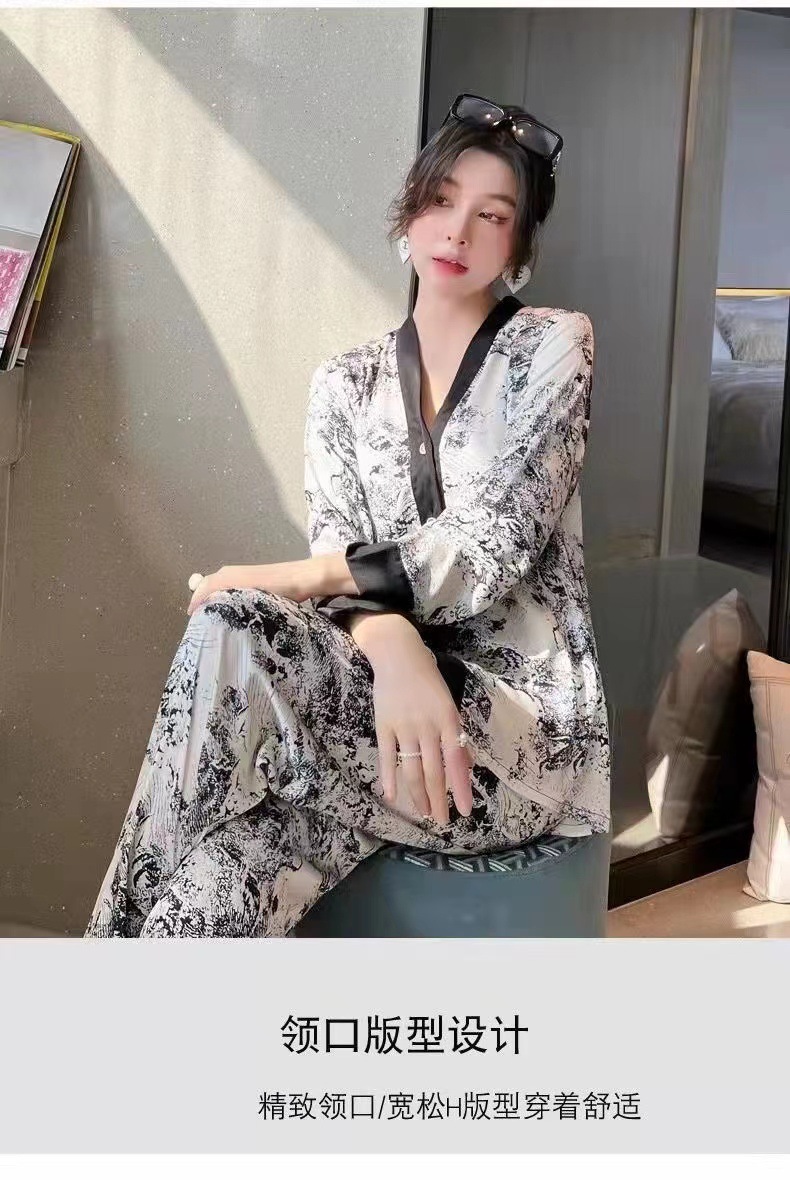 국가 유행 스타일 잉크 페인팅 얼음 실크 가정 옷 4 종 세트 여자의 여름 새로운 패션 인쇄 느슨한 플러스 사이즈 잠옷 세트