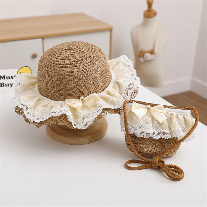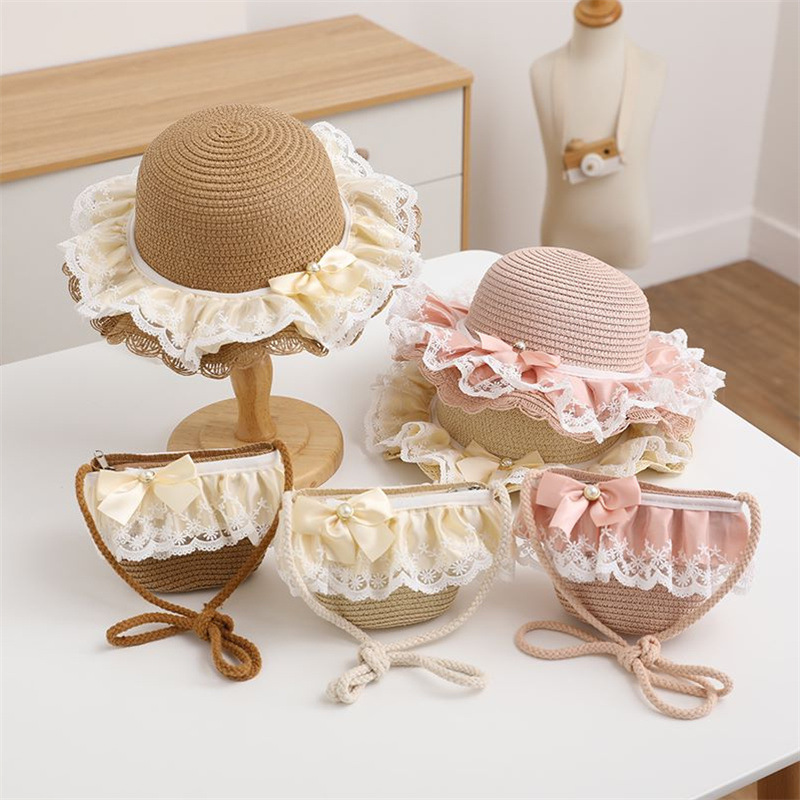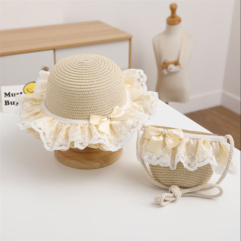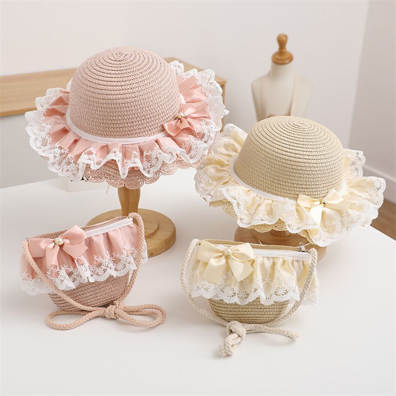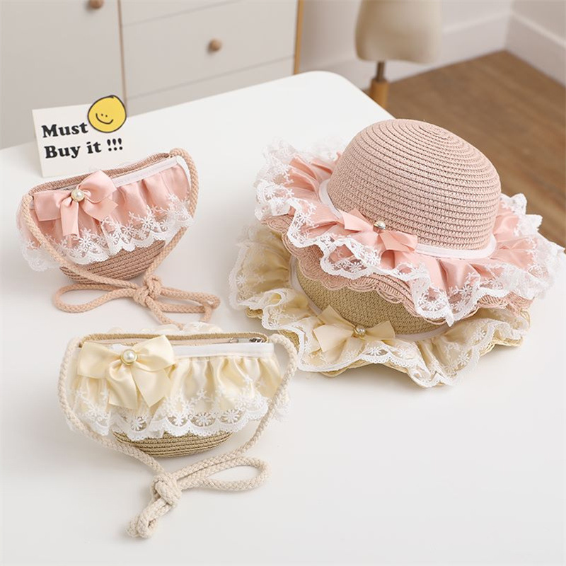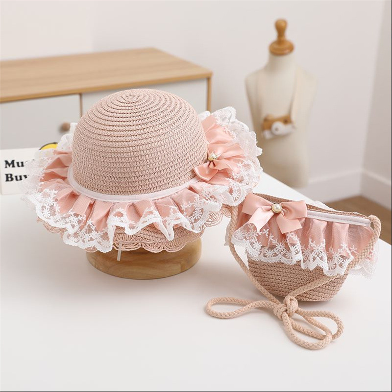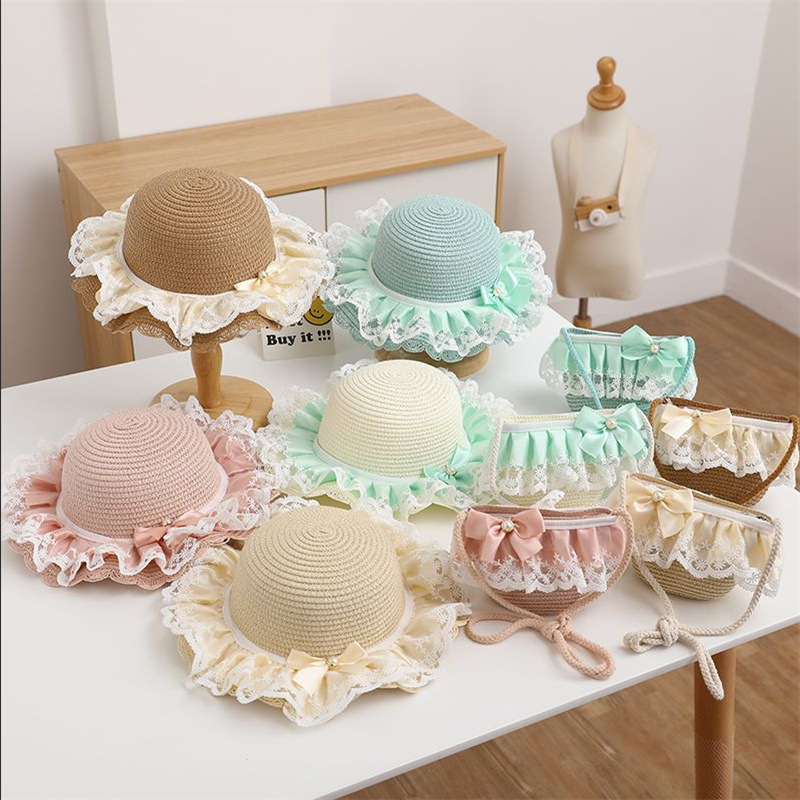 어린이 여자의 여름 자외선 차단제 모자 공주 모자 해변 접는 태양 모자 어부 모자 밀짚 모자 가방 세트