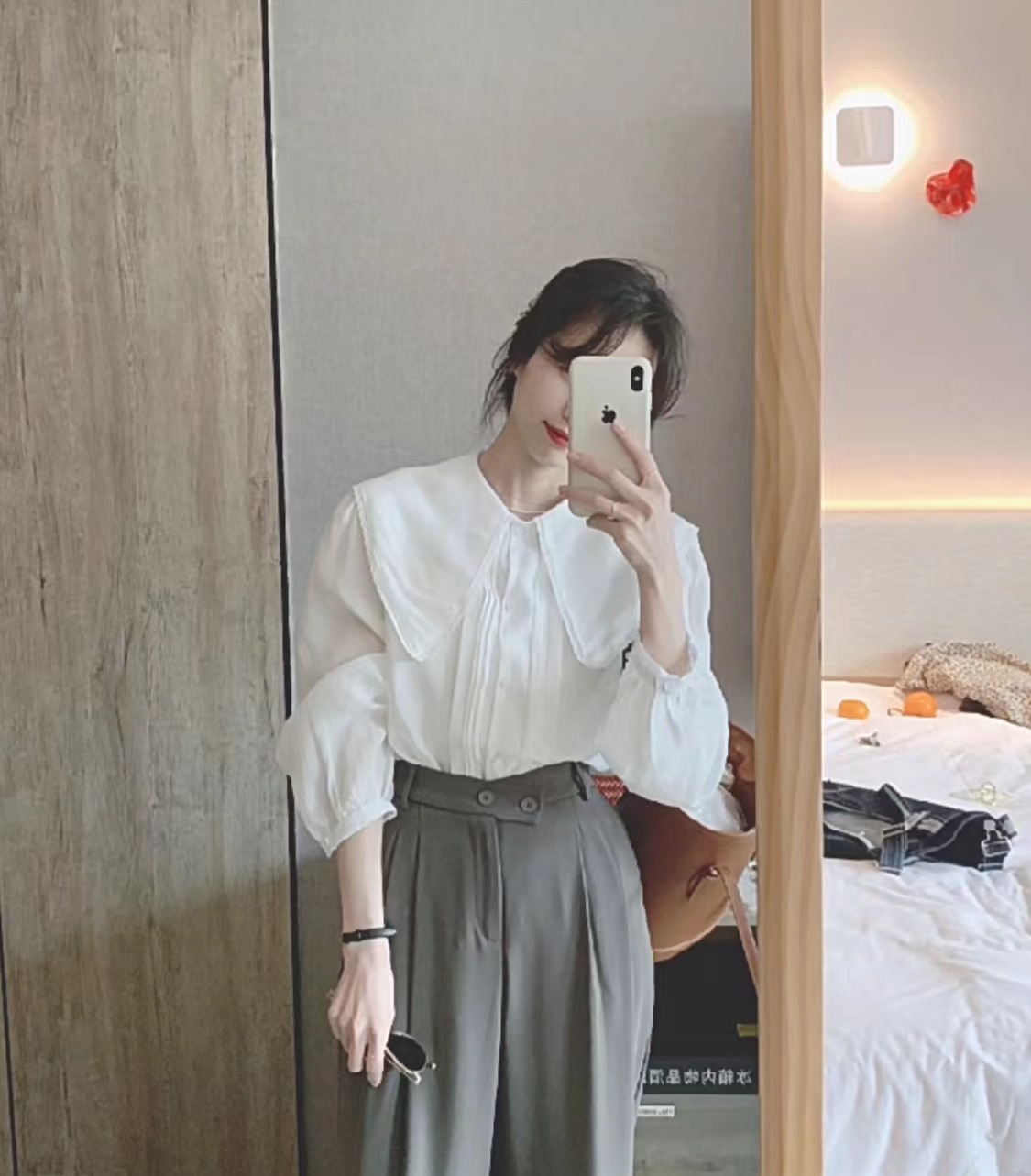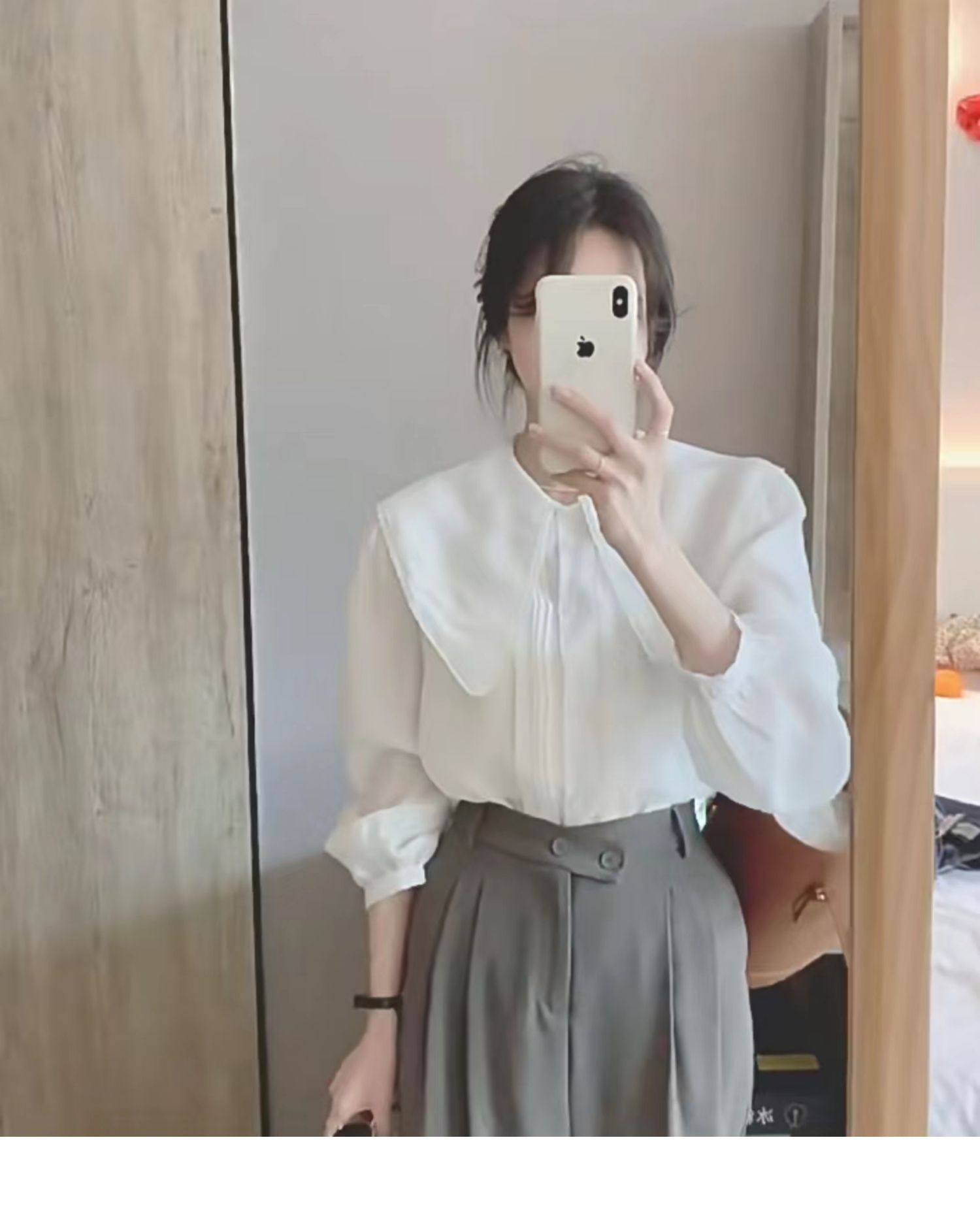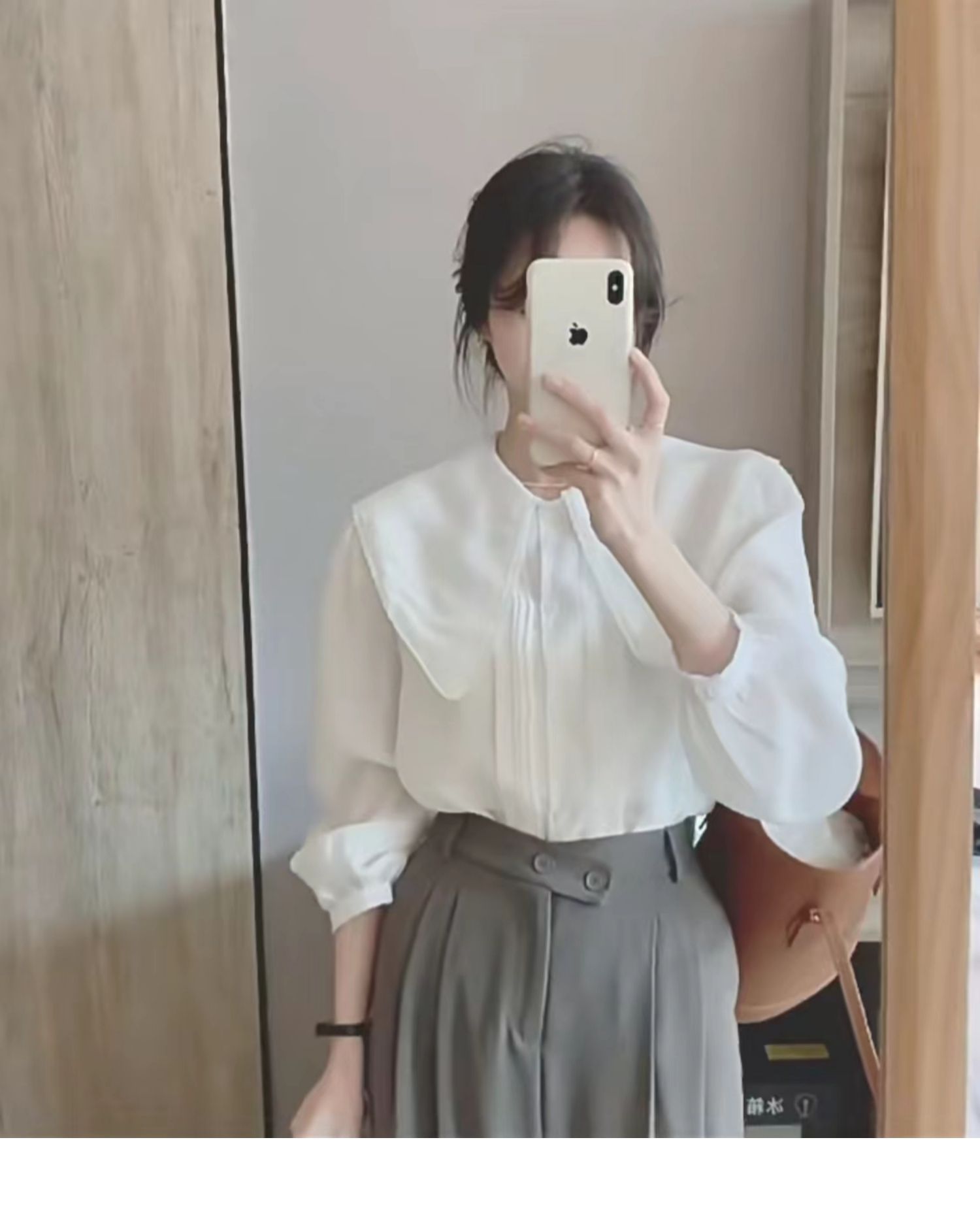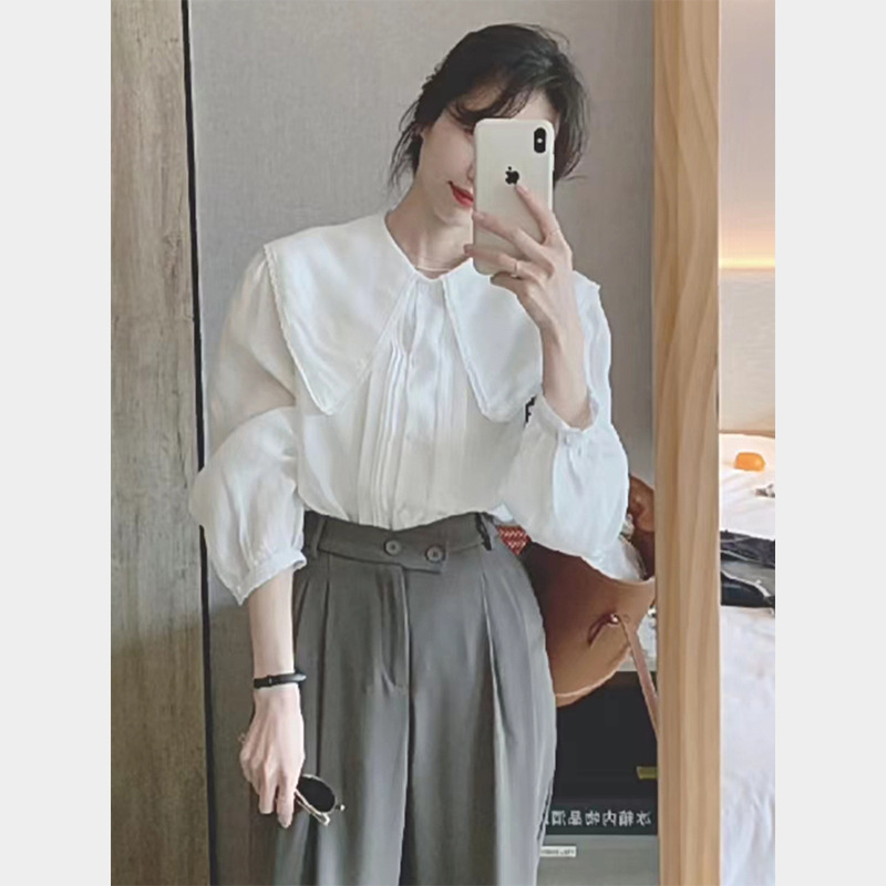 여성을위한 봄 옷 2023 새로운 흰색 옷깃 셔츠 프렌치 퍼프 슬리브 탑 스위트 인형 칼라 쉬폰 셔츠스토어 가기
