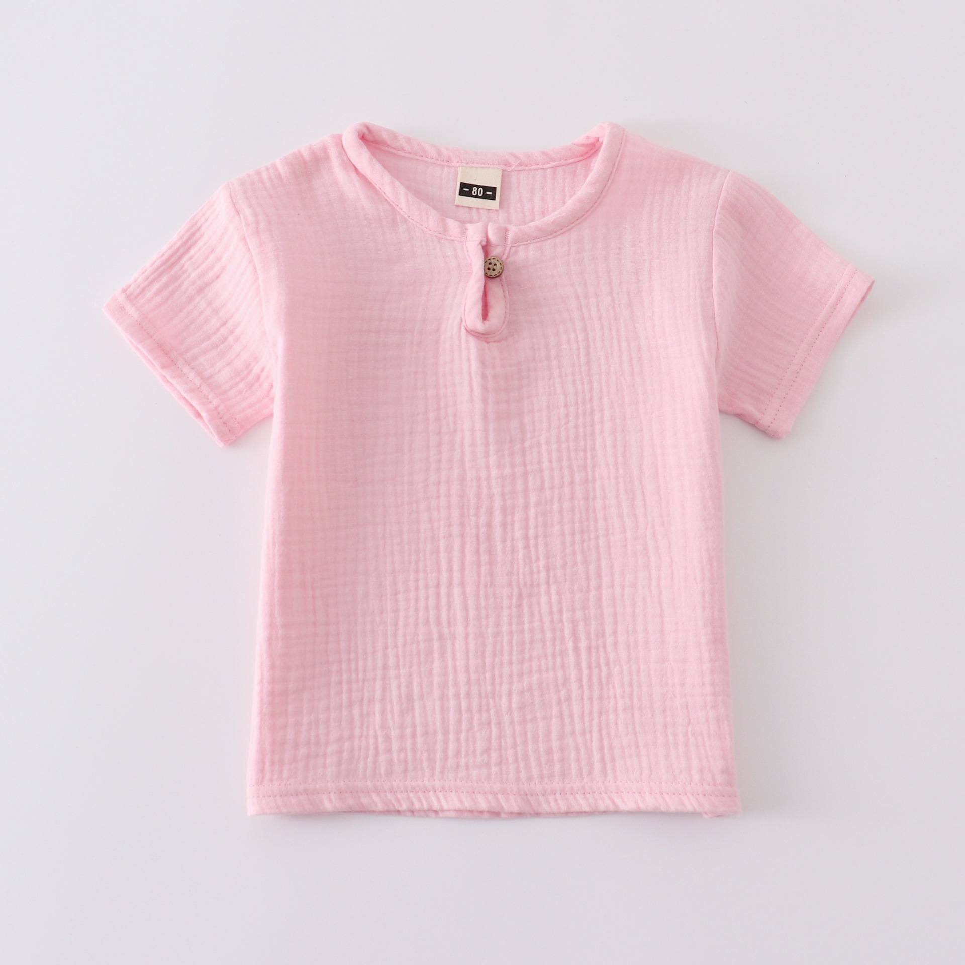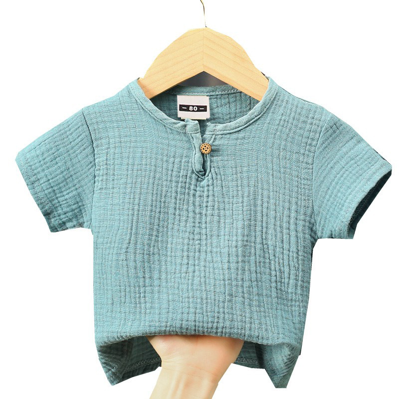 어린이 여름 얇은면과 린넨 반팔 티셔츠 아기의 단색 더블 레이어 코튼 거즈 라운드 넥 느슨한 풀오버 탑