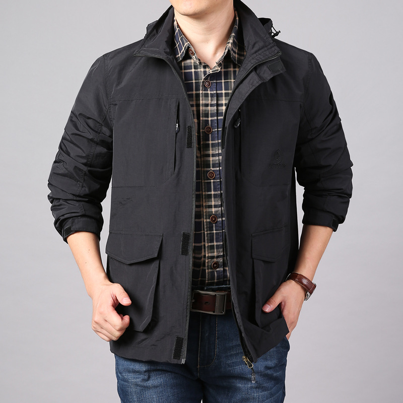 남성 봄과 가을 새로운 도착 코트 야외 느슨한 방풍 재킷 캐주얼 카디건 멀티 포켓 후드 자켓