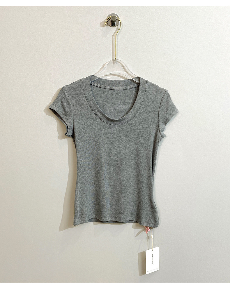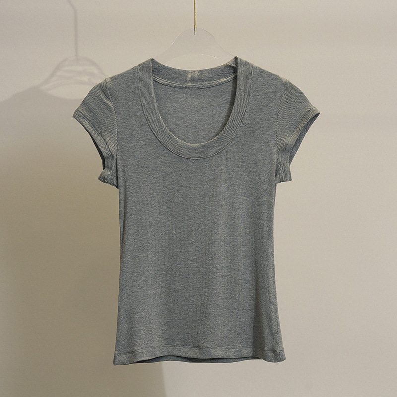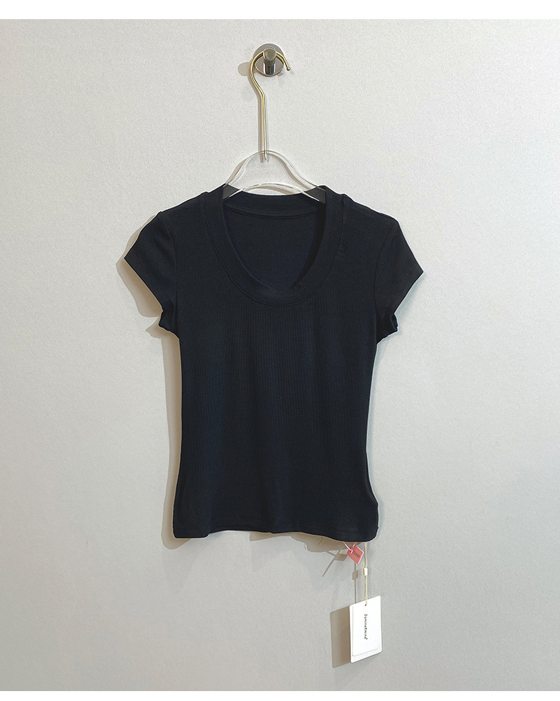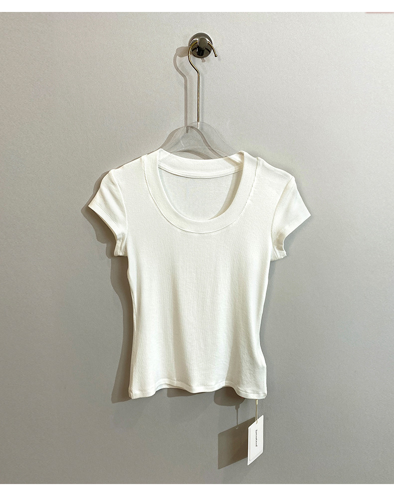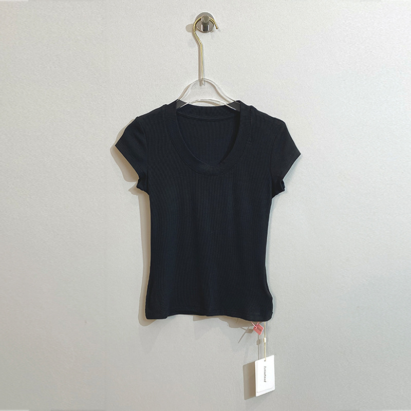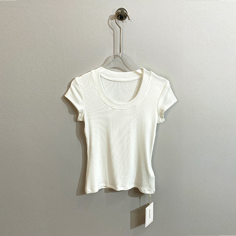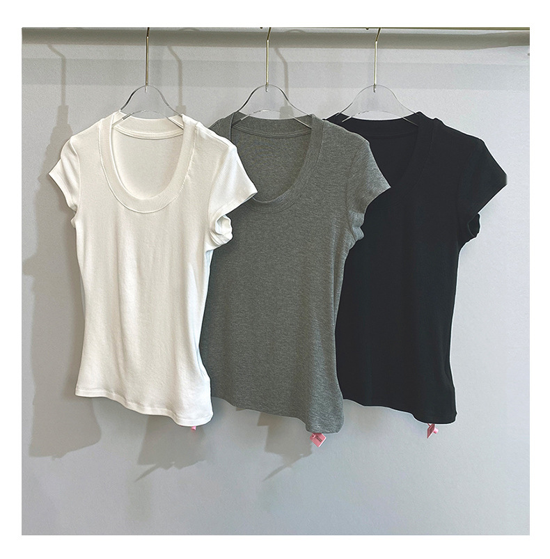 스팟 틈새 2024 여름 새 스타일 단순 솔리드 컬러 스레드 탄성 반팔 슬림 슬림 탑 티셔츠 여성용스토어 가기