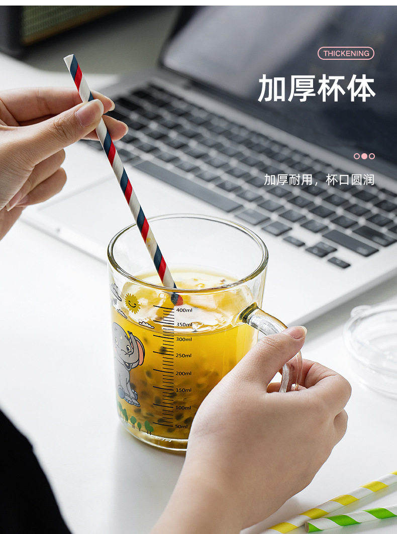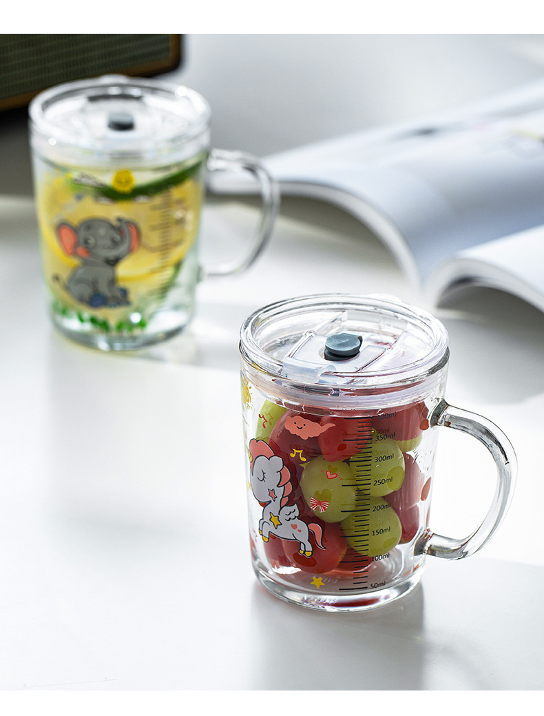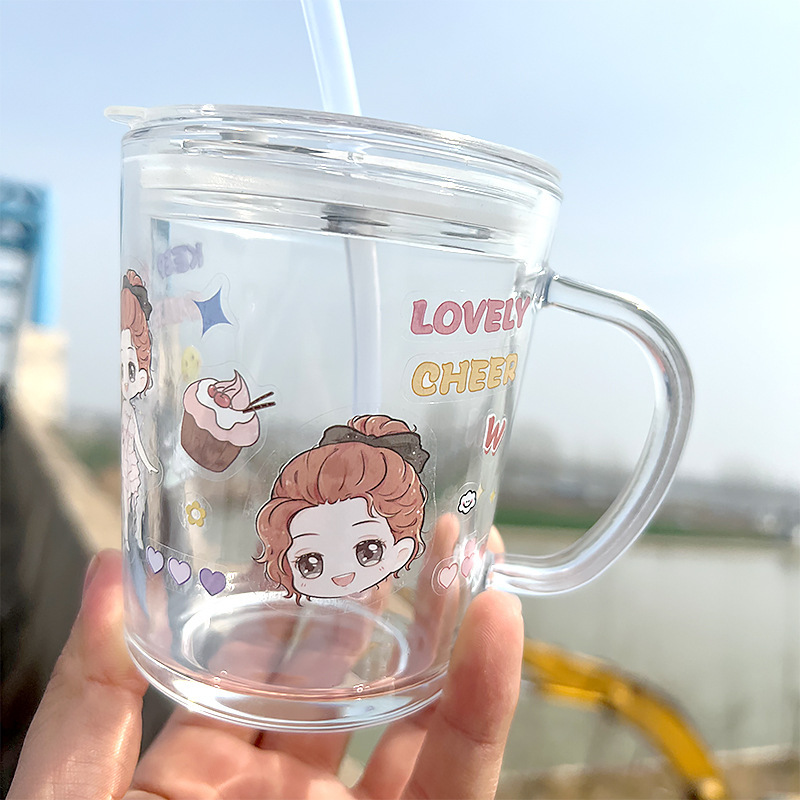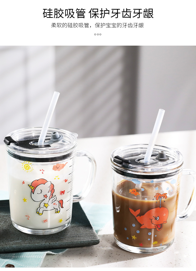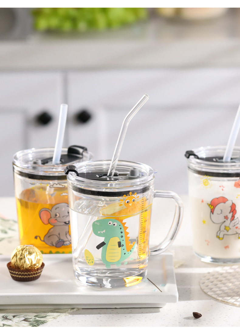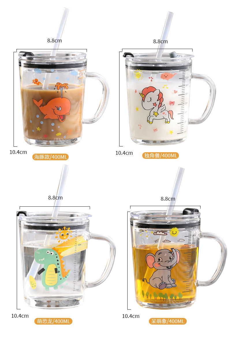 학생 아침 식사 가정용 손잡이가있는 도매 어린이 졸업 물 컵 우유 컵 만화 유리 빨대 분유 컵