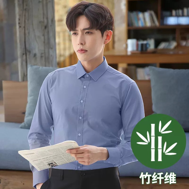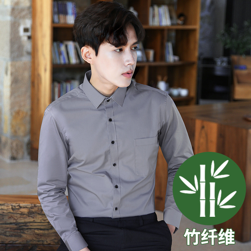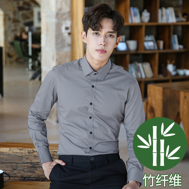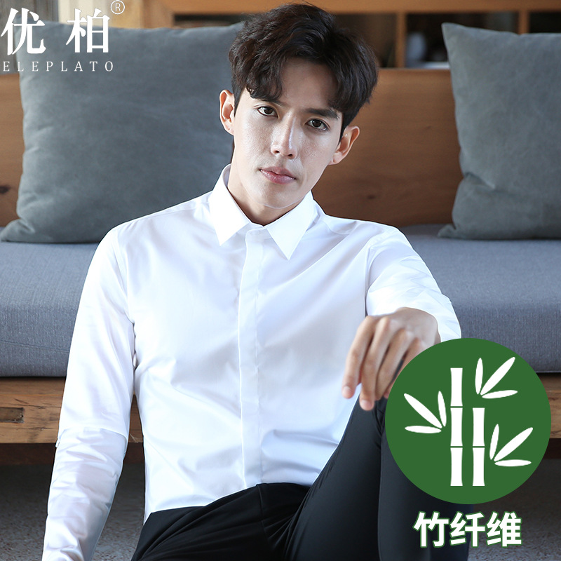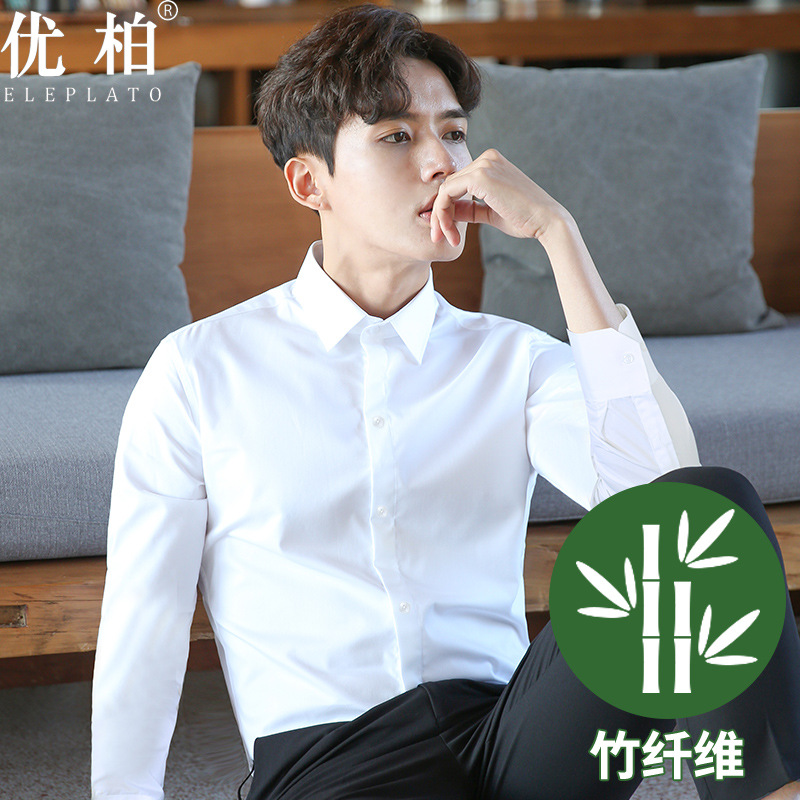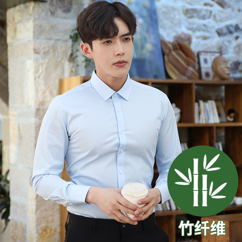 2024 봄 새 셔츠 남성 흰색 대나무 섬유 긴 소매 비 다림질 셔츠 남성 전문 원피스 머리카락 세대