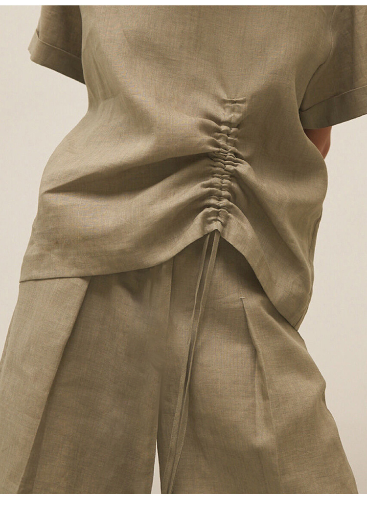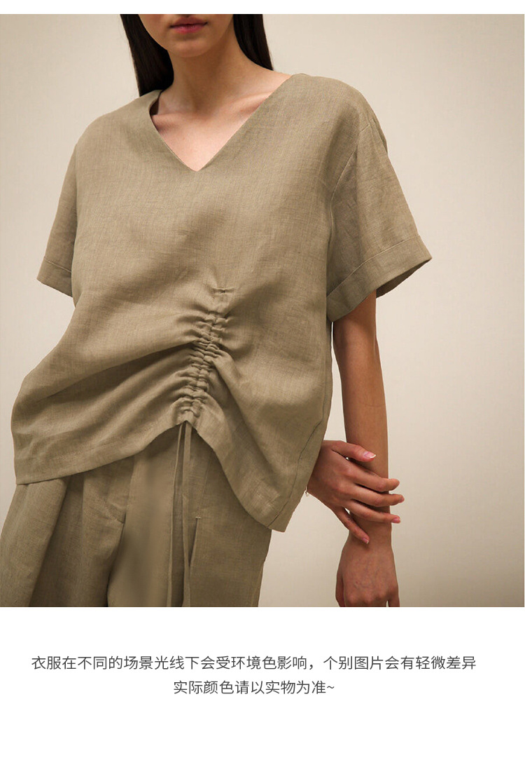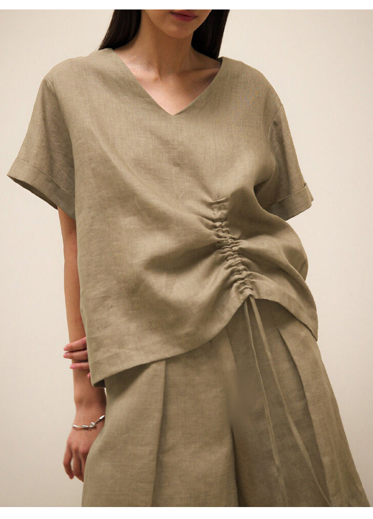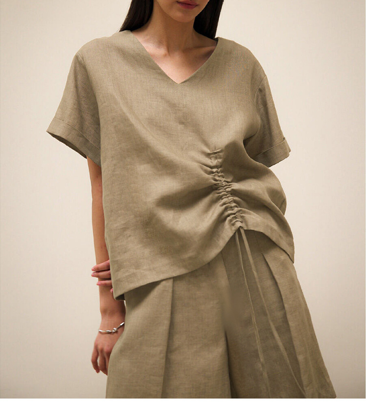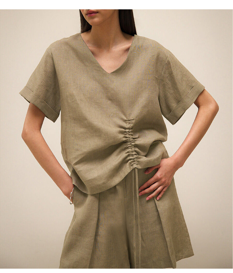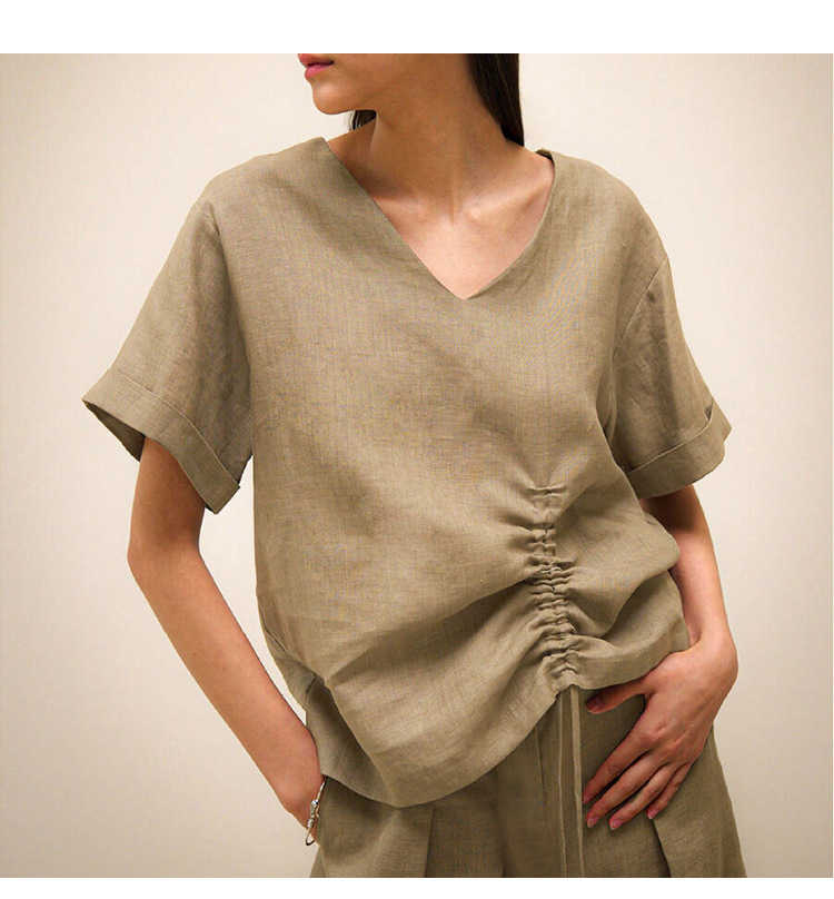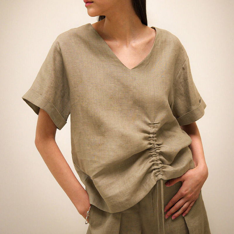 100 리넨 솔리드 컬러 브이넥 반팔 티셔츠 여름 신상품 밑단 드로스트링 게으른 통근 모든 경기 탑 여성
