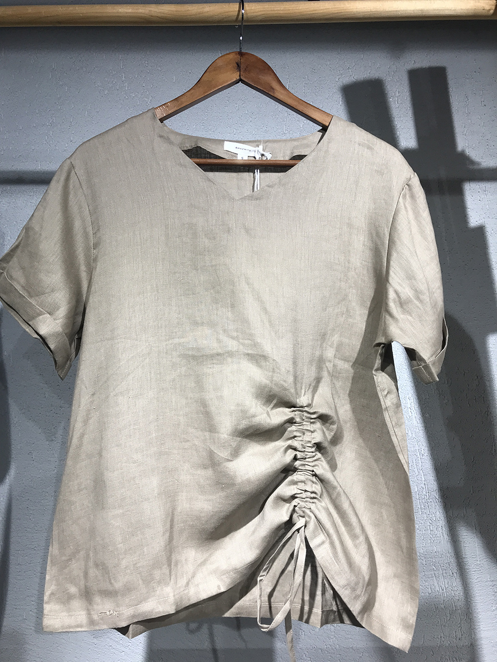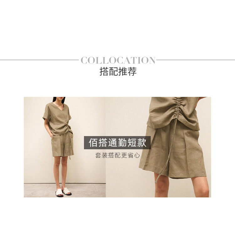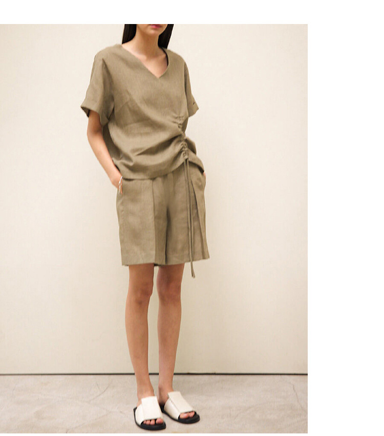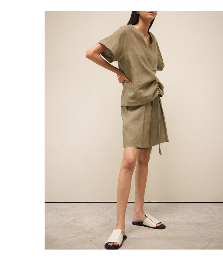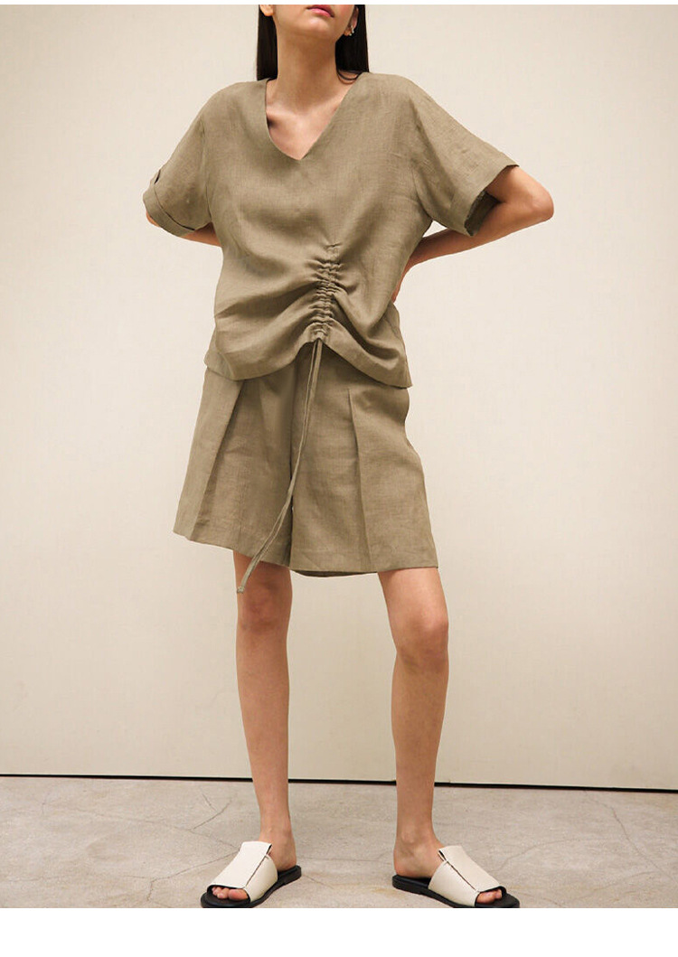 100 리넨 솔리드 컬러 브이넥 반팔 티셔츠 여름 신상품 밑단 드로스트링 게으른 통근 모든 경기 탑 여성스토어 가기