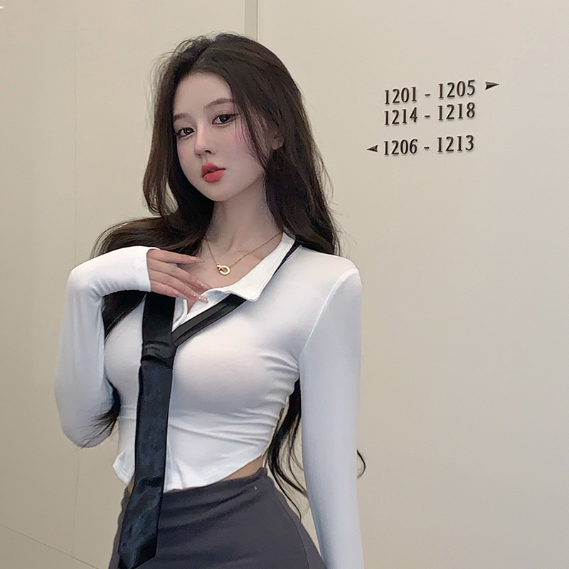 넥타이 스파이스 소녀 슬림 긴 소매 티셔츠 여성의 폴로 칼라 재킷 + 짧은 순수 소원 엉덩이 스커트 세트스토어 가기