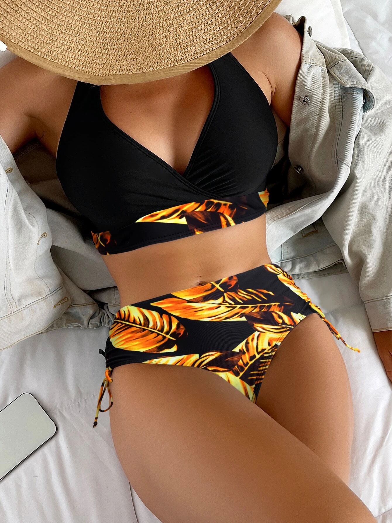 2023 유럽 및 미국 대외 무역 수영복 여성용 스플릿 하이 웨이스트 삼각형 레이스 업 인쇄 단색 스티칭 인터넷 연예인 AliExpress 수영복