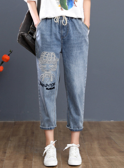 일본 민족 스타일 플러스 사이즈 데님 자른 바지 찢어진 자수 꽃과 새 여성의 청바지 느슨한 슬리밍 모든 매치스토어 가기