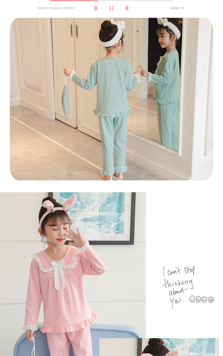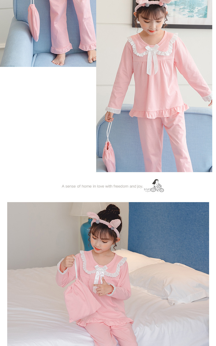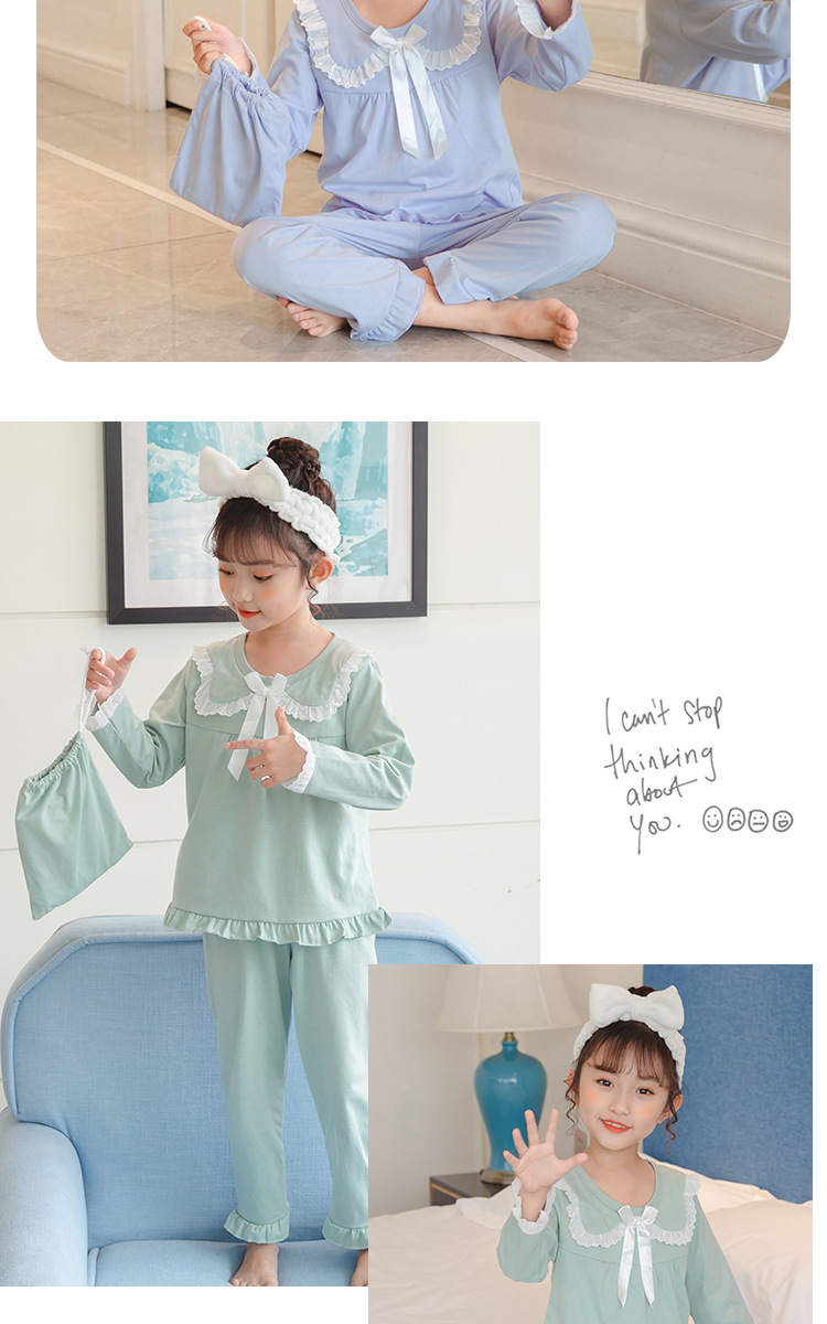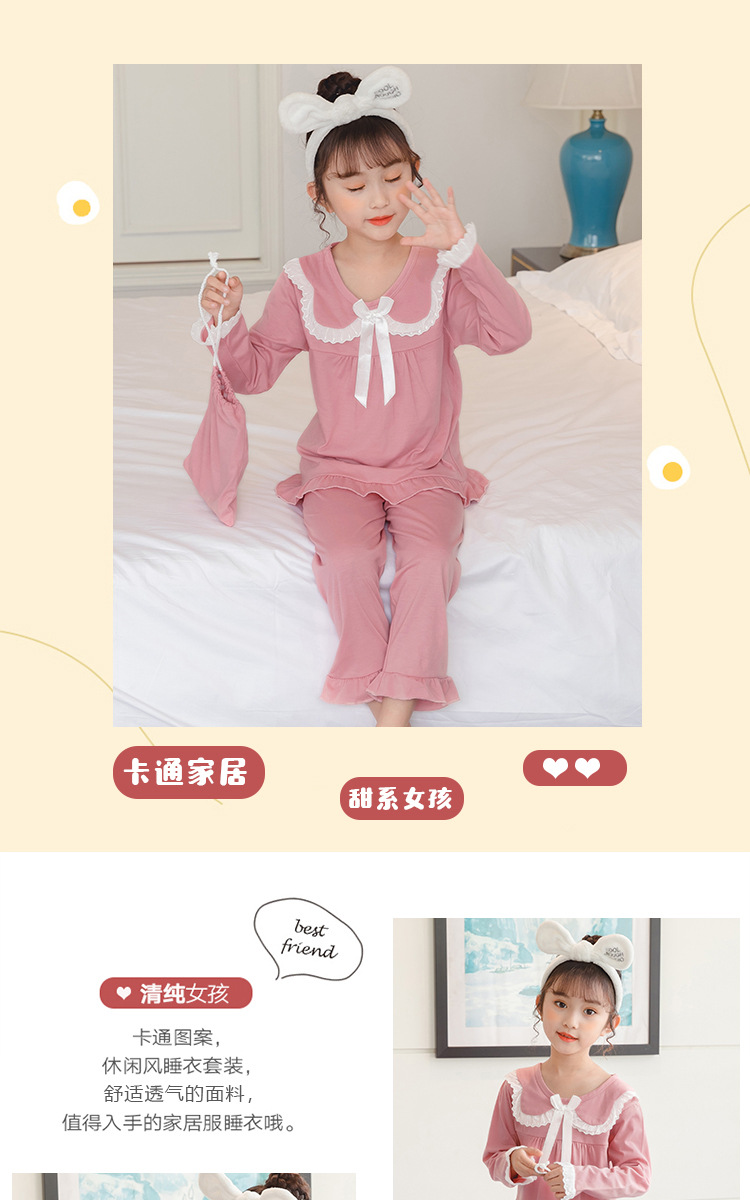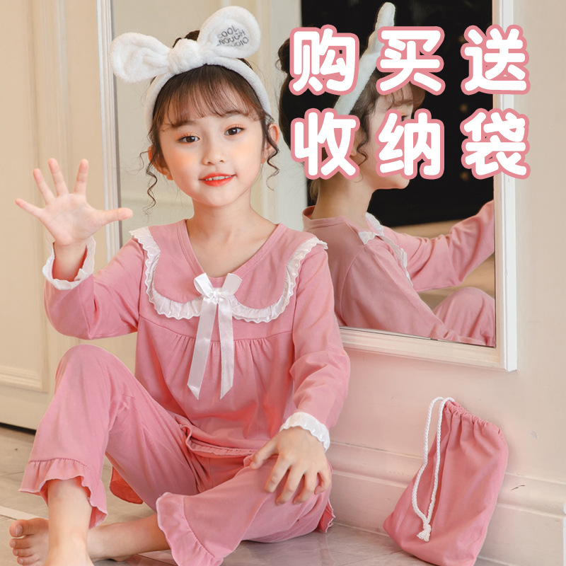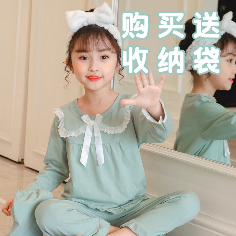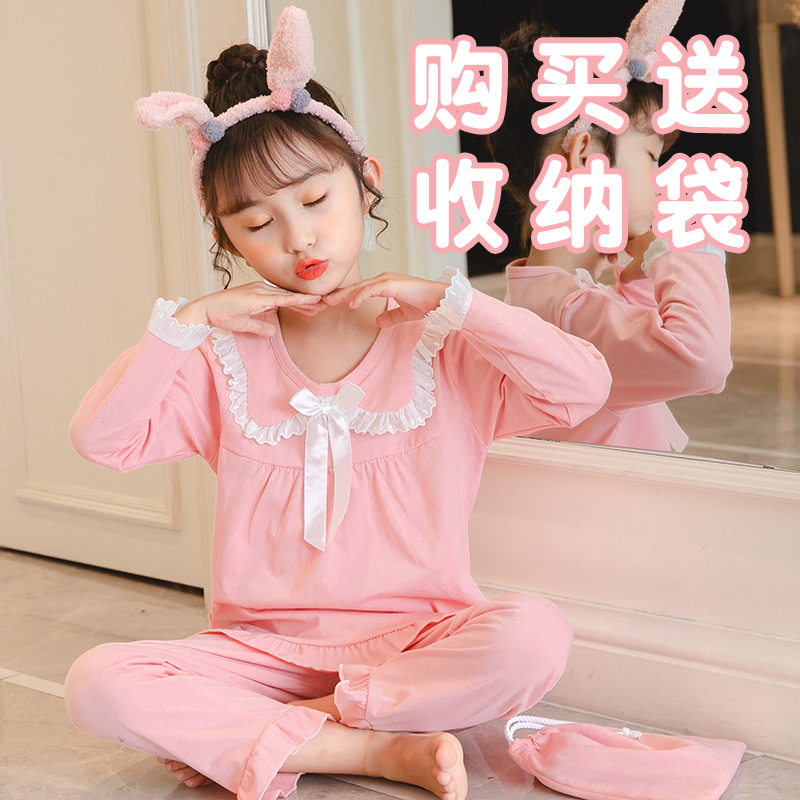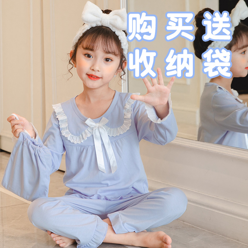 어린이 잠옷 소녀 봄과 가을 여름 새로운 단색 면 귀여운 긴 소매 세트 소녀 잠옷 어린이 의류 공주 스타일스토어 가기