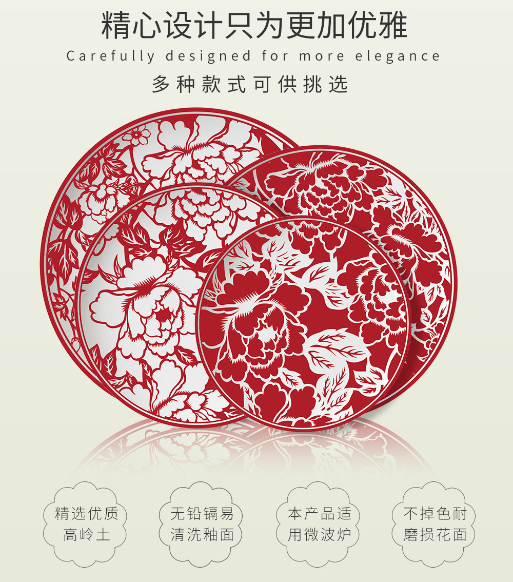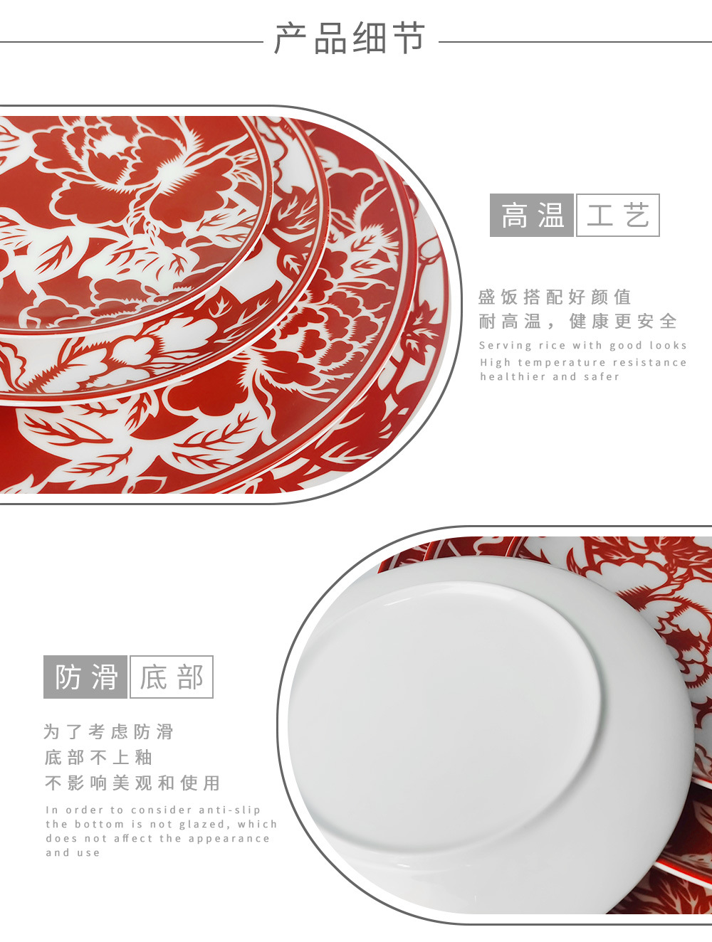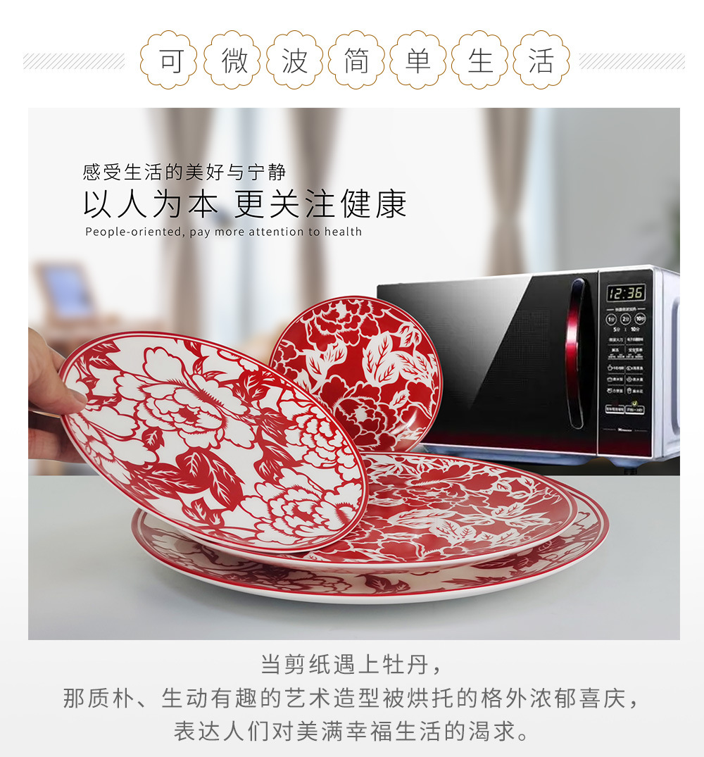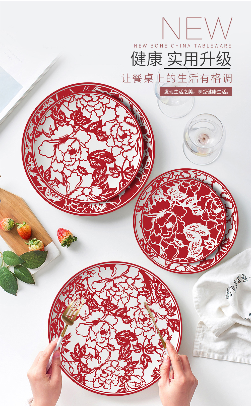 중국 스타일 종이 컷 모란 축제 웨딩 본 중국 세라믹 디너 플레이트 호텔 레스토랑 과일 스테이크 플레이트 결혼 선물