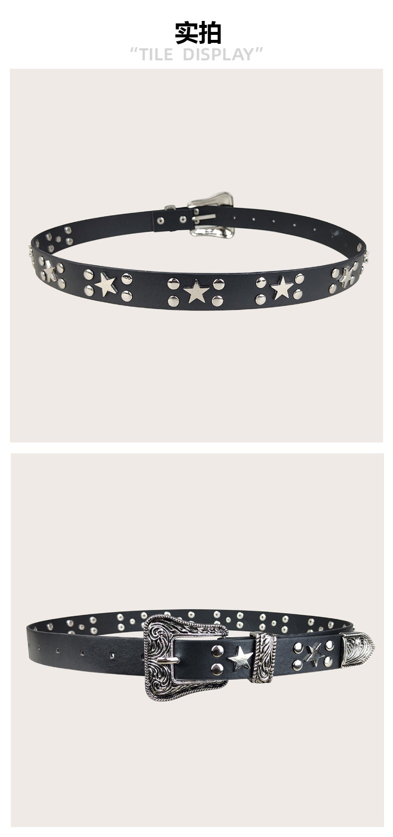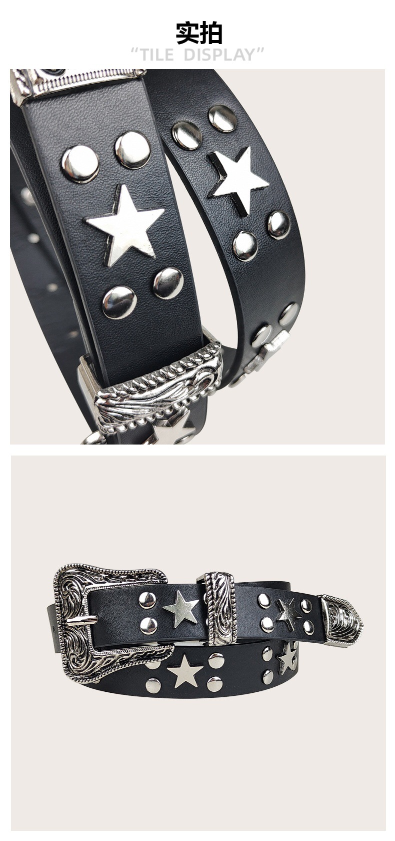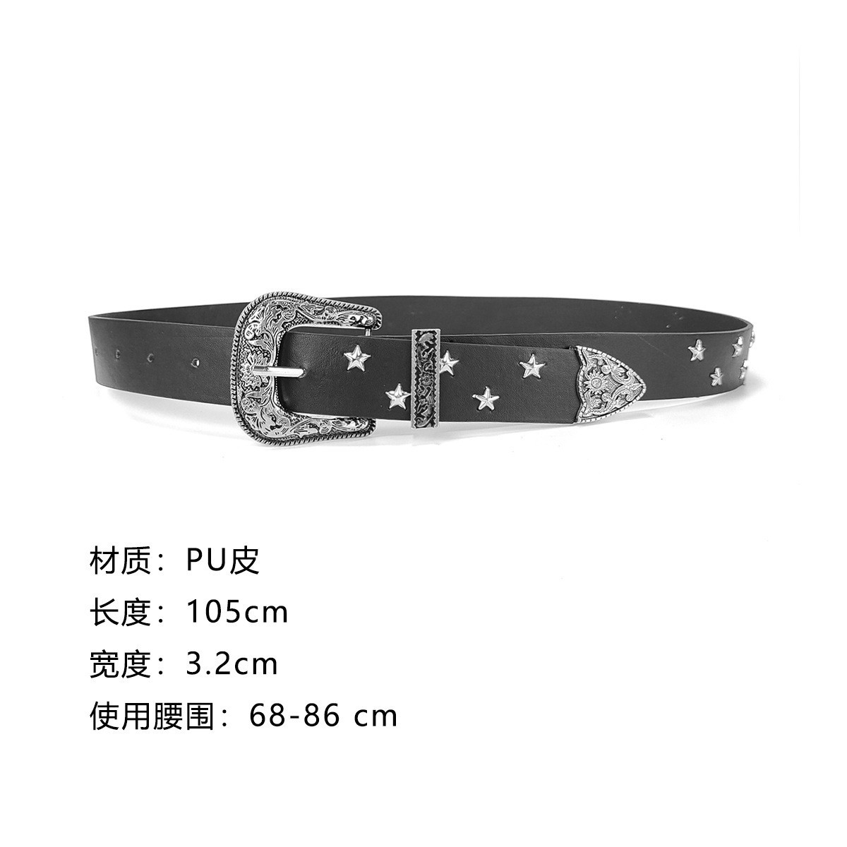 크로스보더 인기 펑크 스타일 오각별 여성용 벨트 디자인 리벳 질감 벨트 도매 조각 버클 PU스토어 가기
