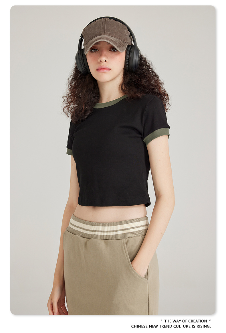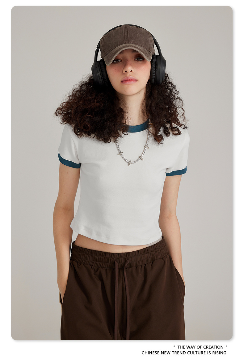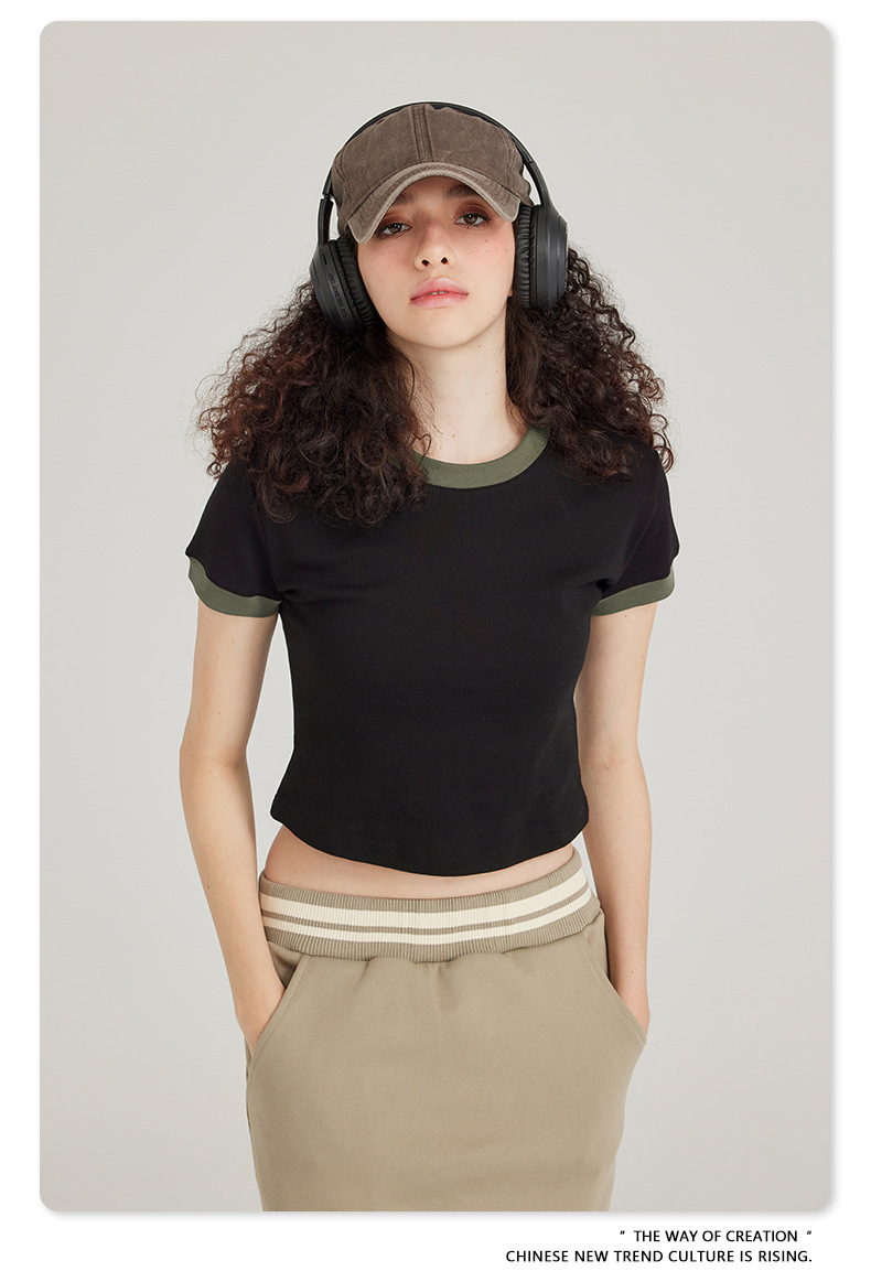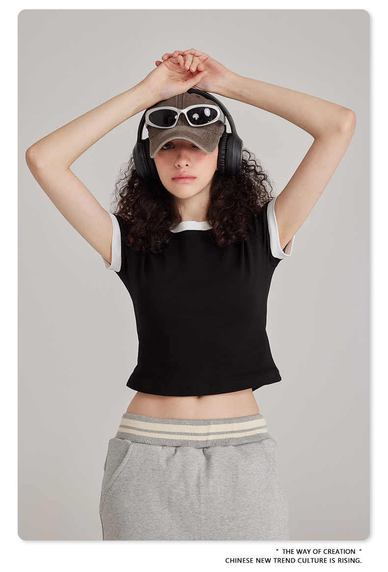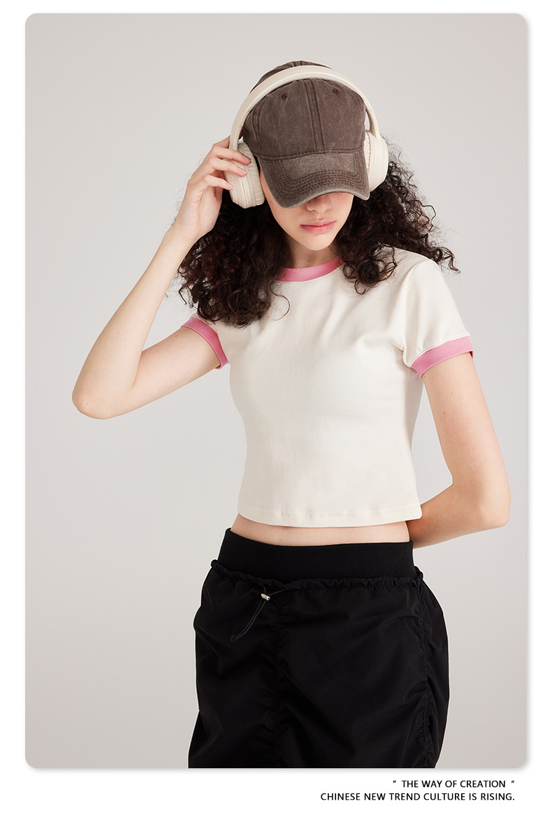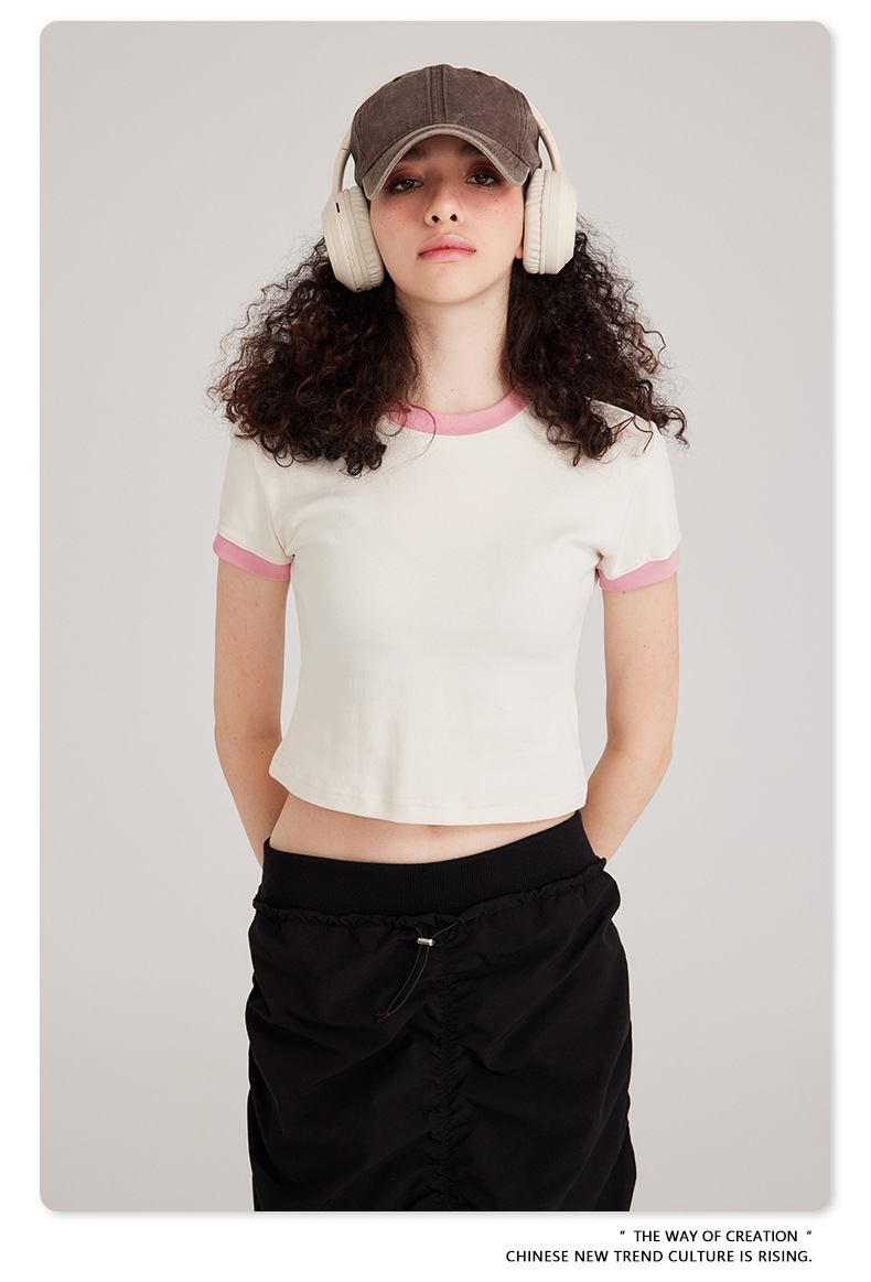 BE 여성 의류 여름 미국 복고풍 대비 색상 라운드 넥 반팔 핫 소녀 짧은 기능 배꼽 노출 오른쪽 어깨 티셔츠 트렌디 브랜드스토어 가기