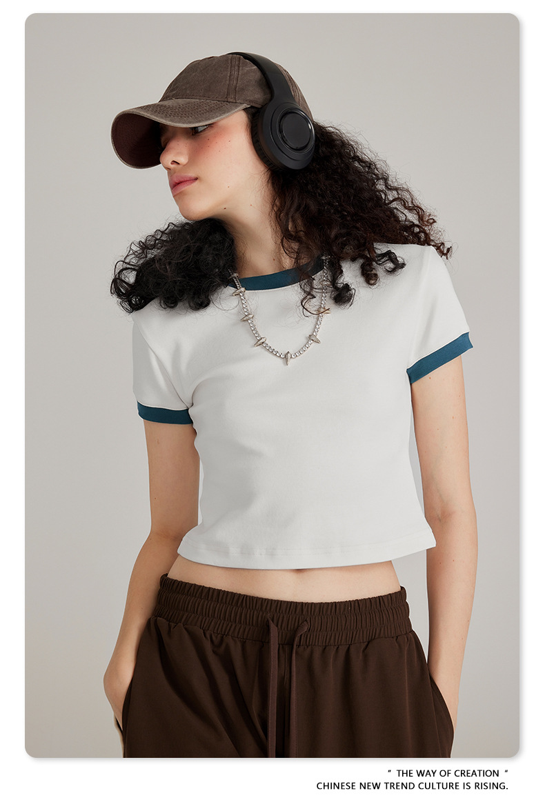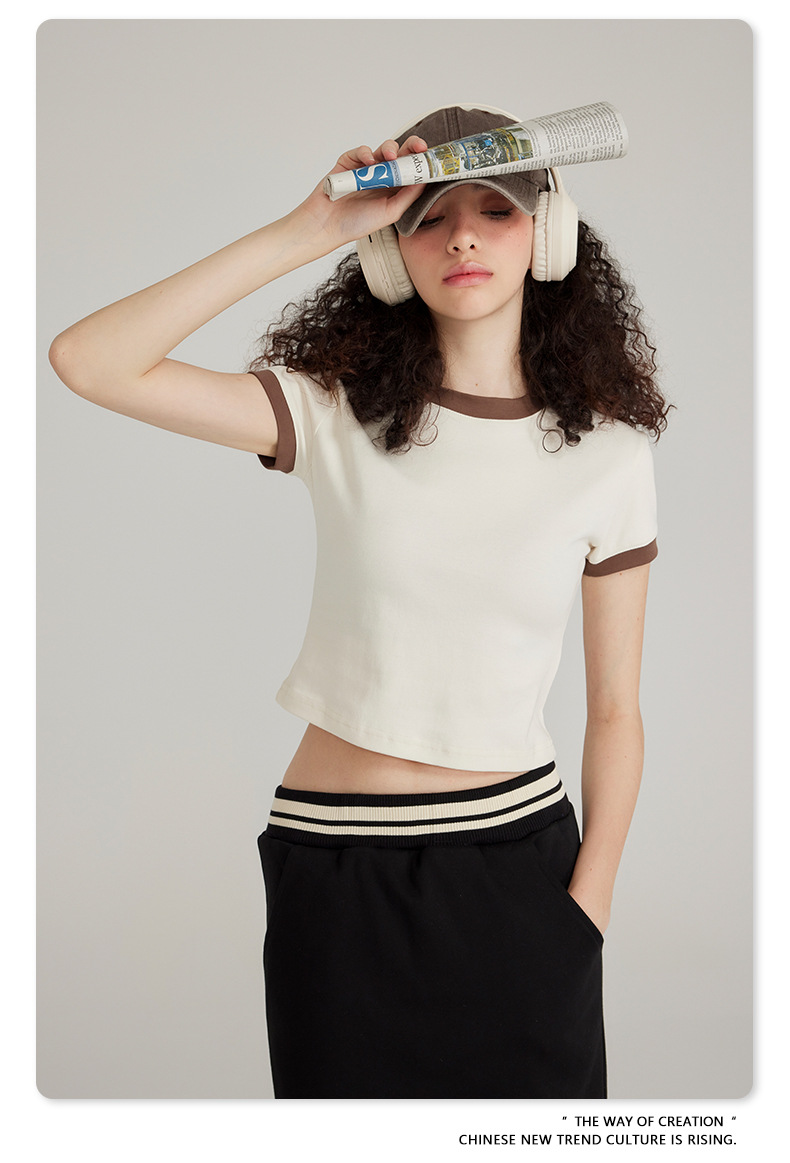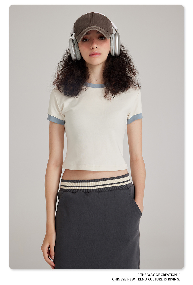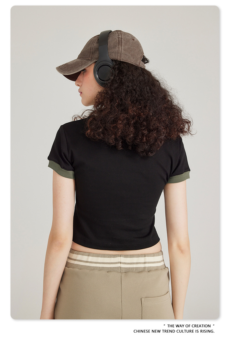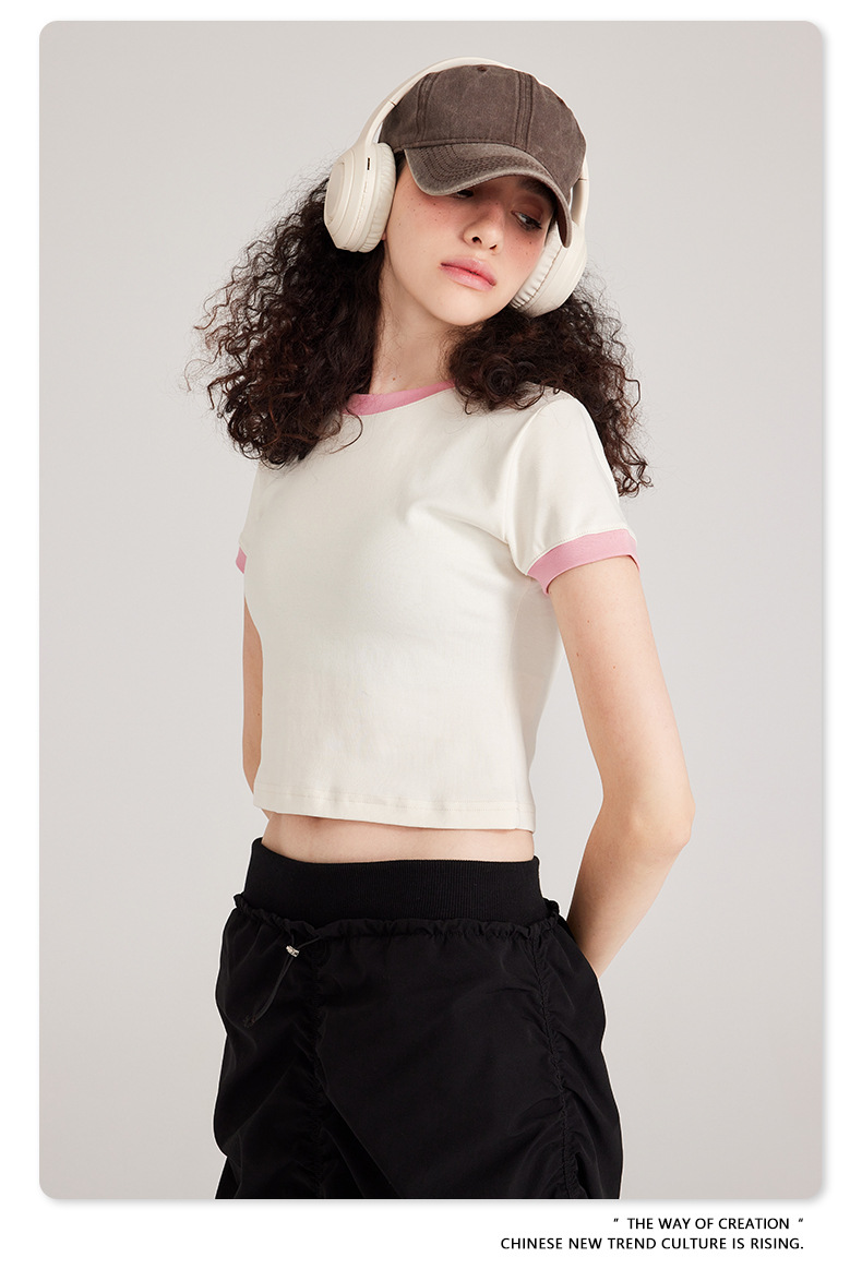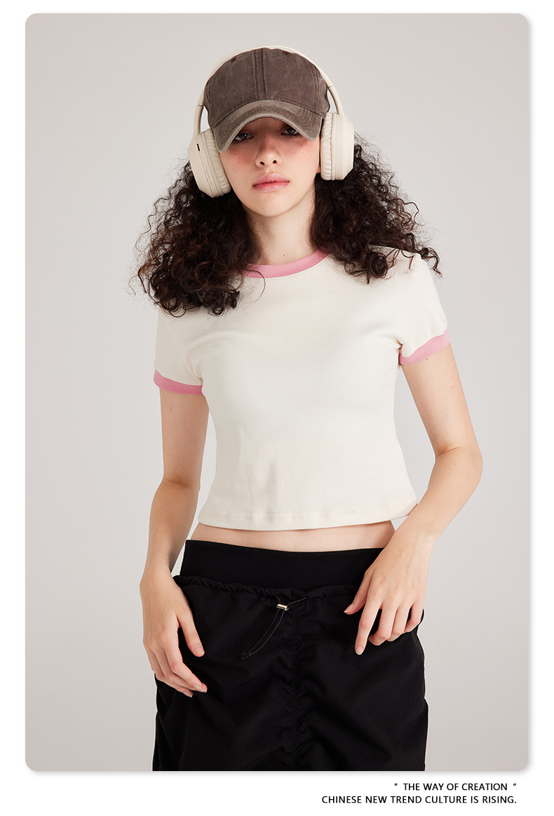 BE 여성 의류 여름 미국 복고풍 대비 색상 라운드 넥 반팔 핫 소녀 짧은 기능 배꼽 노출 오른쪽 어깨 티셔츠 트렌디 브랜드스토어 가기