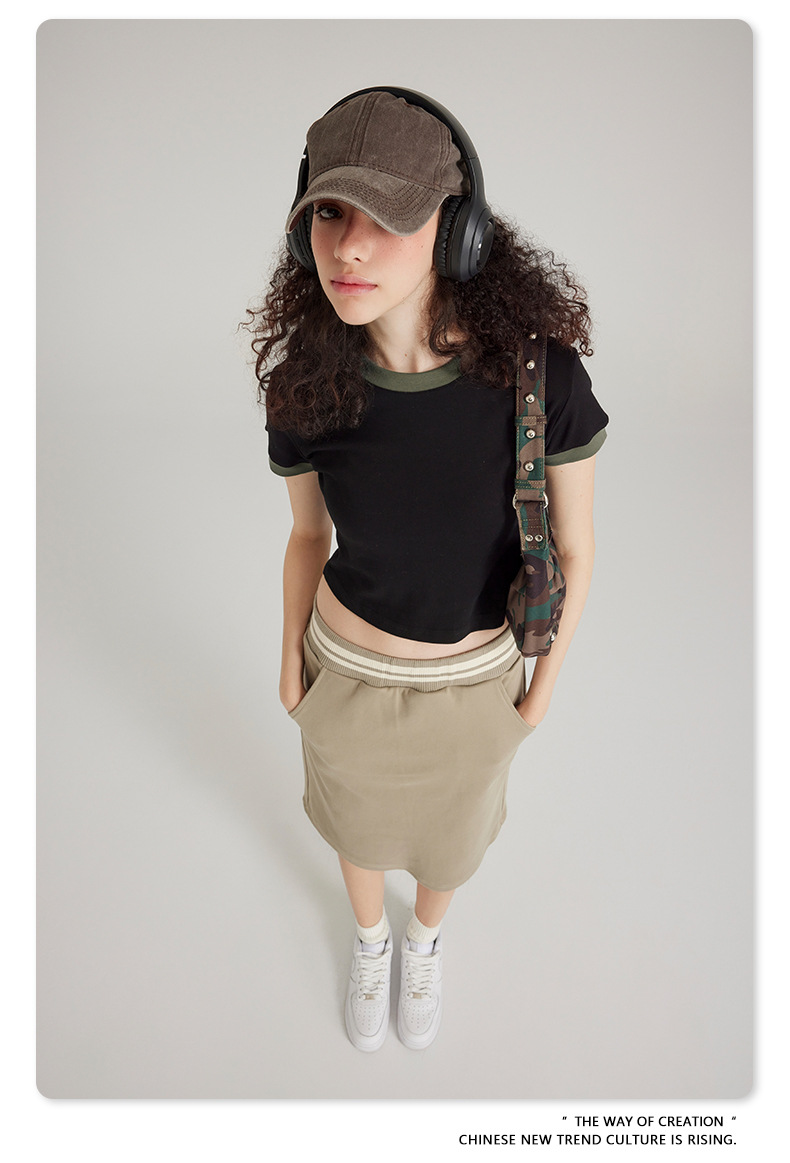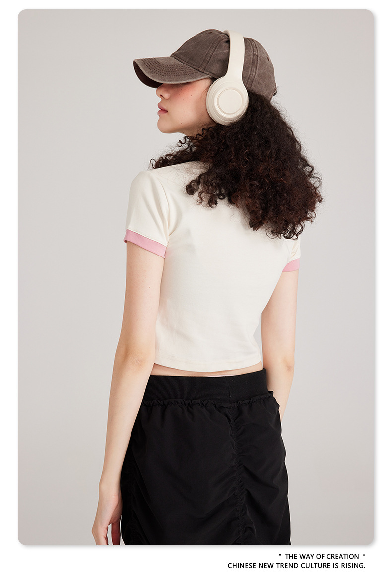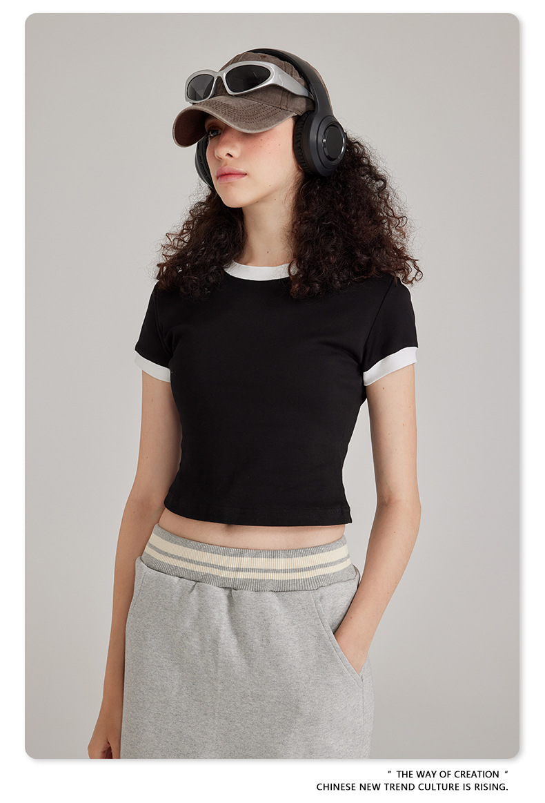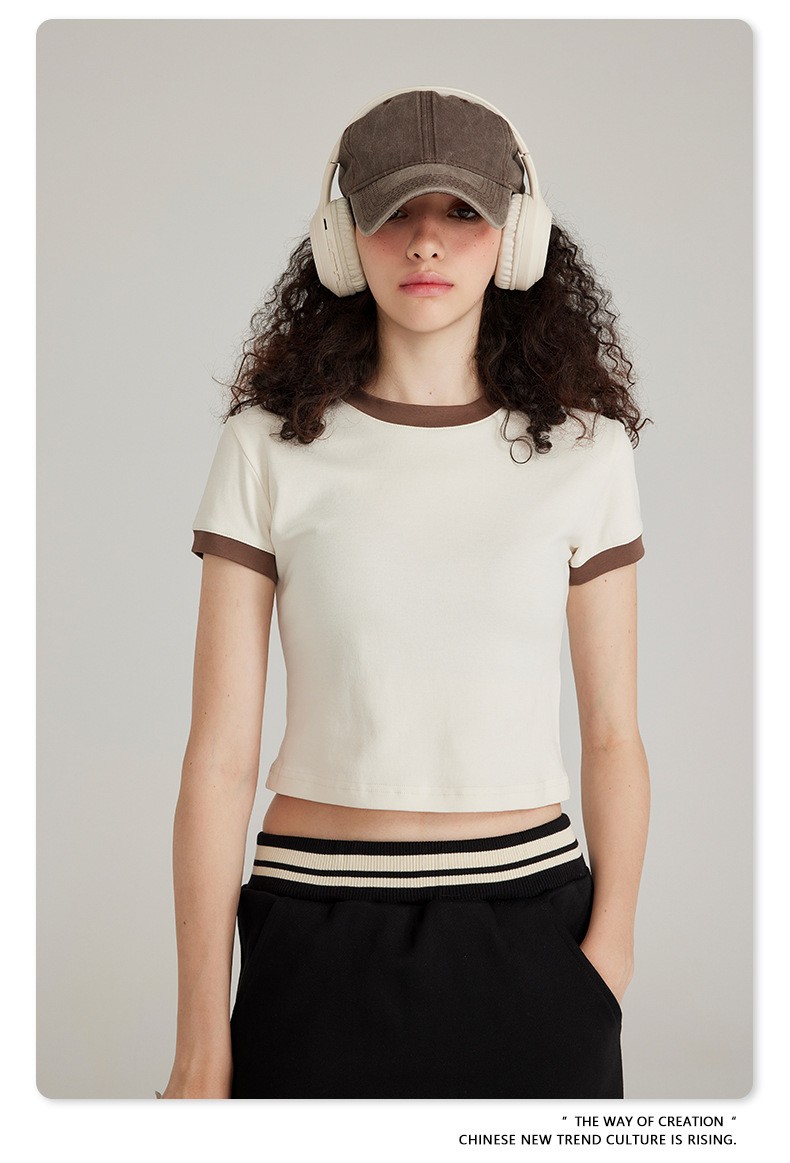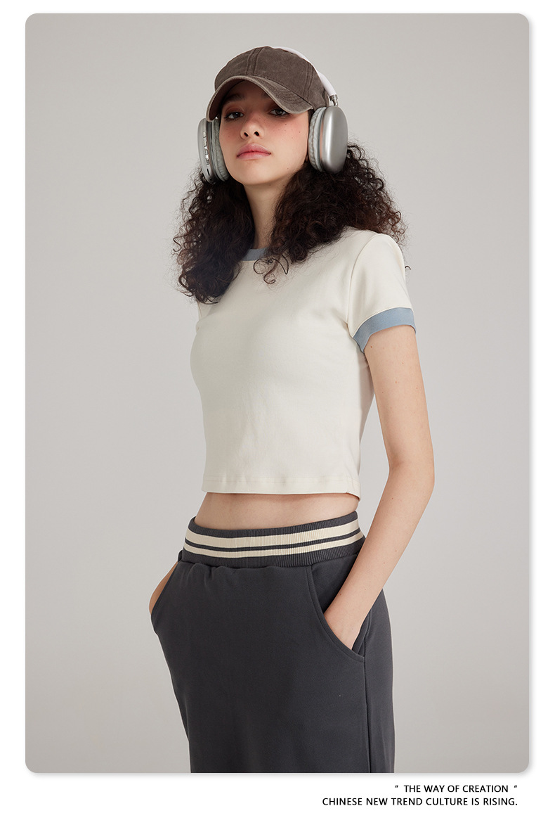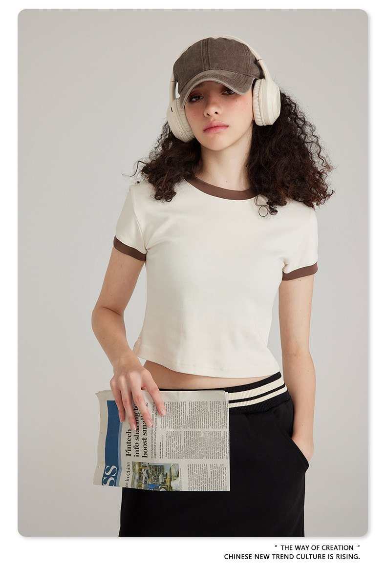 BE 여성 의류 여름 미국 복고풍 대비 색상 라운드 넥 반팔 핫 소녀 짧은 기능 배꼽 노출 오른쪽 어깨 티셔츠 트렌디 브랜드스토어 가기