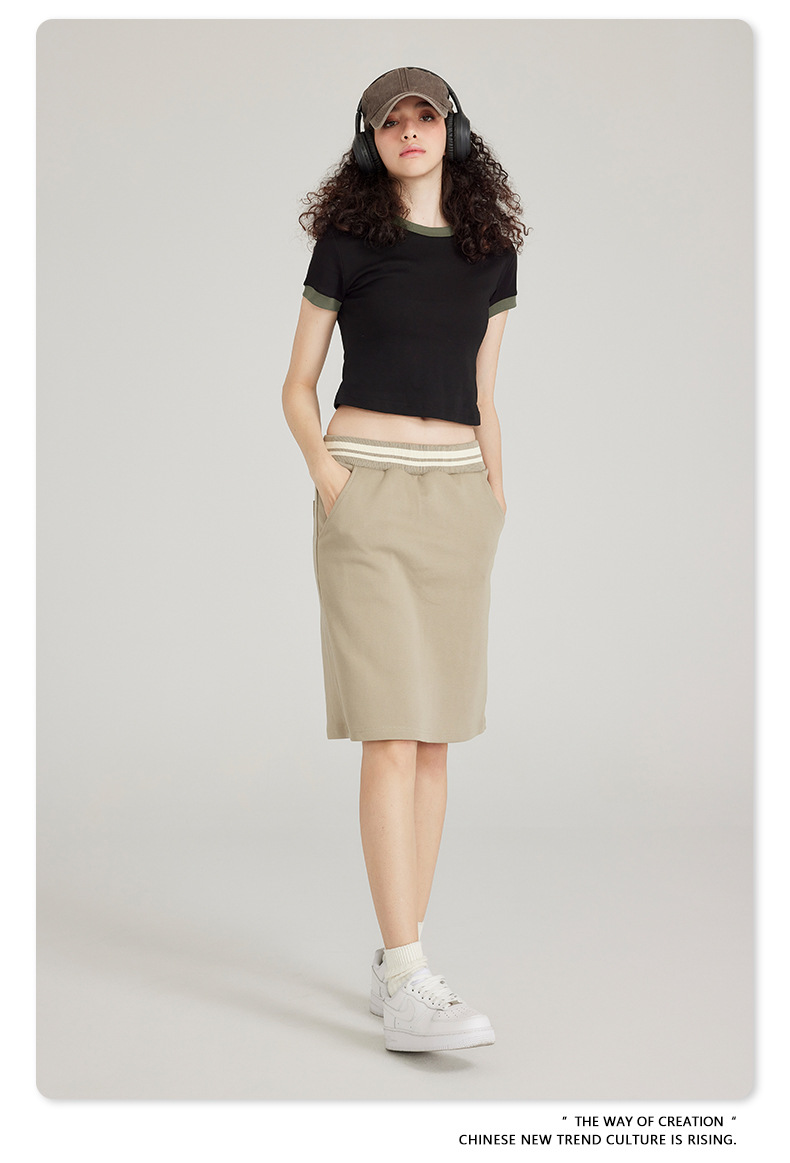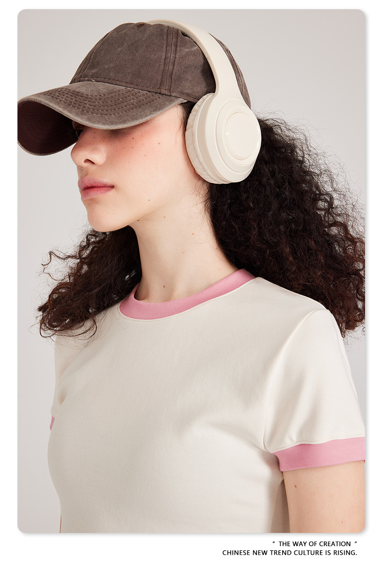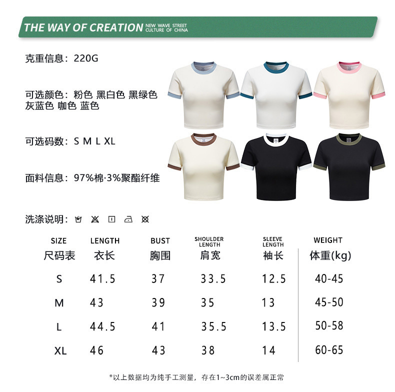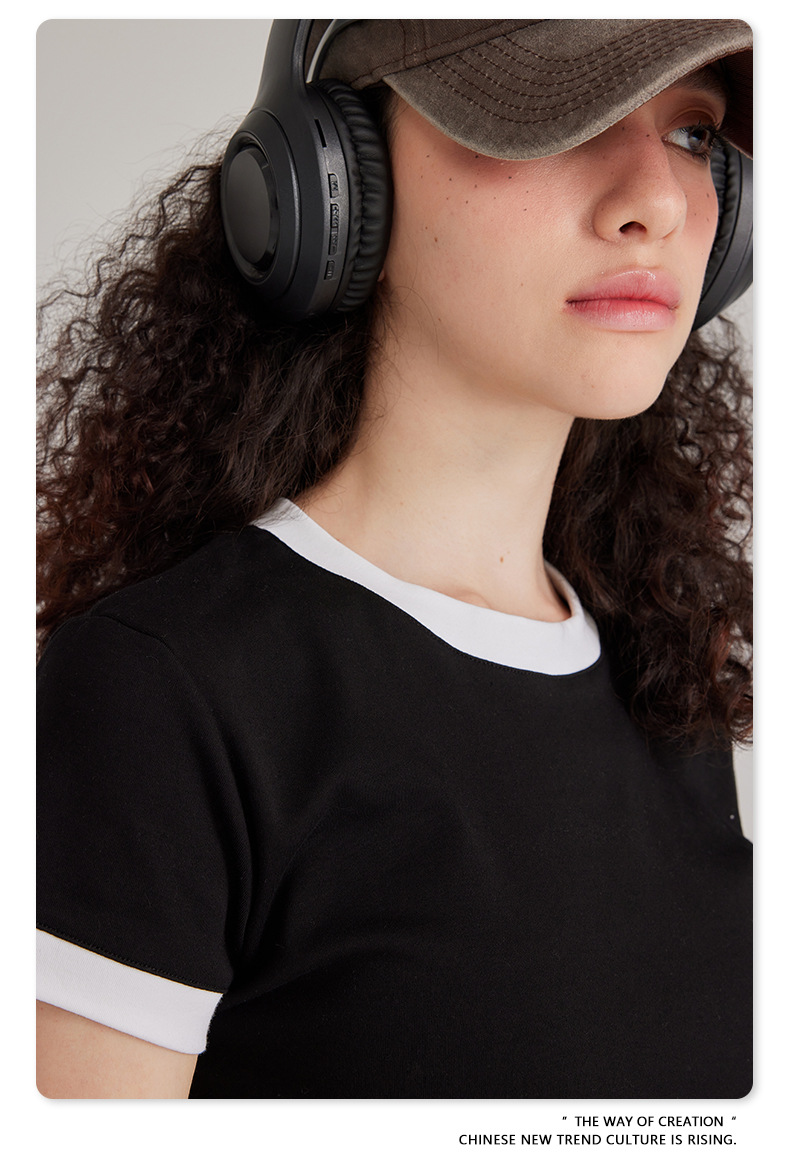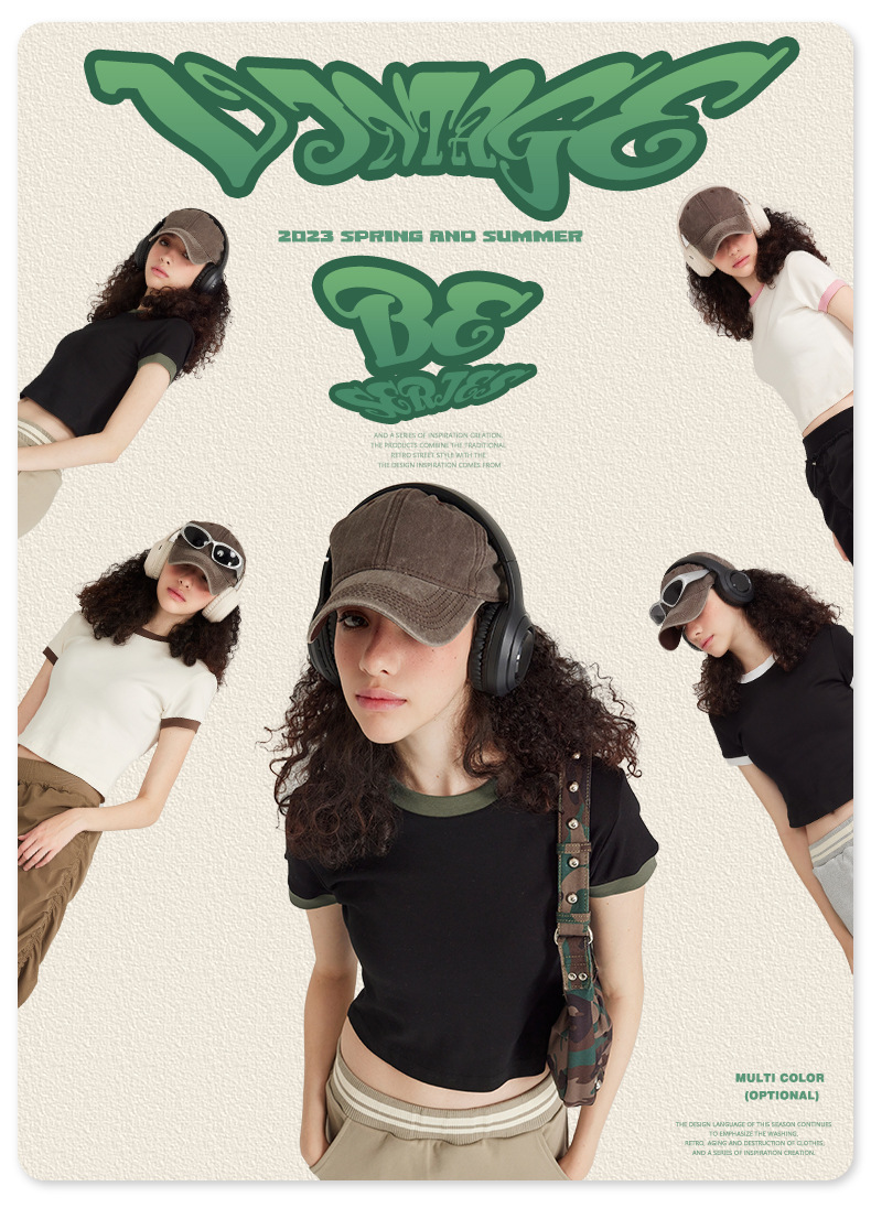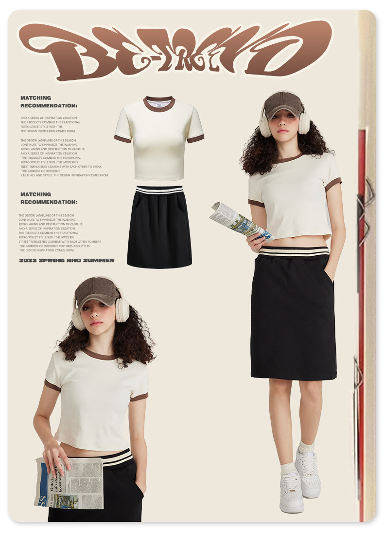 BE 여성 의류 여름 미국 복고풍 대비 색상 라운드 넥 반팔 핫 소녀 짧은 기능 배꼽 노출 오른쪽 어깨 티셔츠 트렌디 브랜드스토어 가기