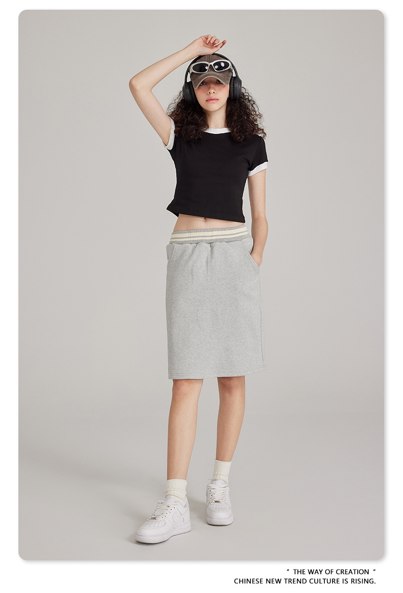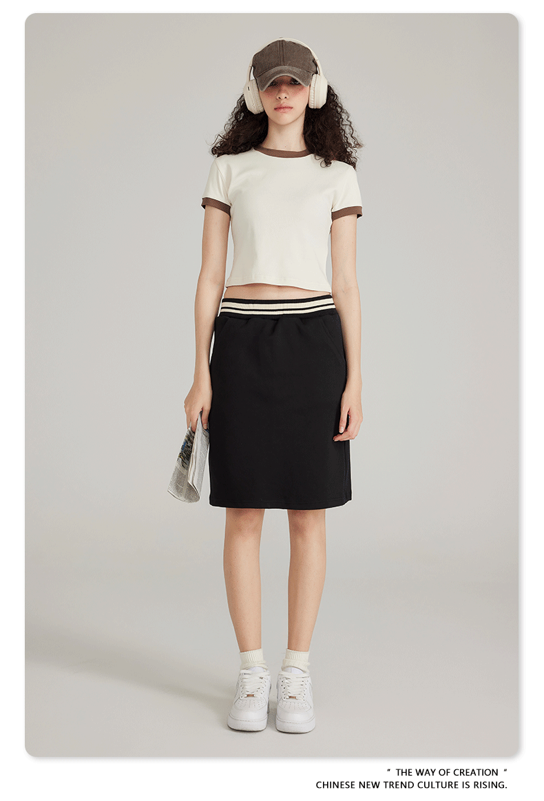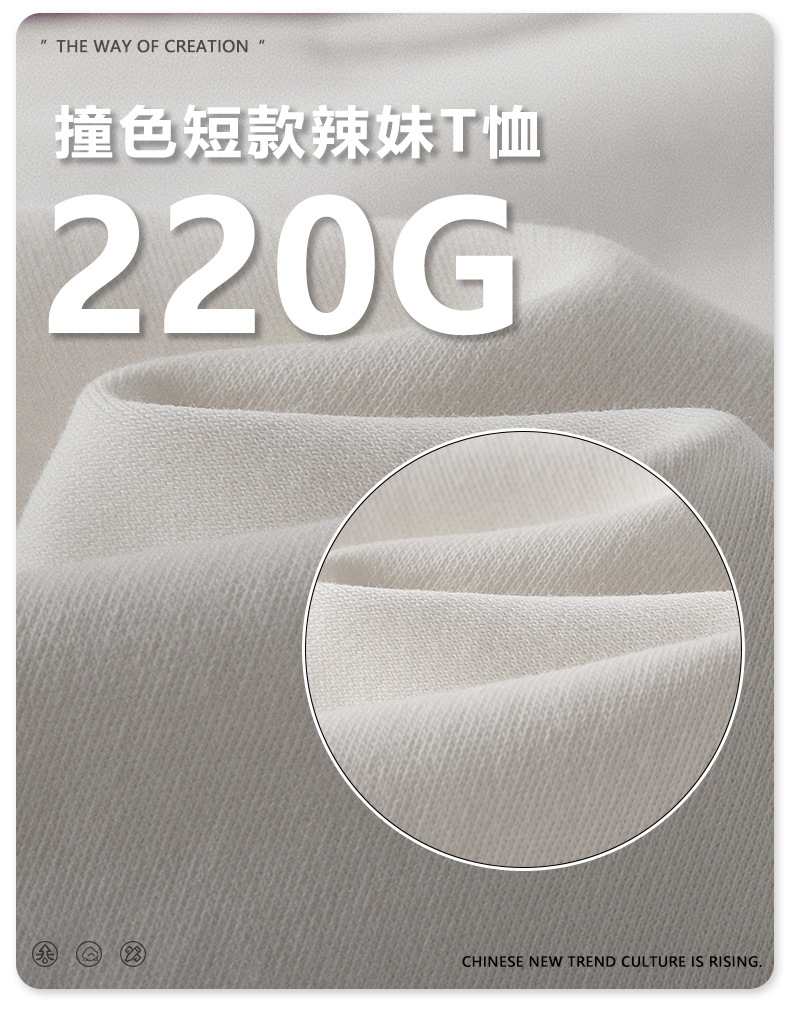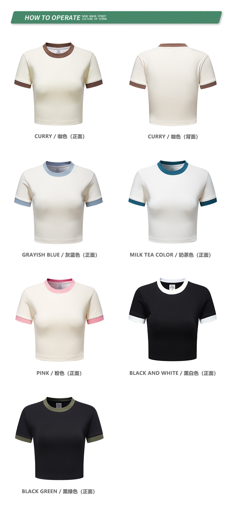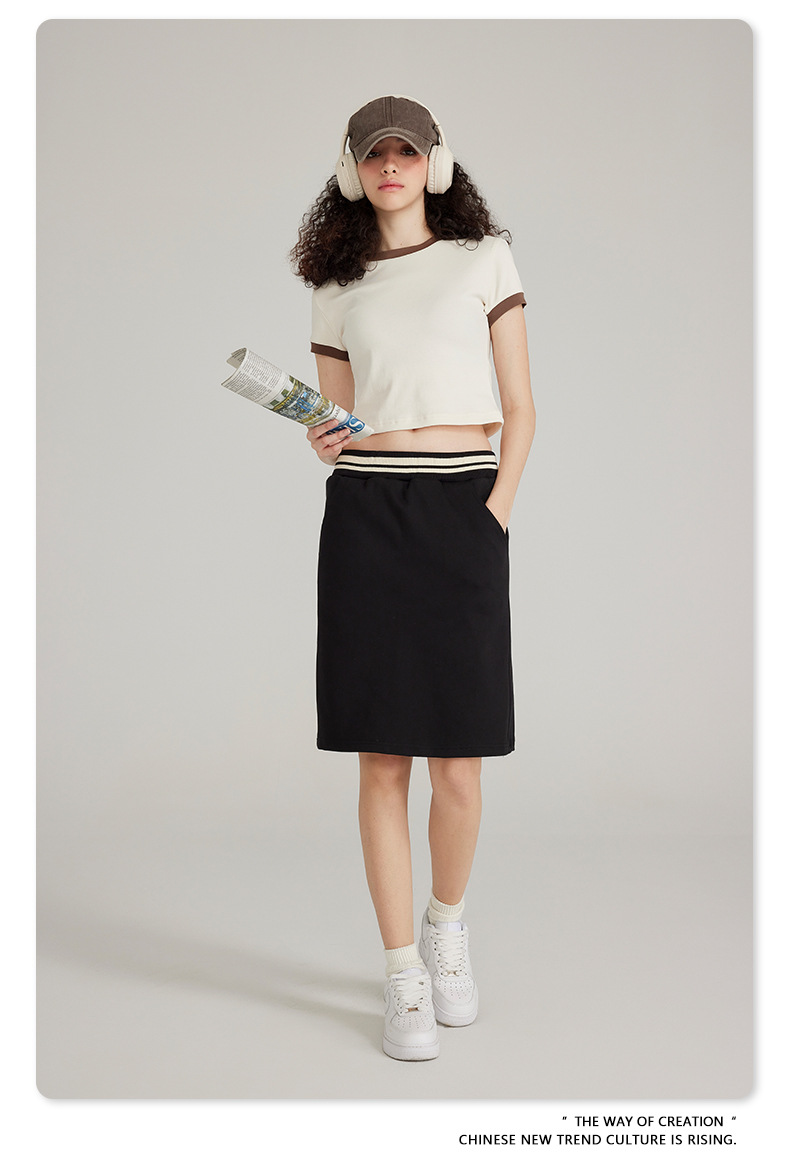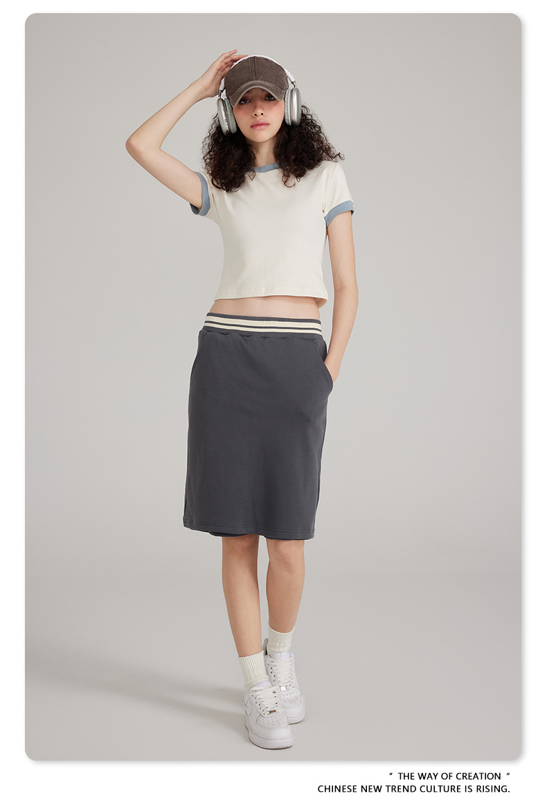 BE 여성 의류 여름 미국 복고풍 대비 색상 라운드 넥 반팔 핫 소녀 짧은 기능 배꼽 노출 오른쪽 어깨 티셔츠 트렌디 브랜드스토어 가기