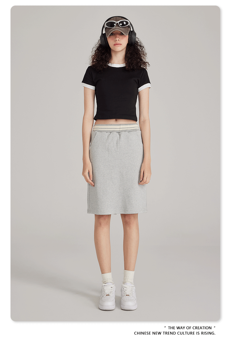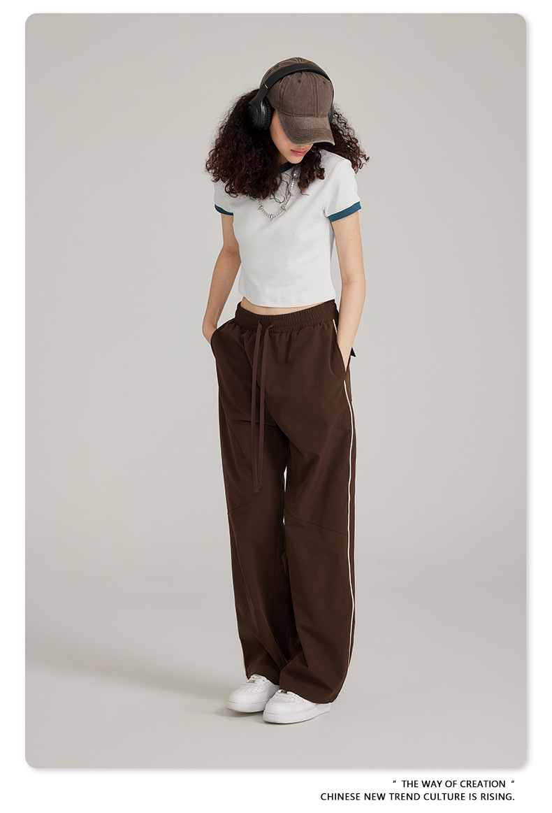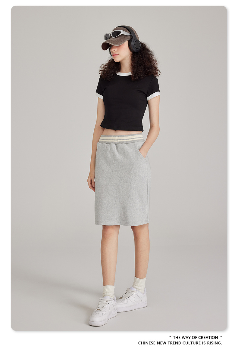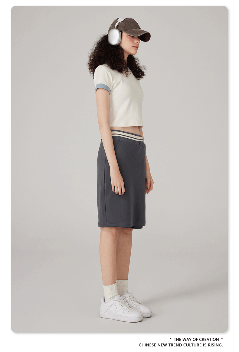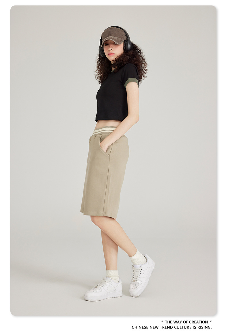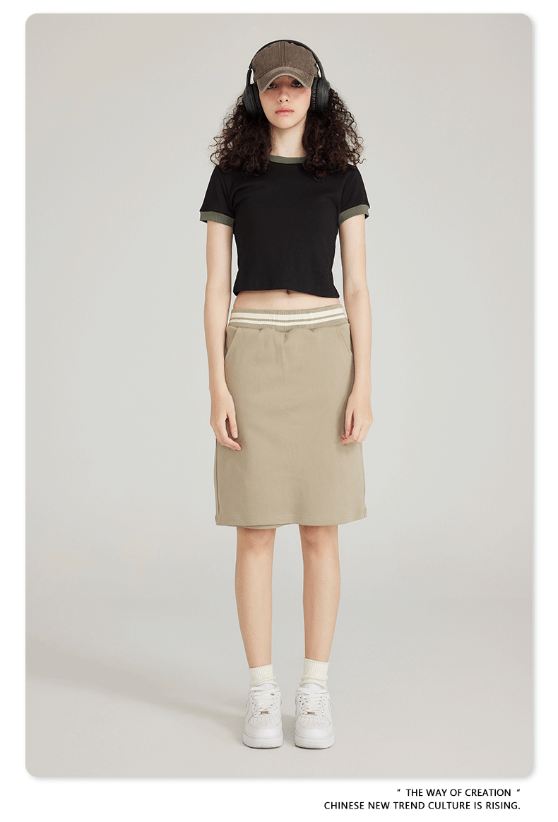 BE 여성 의류 여름 미국 복고풍 대비 색상 라운드 넥 반팔 핫 소녀 짧은 기능 배꼽 노출 오른쪽 어깨 티셔츠 트렌디 브랜드스토어 가기