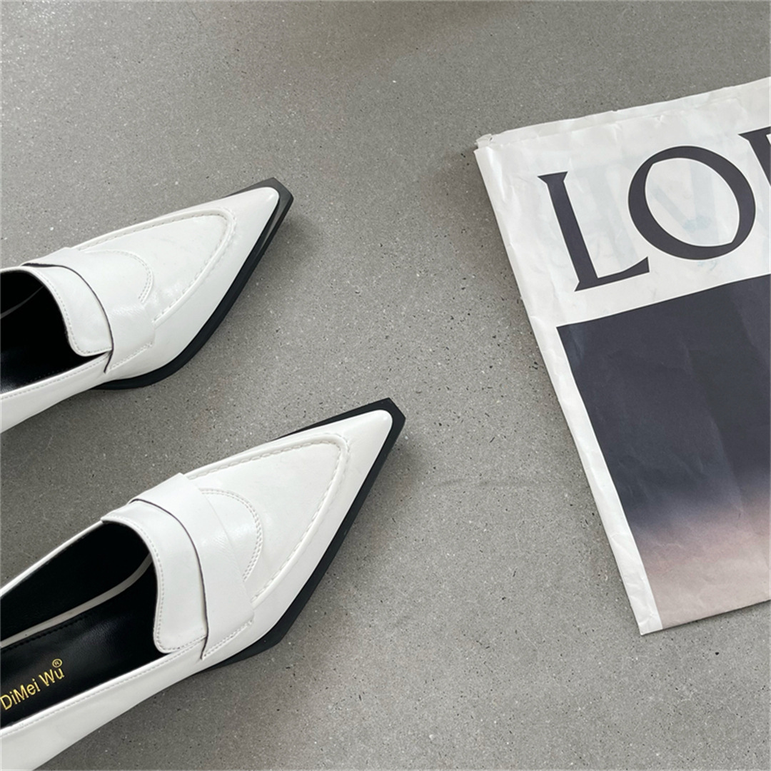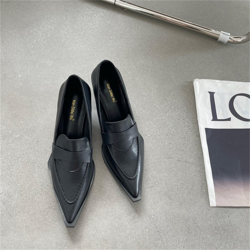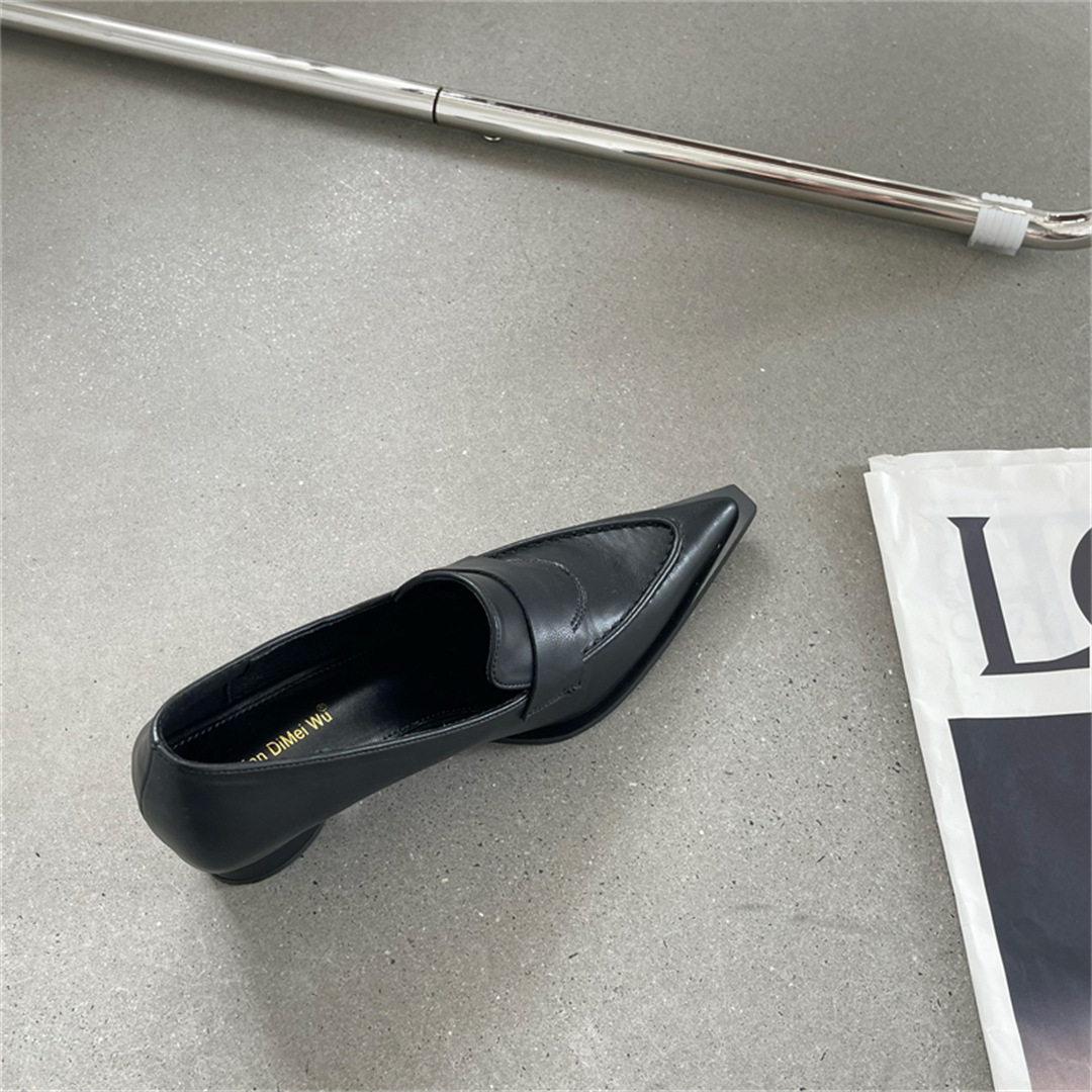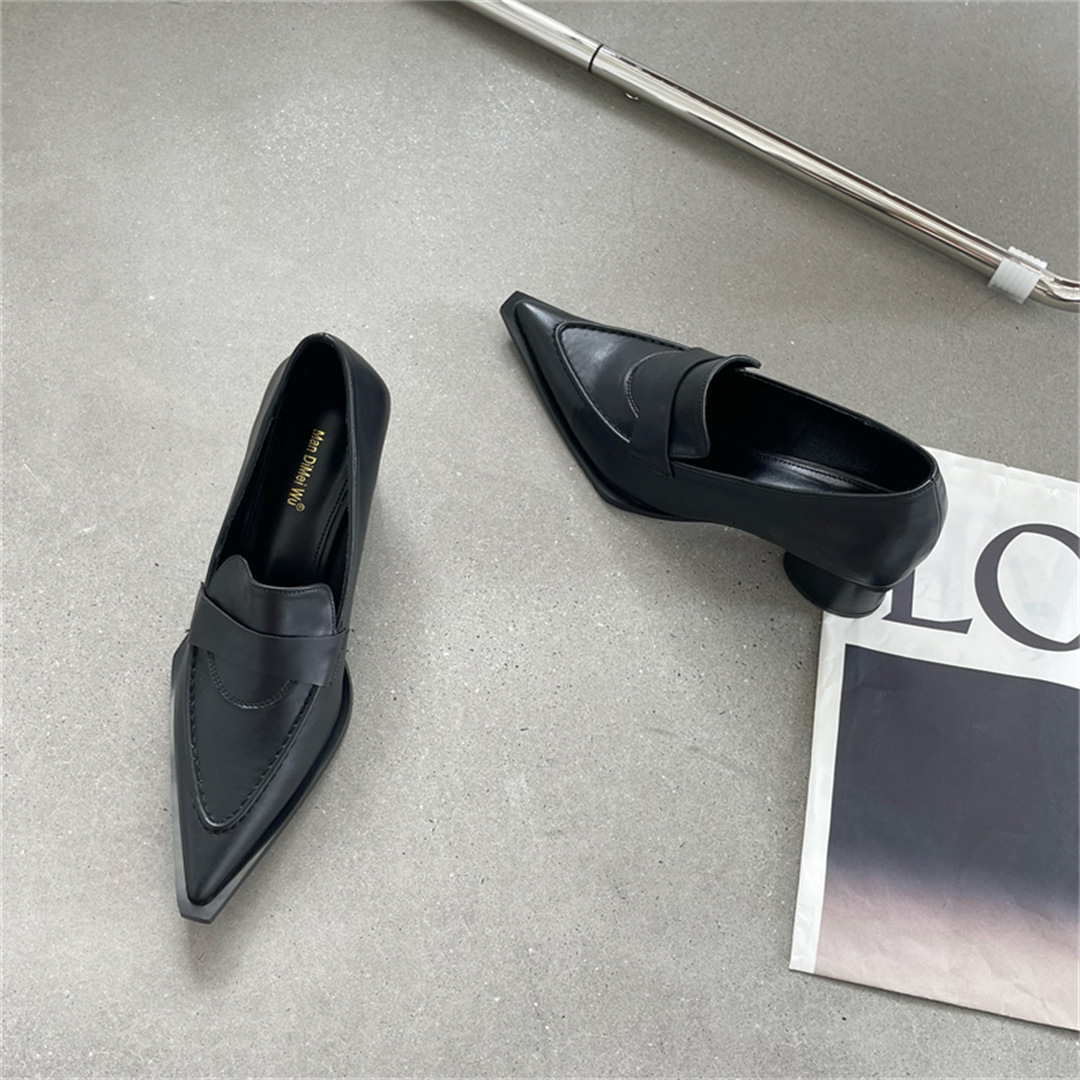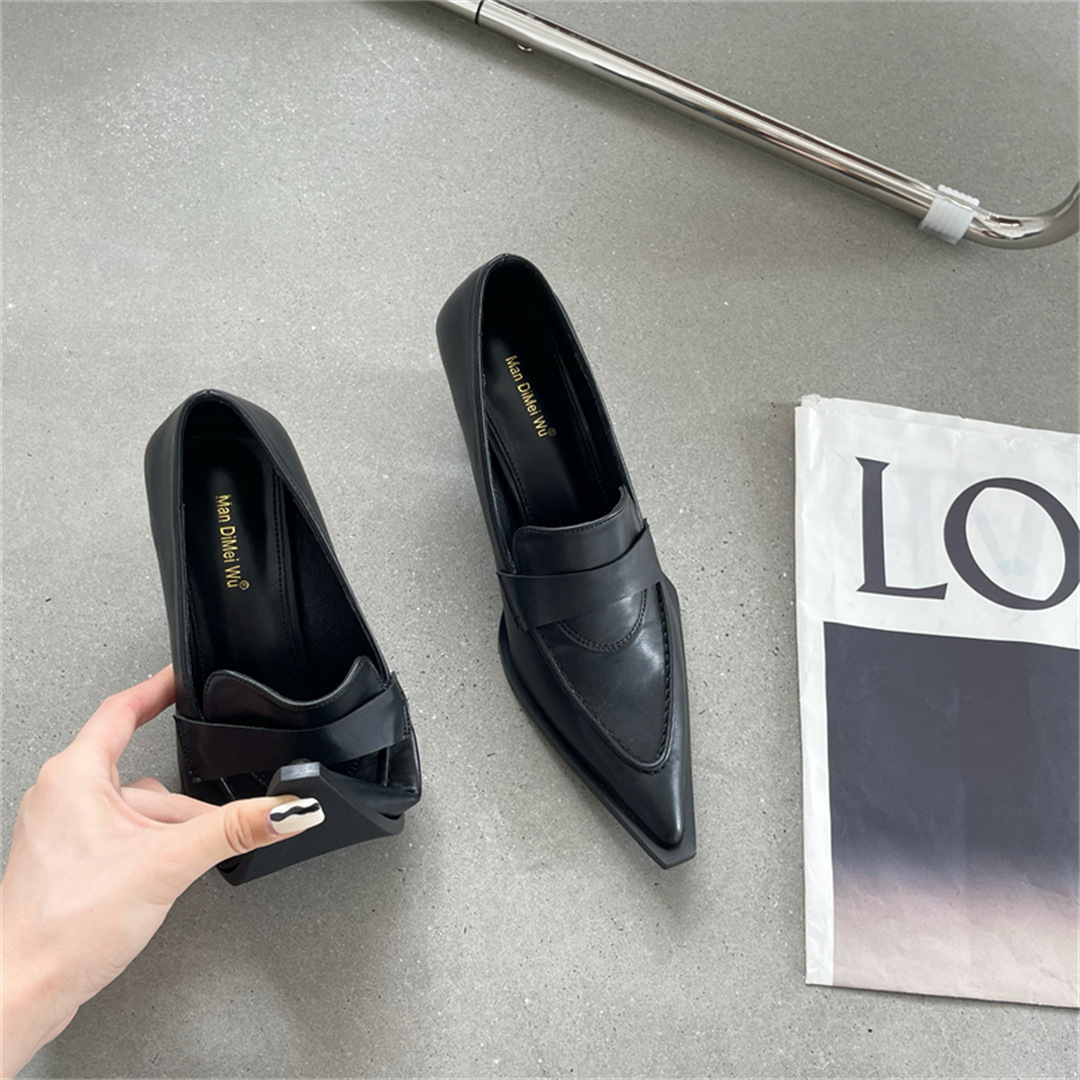 2025 봄 신상 여성용 포인티드 토 슈즈, 두꺼운 굽, 미디엄 굽, 영국 스타일 로퍼, 슬립온 하이힐 가죽 슈즈스토어 가기