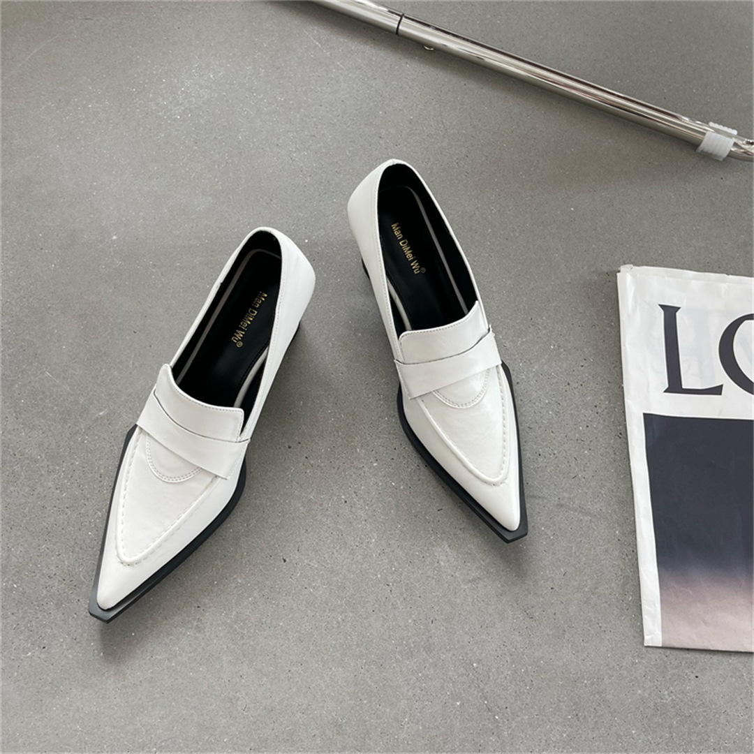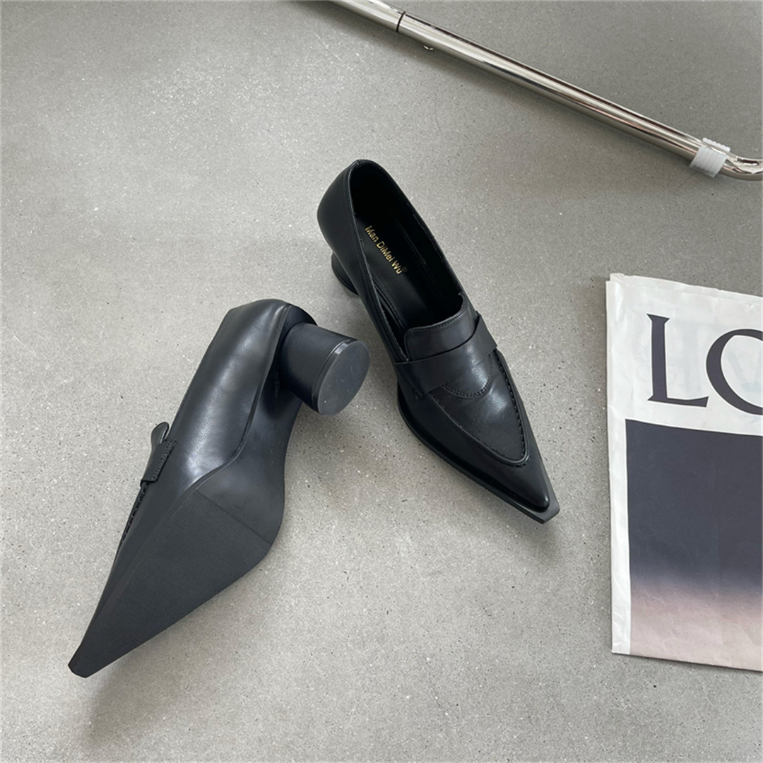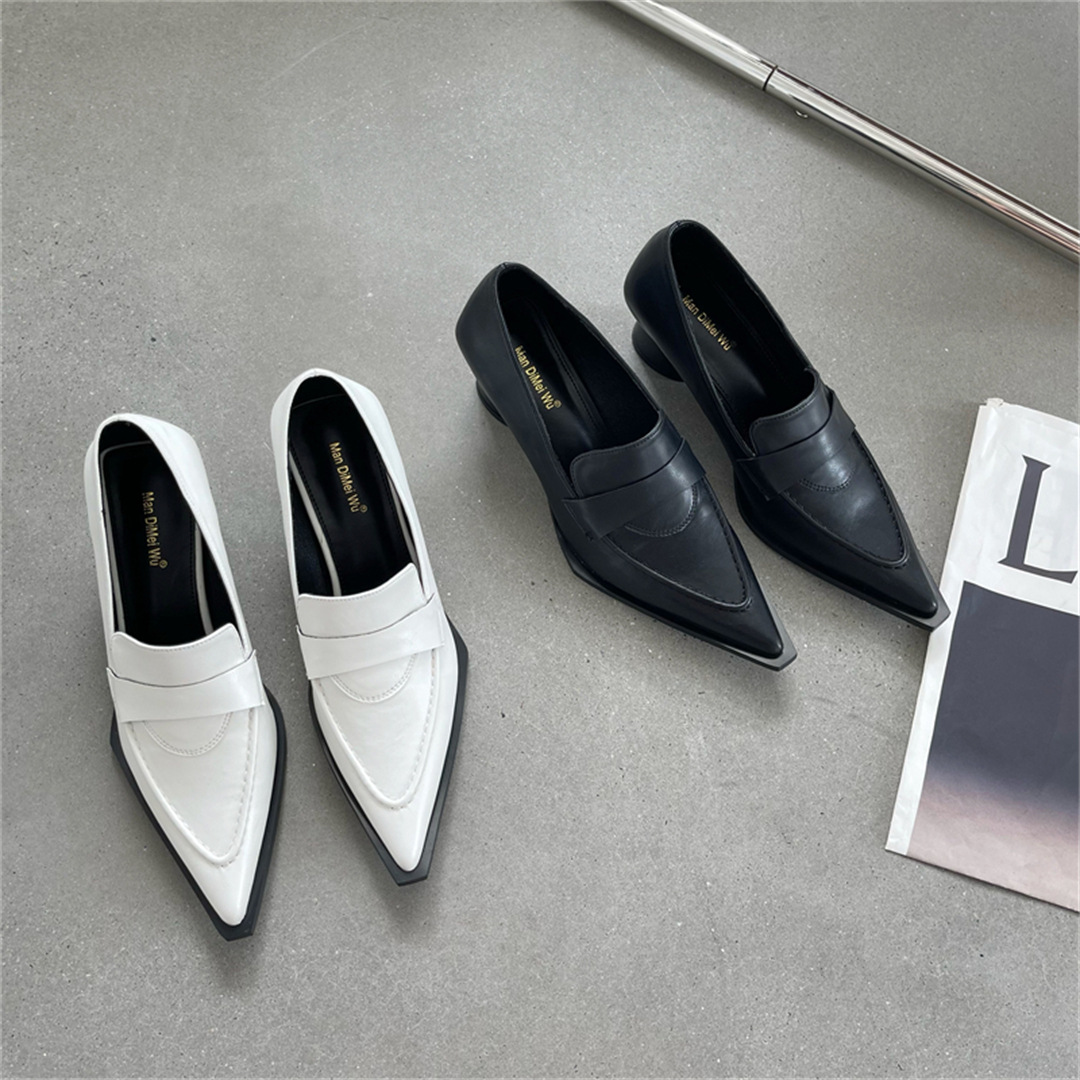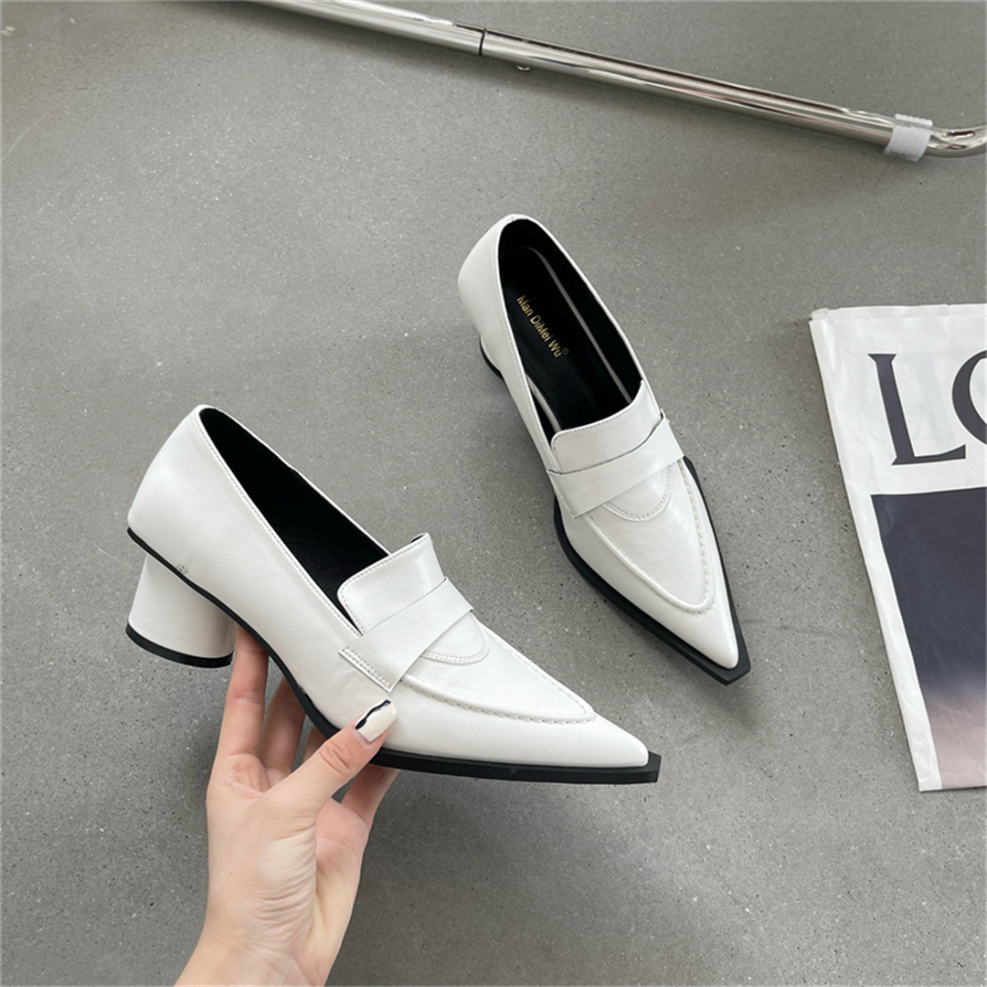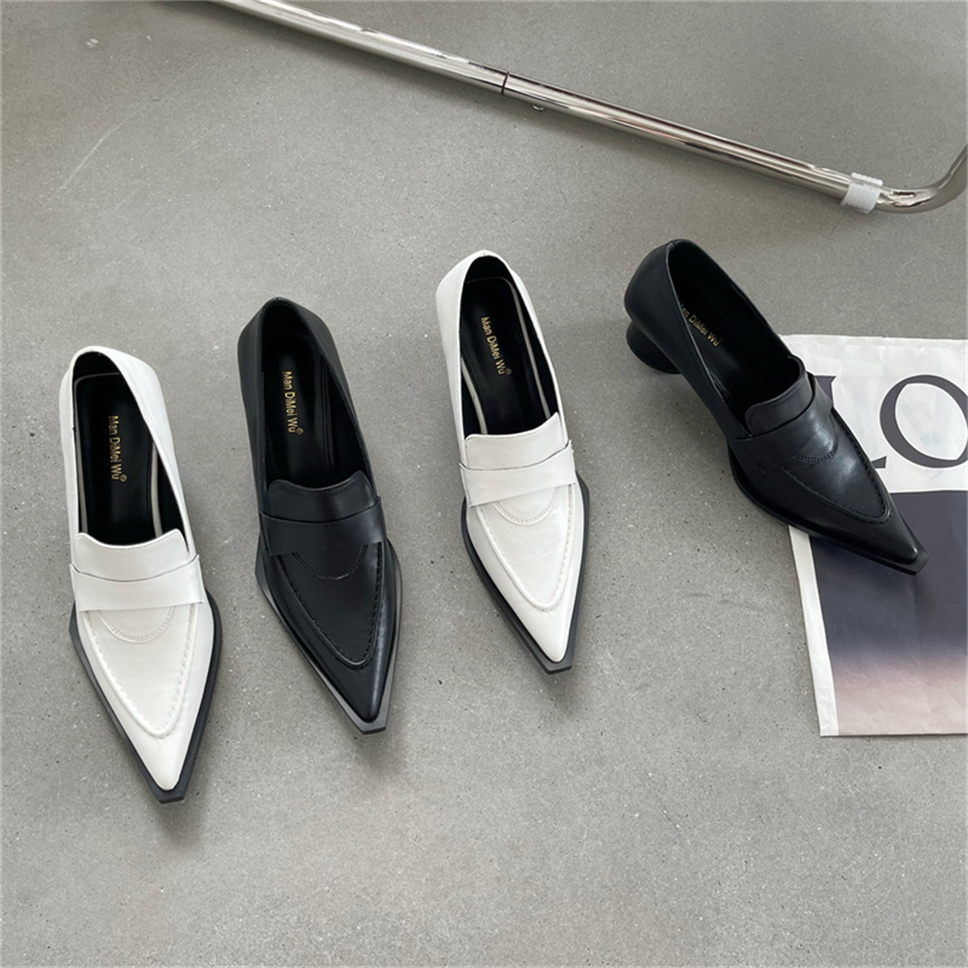 2025 봄 신상 여성용 포인티드 토 슈즈, 두꺼운 굽, 미디엄 굽, 영국 스타일 로퍼, 슬립온 하이힐 가죽 슈즈스토어 가기