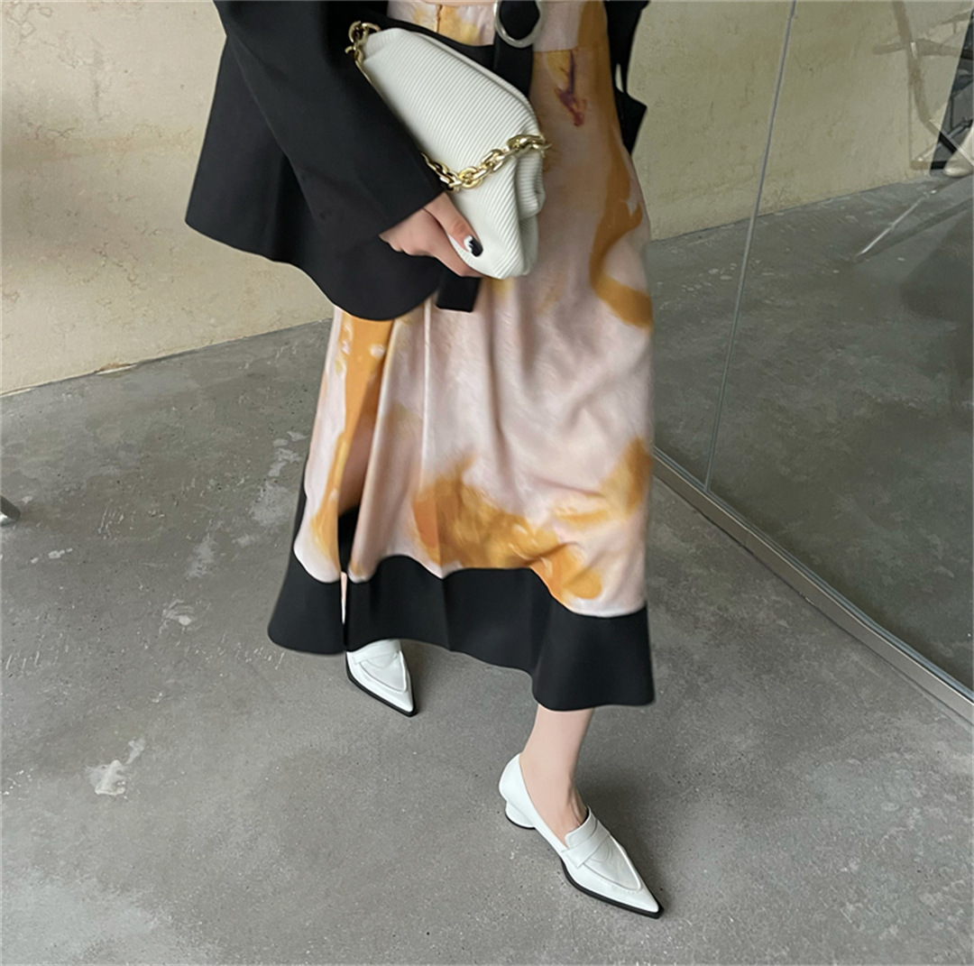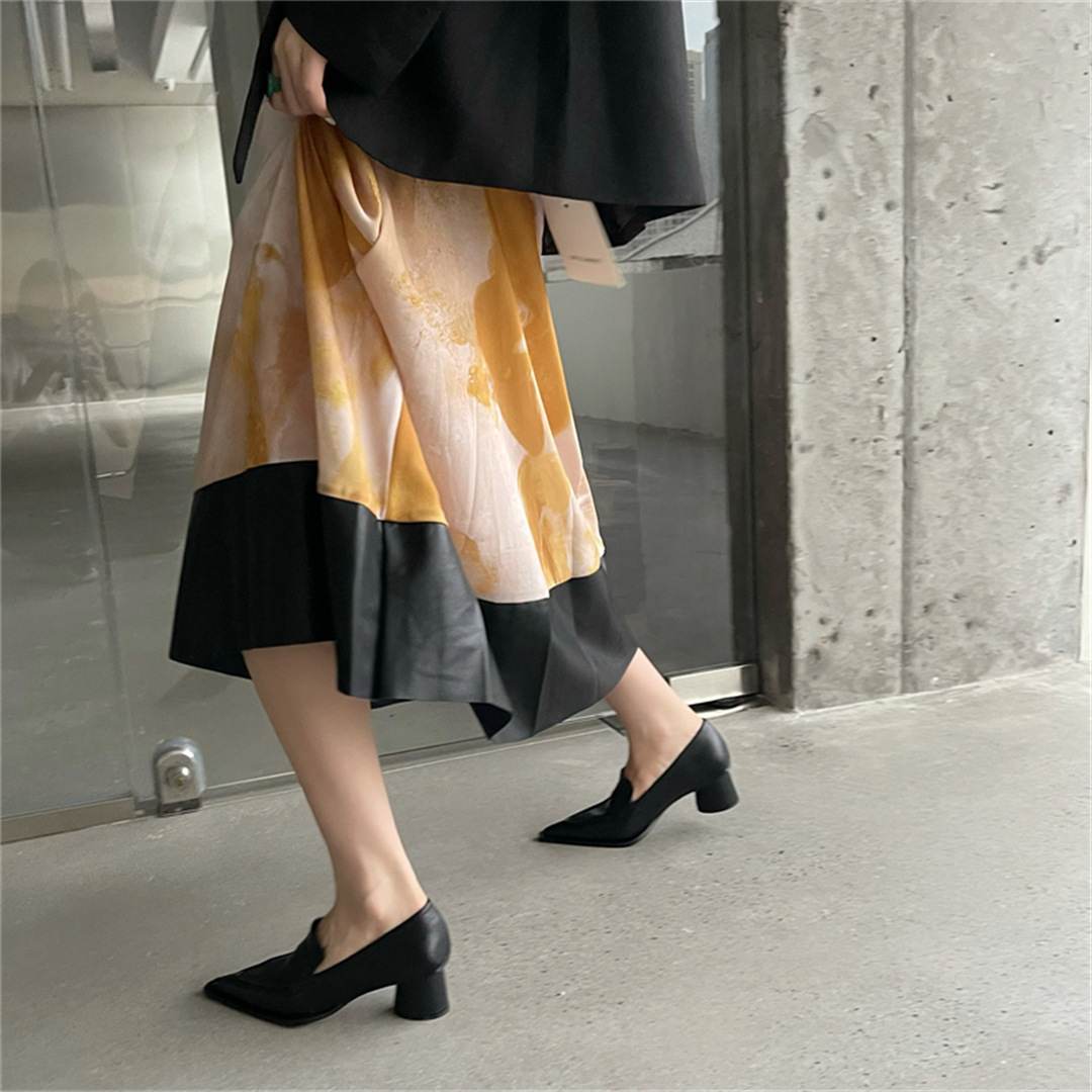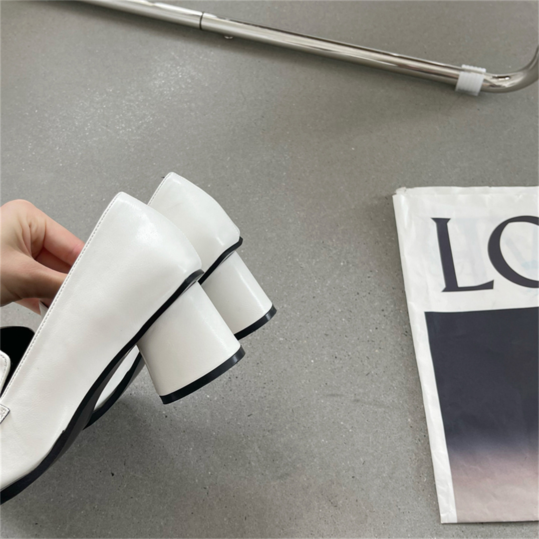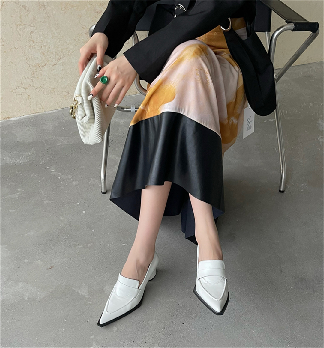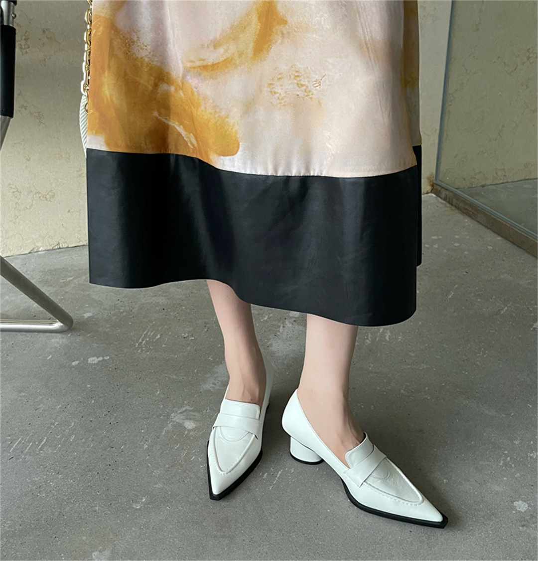 2025 봄 신상 여성용 포인티드 토 슈즈, 두꺼운 굽, 미디엄 굽, 영국 스타일 로퍼, 슬립온 하이힐 가죽 슈즈스토어 가기
