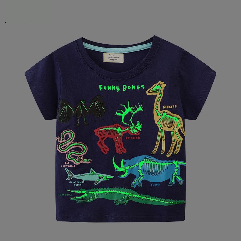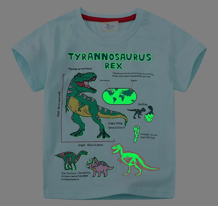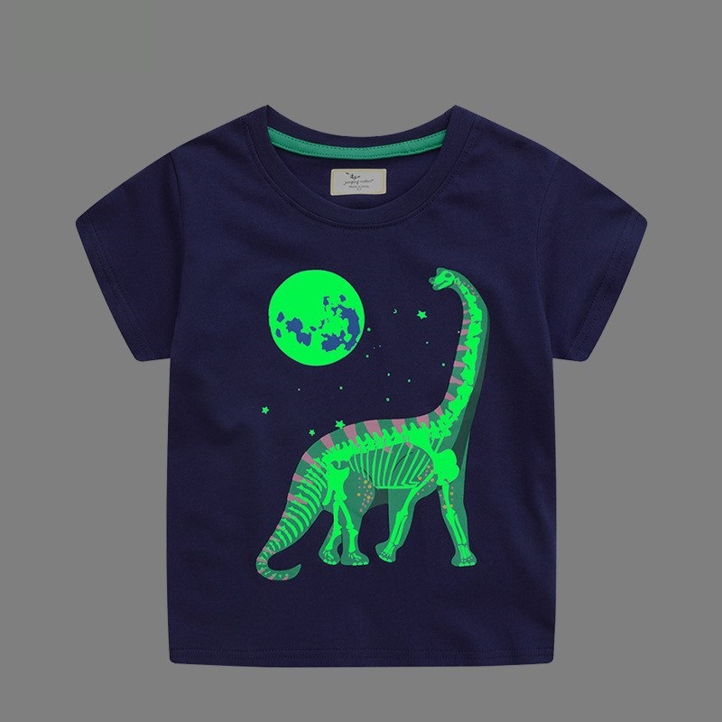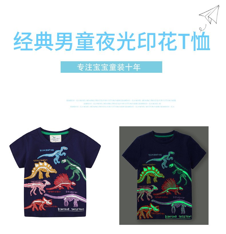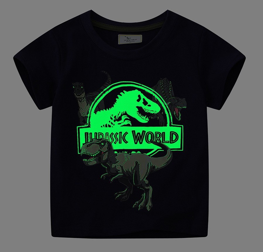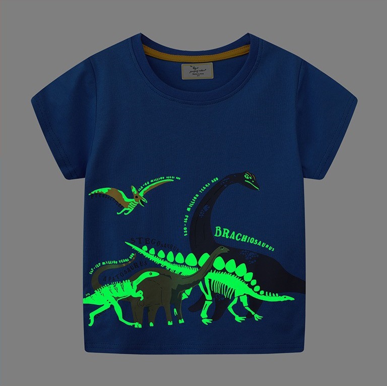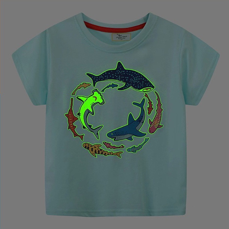 2025 여름 남아 야광 만화 프린트 반팔 라운드넥 티셔츠 공룡 상어 반팔 티셔츠 소형 어린이용 재고 직배송스토어 가기