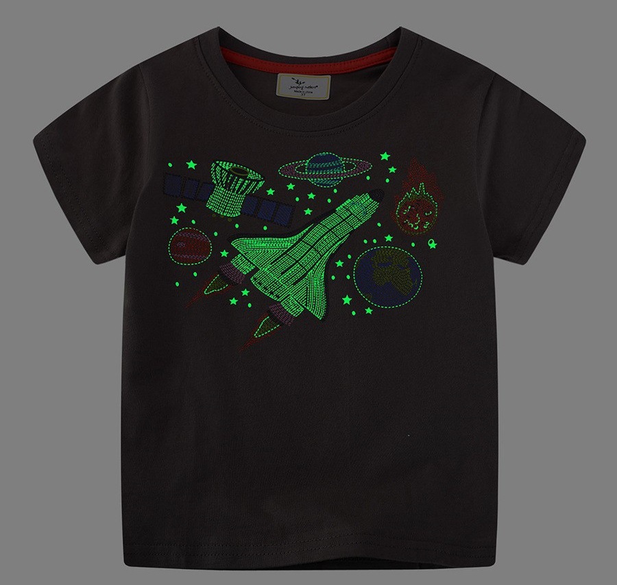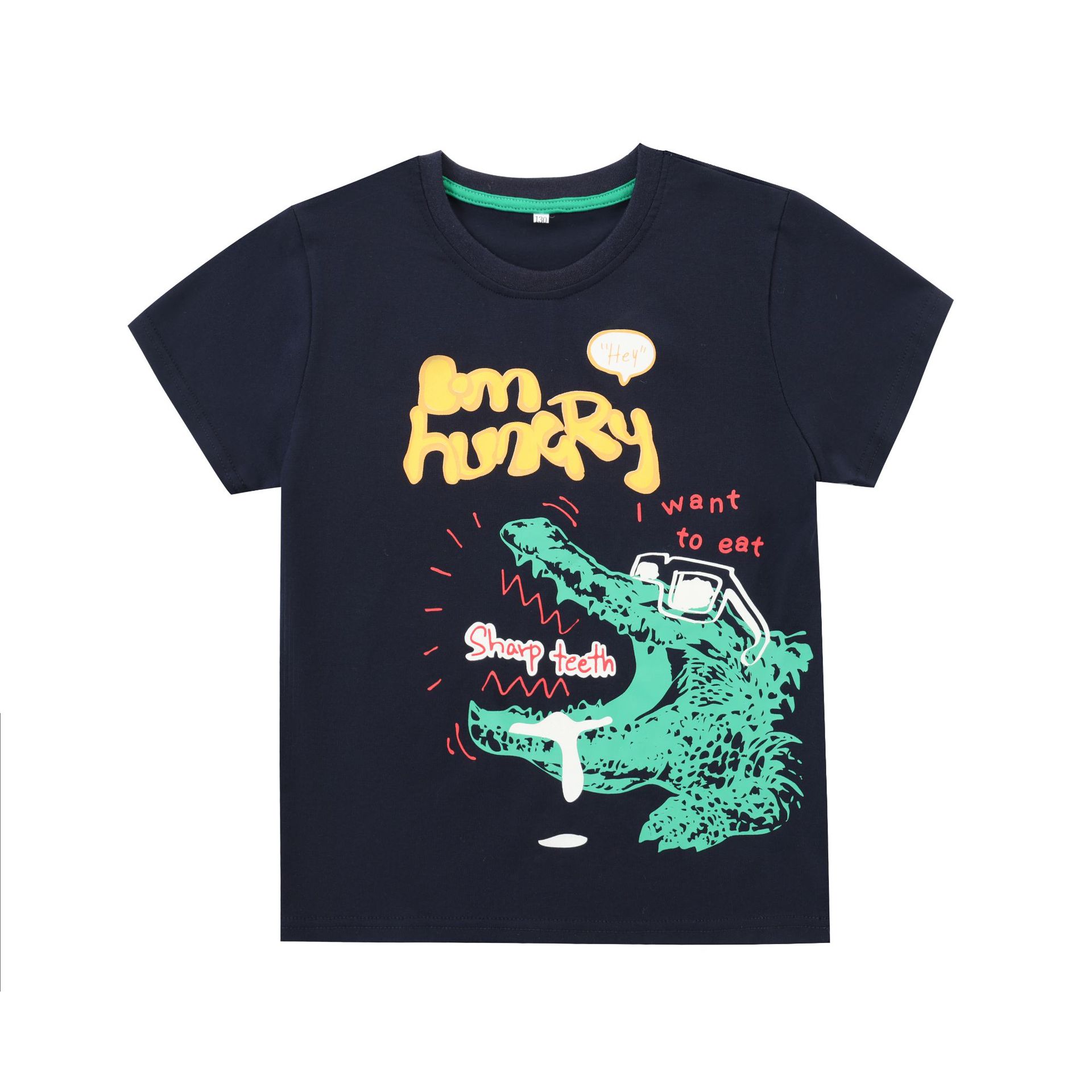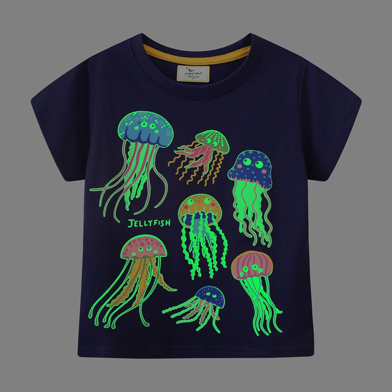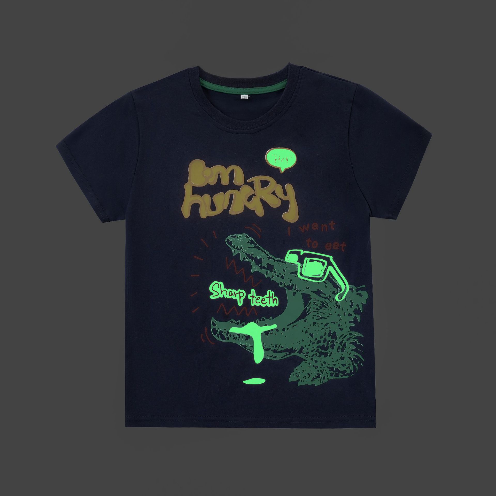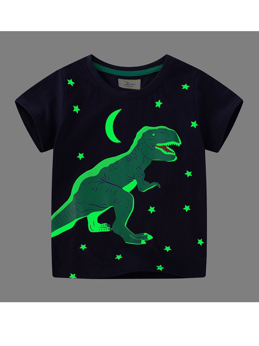 2025 여름 남아 야광 만화 프린트 반팔 라운드넥 티셔츠 공룡 상어 반팔 티셔츠 소형 어린이용 재고 직배송