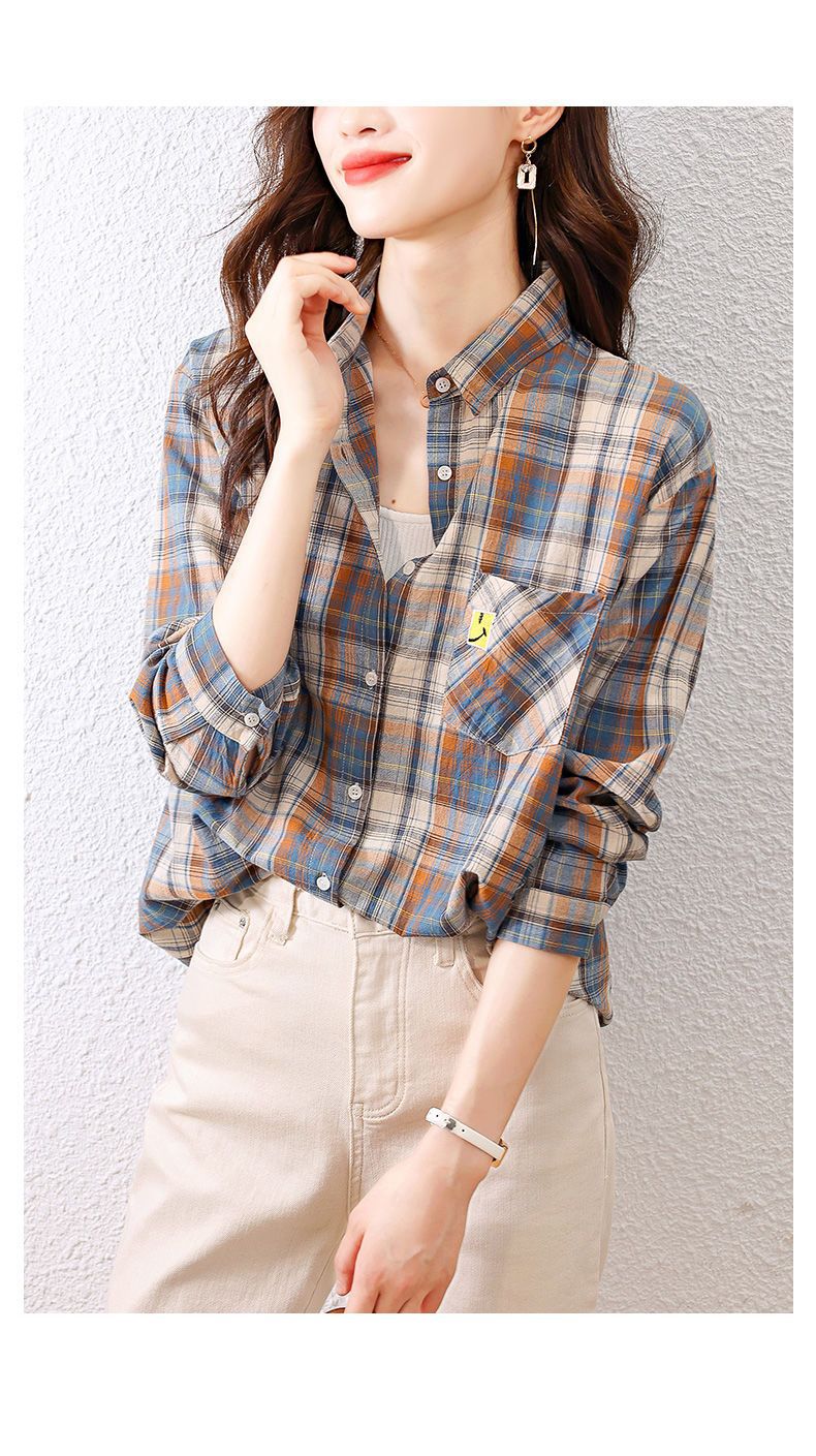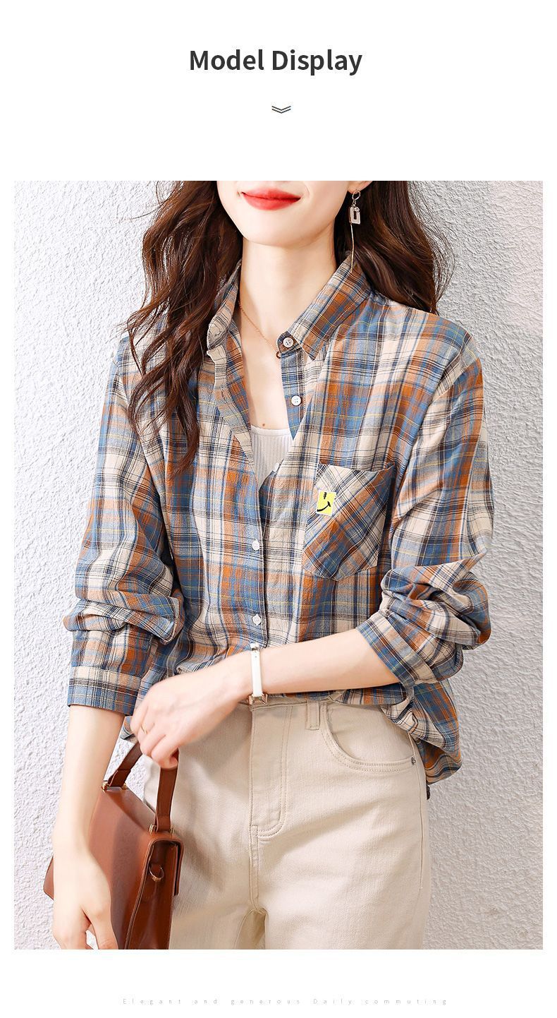 2024 새로운 캐주얼하고 다재다능한 한국 패션 디자인 슬림 코튼 체크 무늬 셔츠 여성용스토어 가기