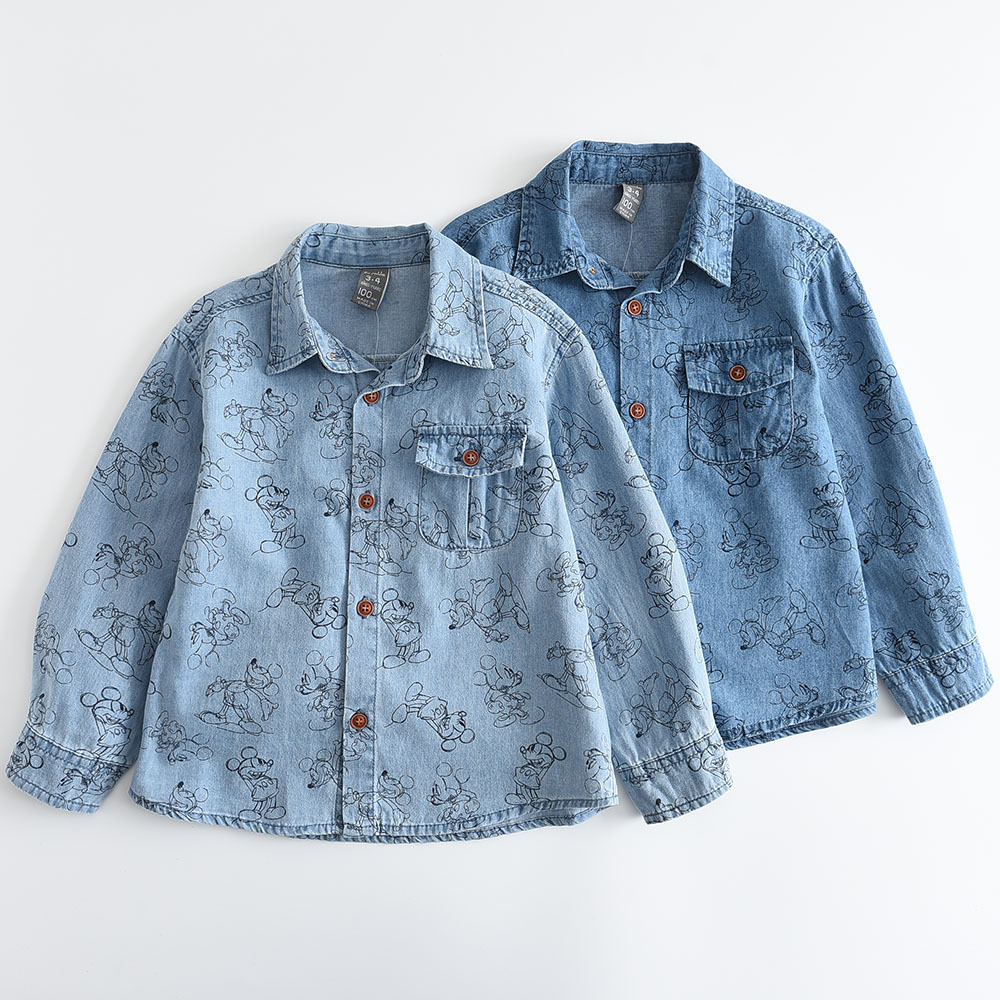 0220-11 봄 2023 새로운 전체 인쇄 만화 인쇄 소년 긴 소매 옷깃 데님 셔츠스토어 가기