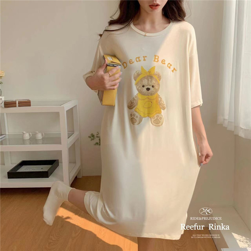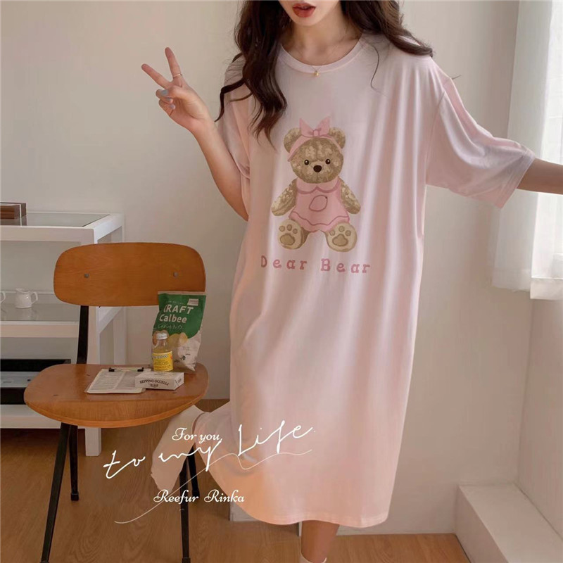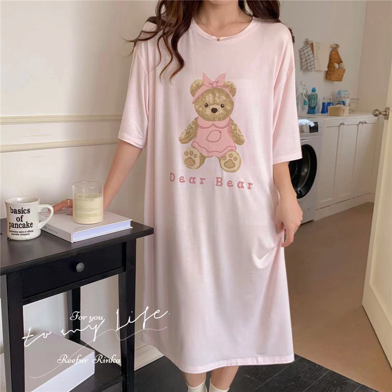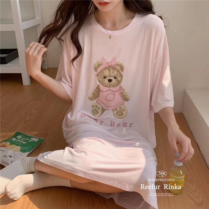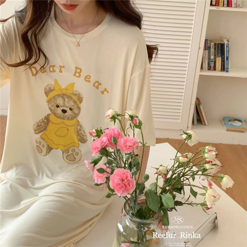 Reefur Rinka 배 꽃 홈 봄 얇은 여자의 모달 라운드 넥 인쇄 인형 곰 반소매 긴 잠옷 홈
