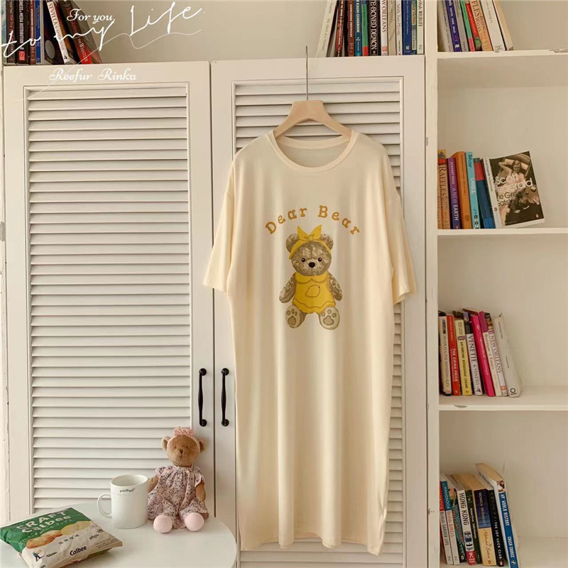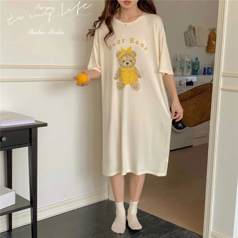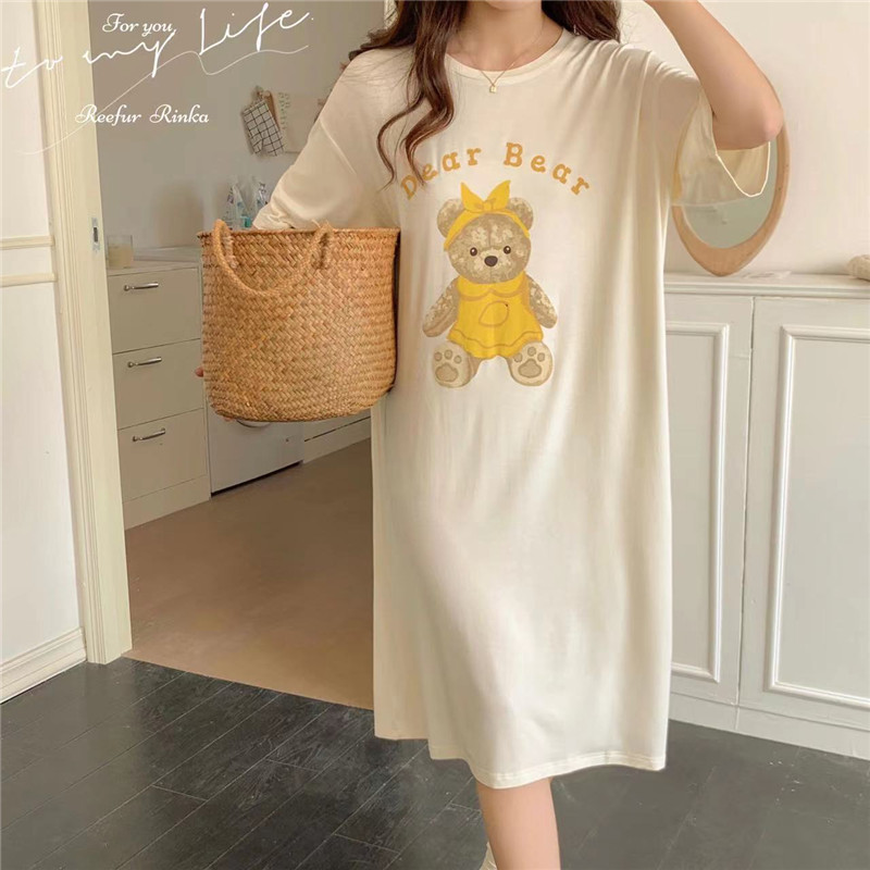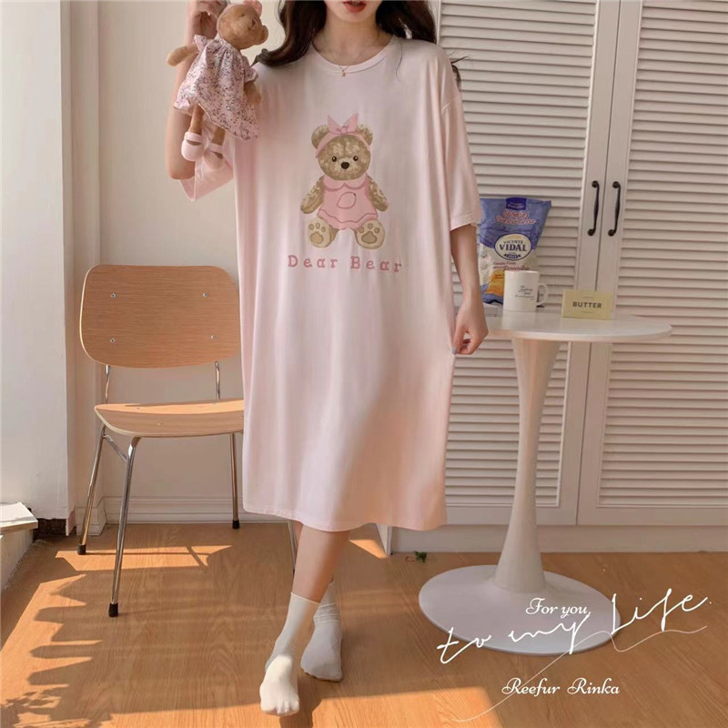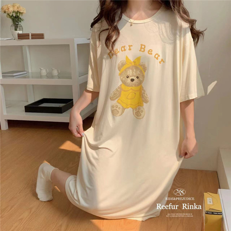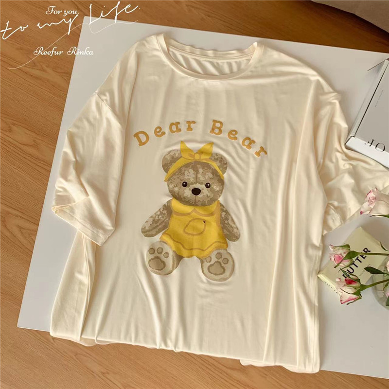 Reefur Rinka 배 꽃 홈 봄 얇은 여자의 모달 라운드 넥 인쇄 인형 곰 반소매 긴 잠옷 홈