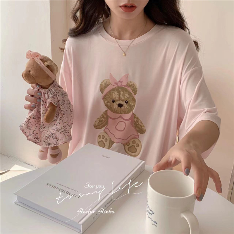 Reefur Rinka 배 꽃 홈 봄 얇은 여자의 모달 라운드 넥 인쇄 인형 곰 반소매 긴 잠옷 홈스토어 가기