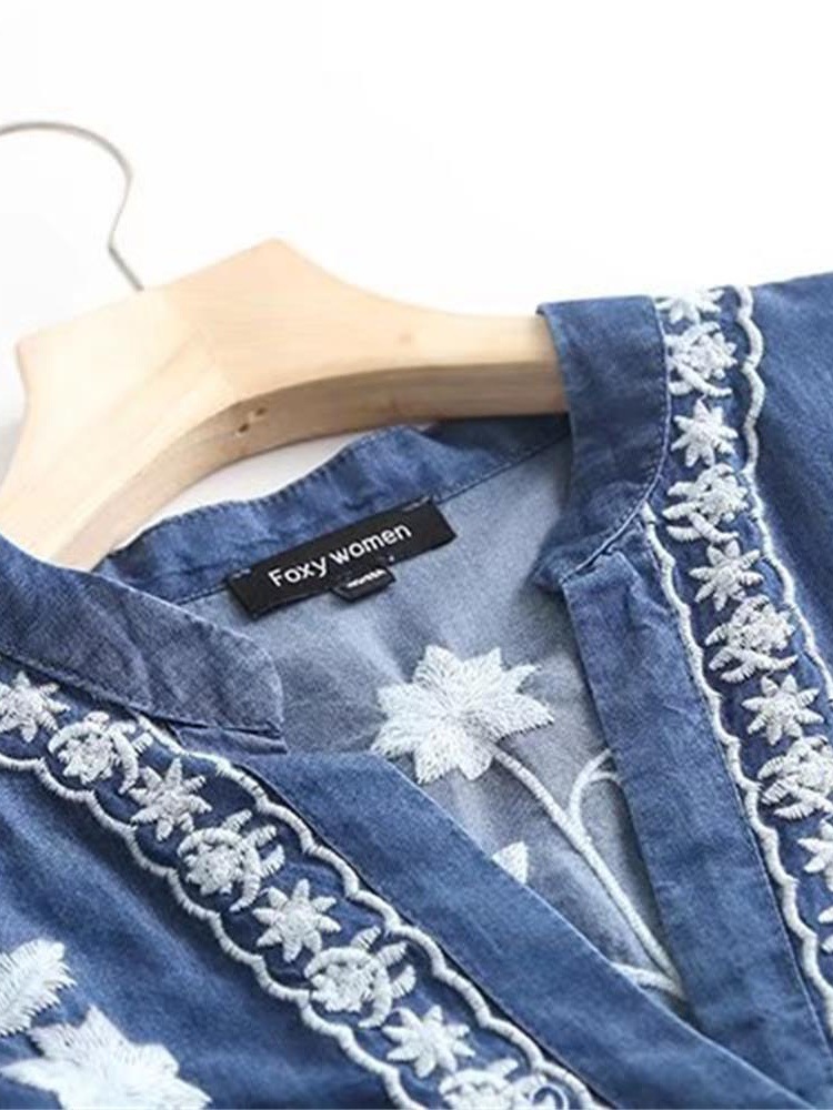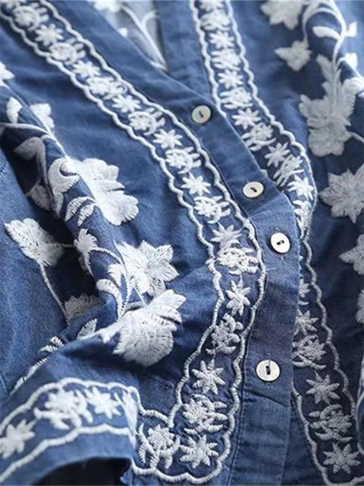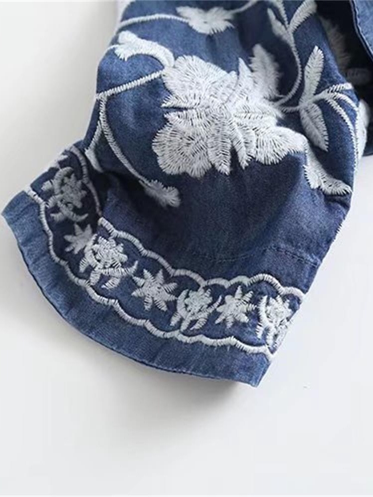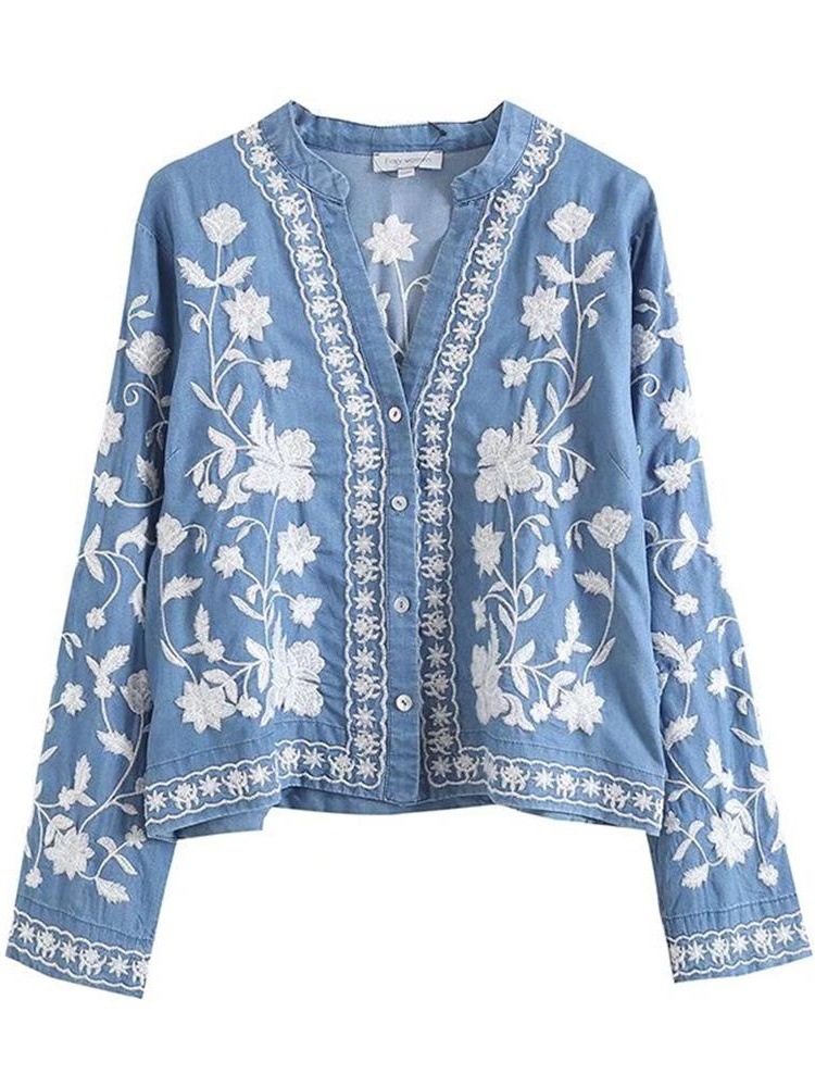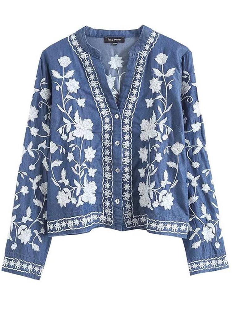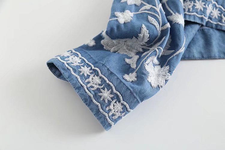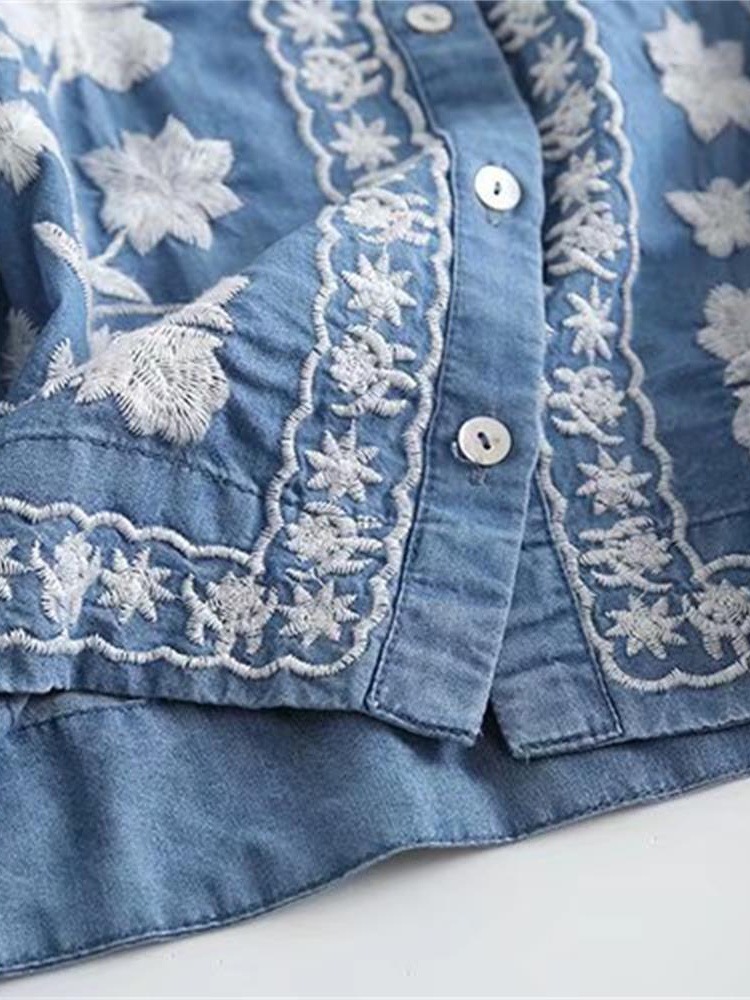 유럽 및 미국 여성 의류 가을 겨울 신상품 해외 무역 도매 레트로 긴팔 꽃 자수 데님 스타일 여성 셔츠