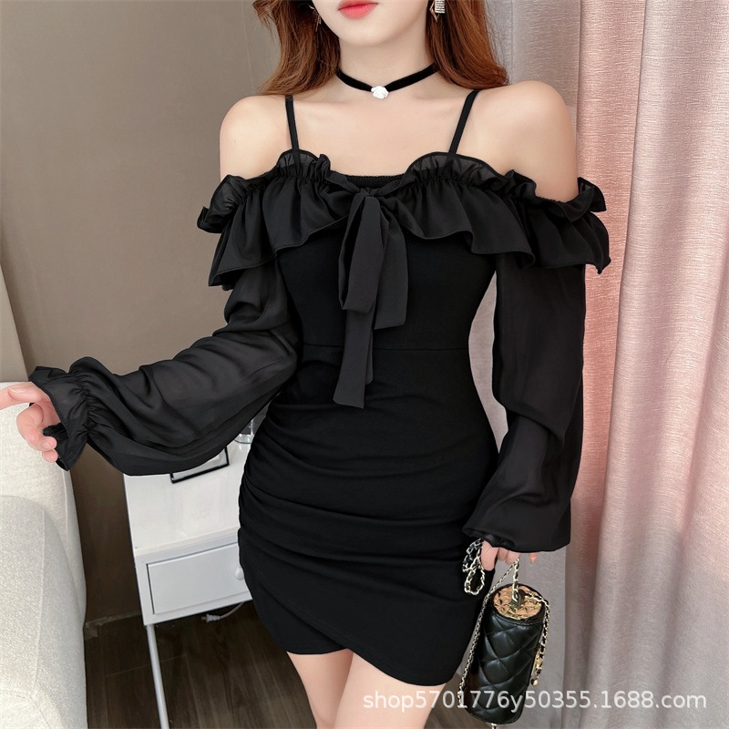 한국 스타일 오프 숄더 스파이스 걸 슬링 원피스 여성의 봄과 여름 프릴 긴 소매 슬림 핏 접힌 가방 힙합 원피스스토어 가기
