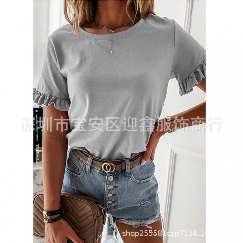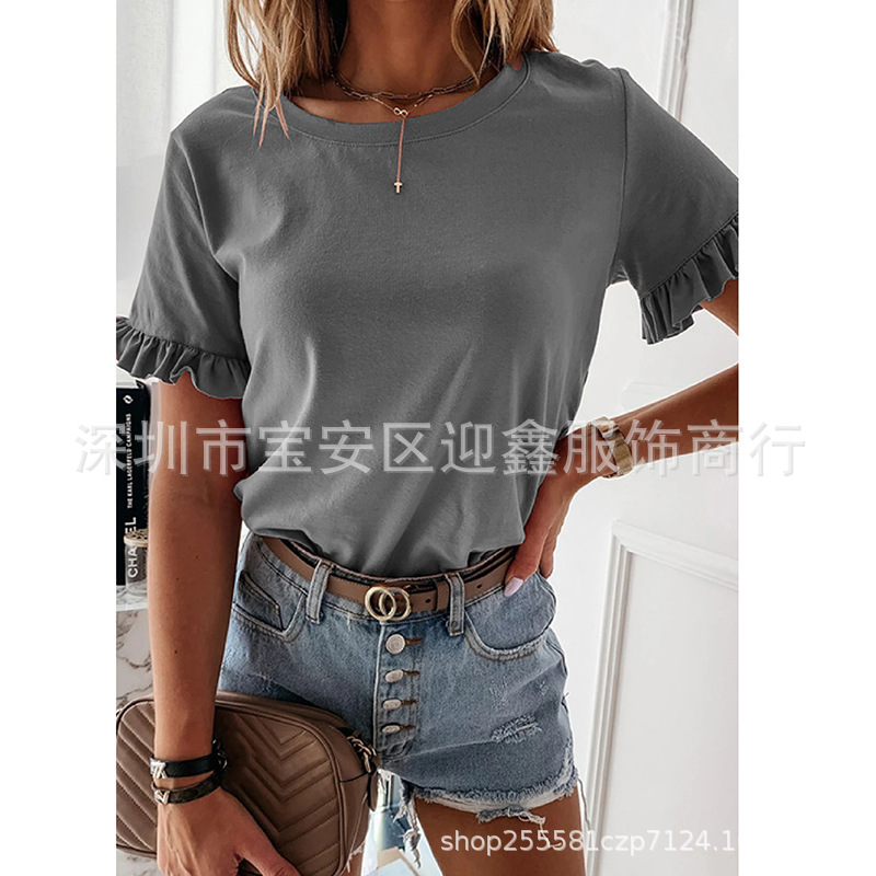 재고 2024 새로운 봄과 여름 유럽과 미국 여성의 아마존 폭발성 단색 짧은 소매 러플 크루 넥 티셔츠스토어 가기