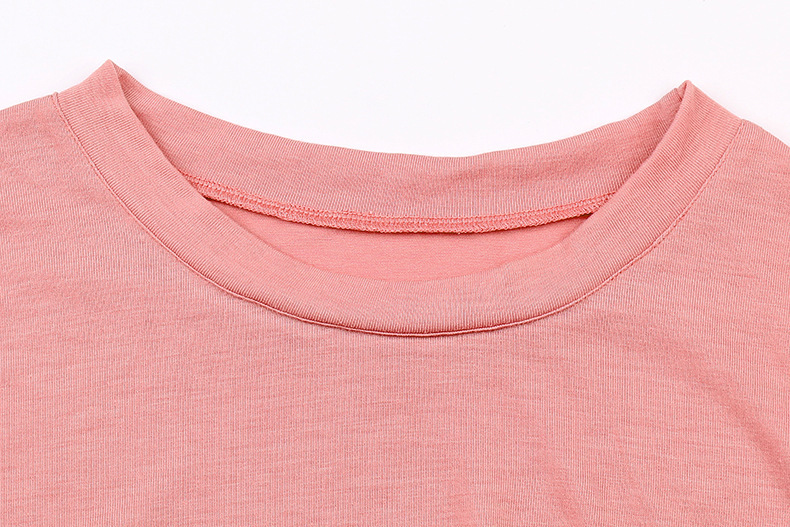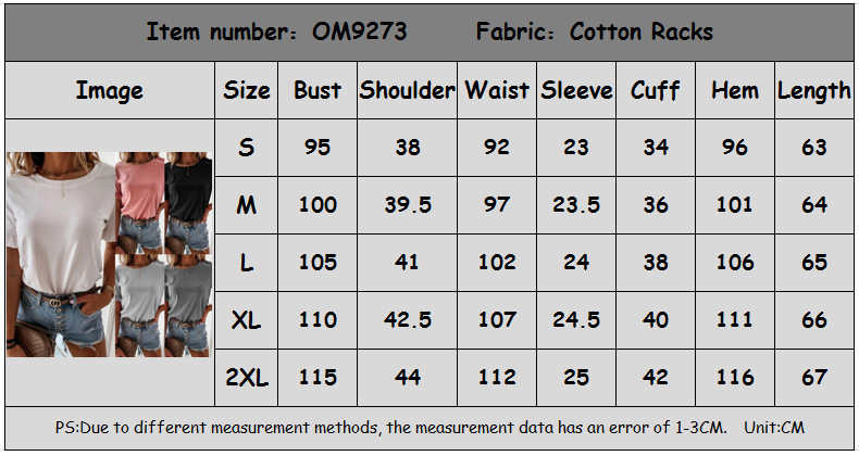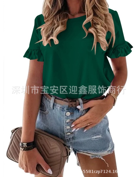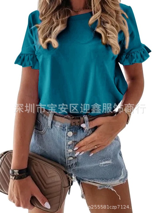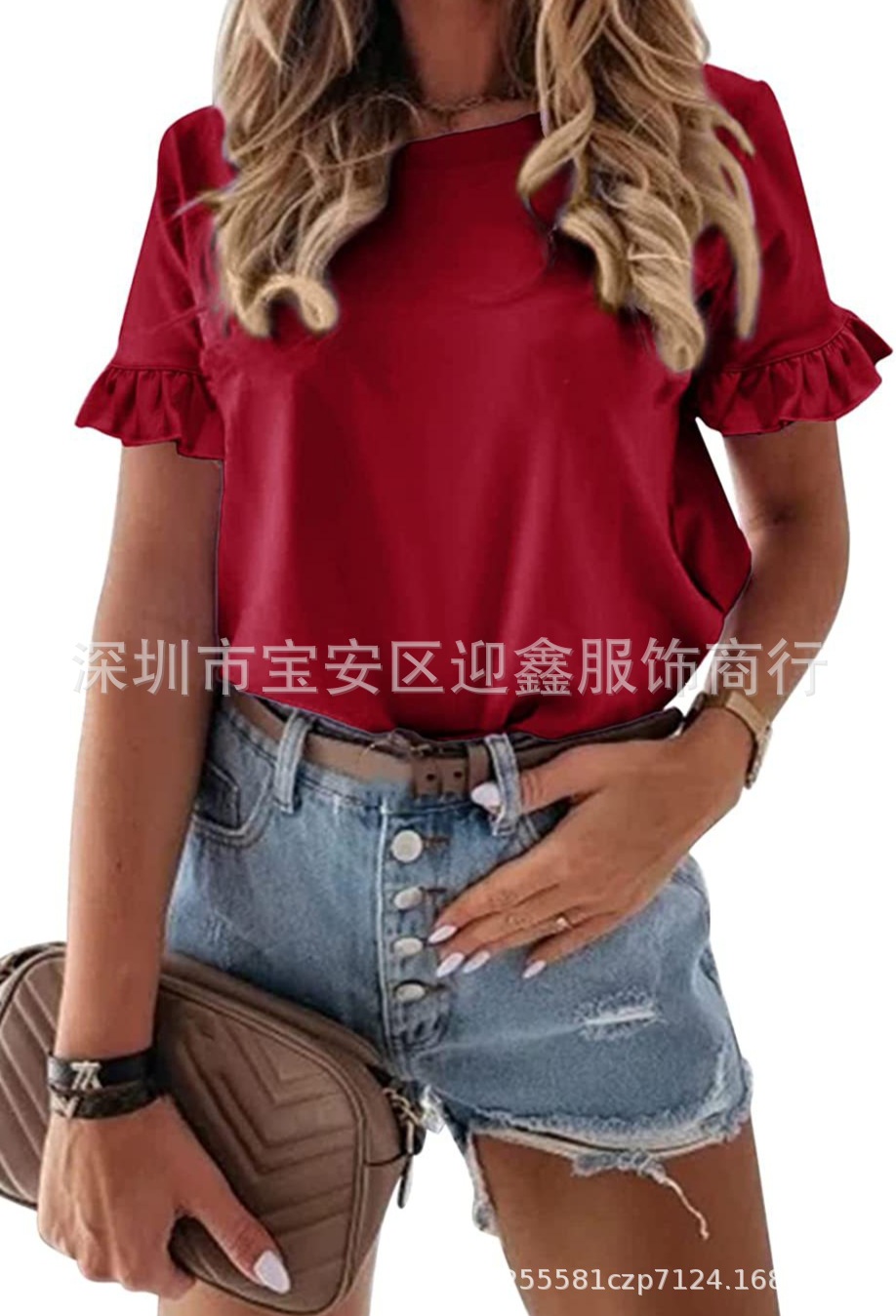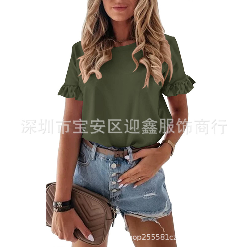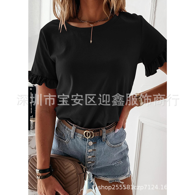 재고 2024 새로운 봄과 여름 유럽과 미국 여성의 아마존 폭발성 단색 짧은 소매 러플 크루 넥 티셔츠