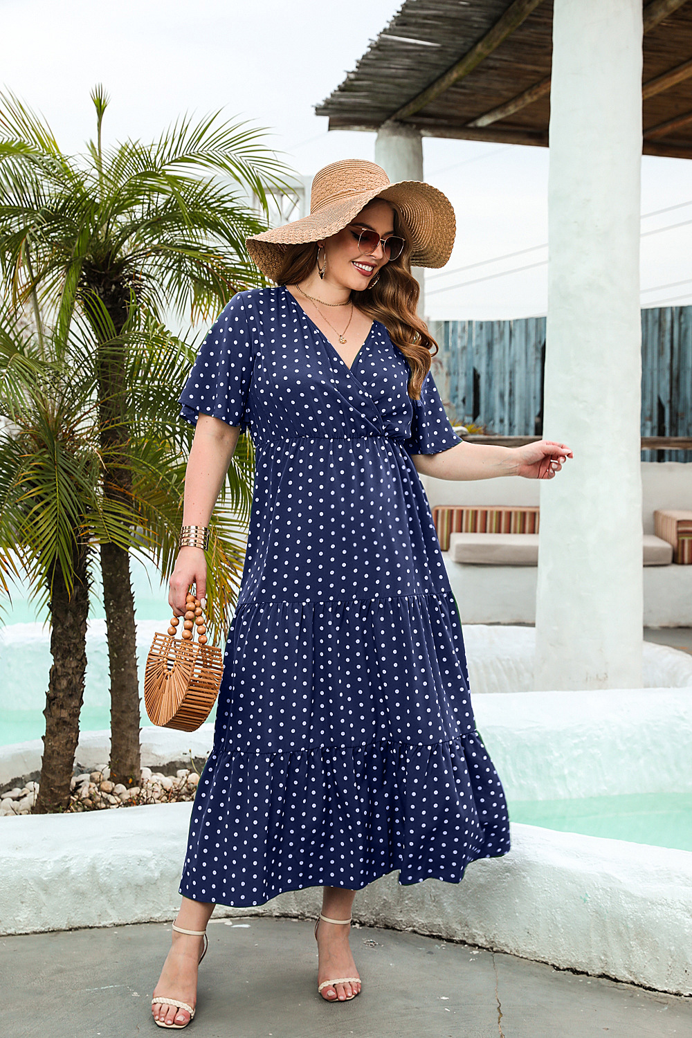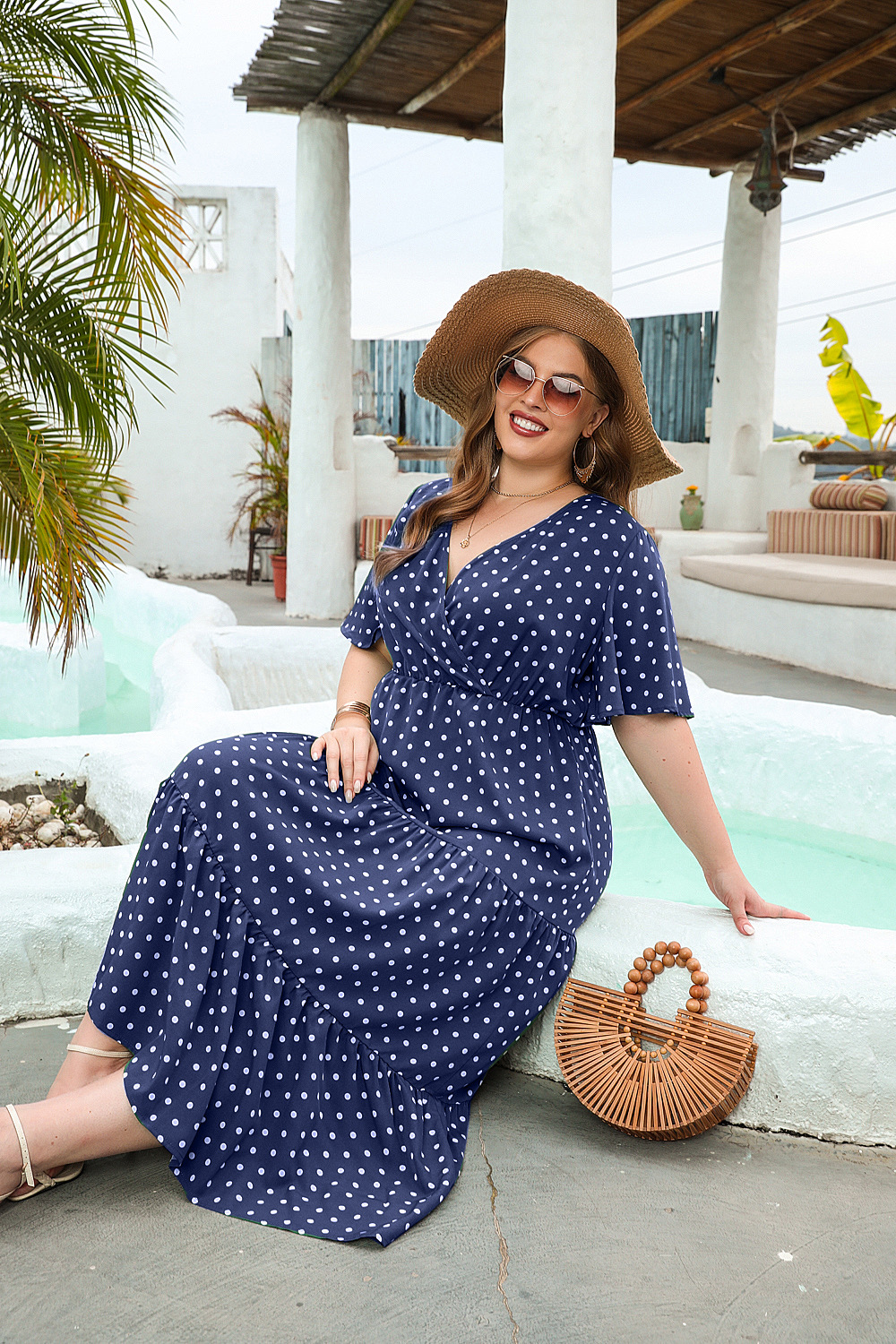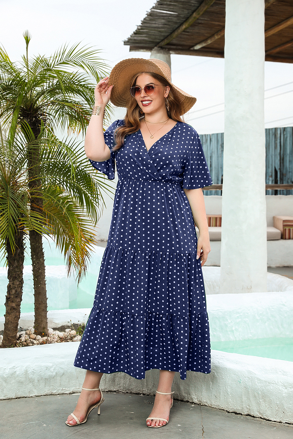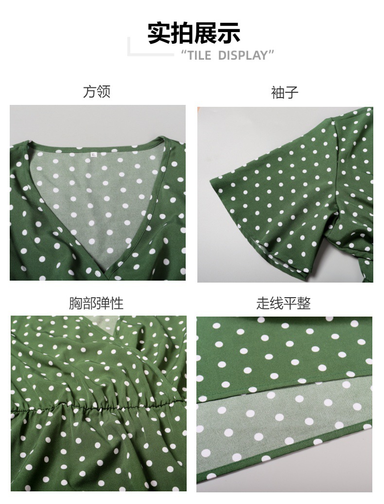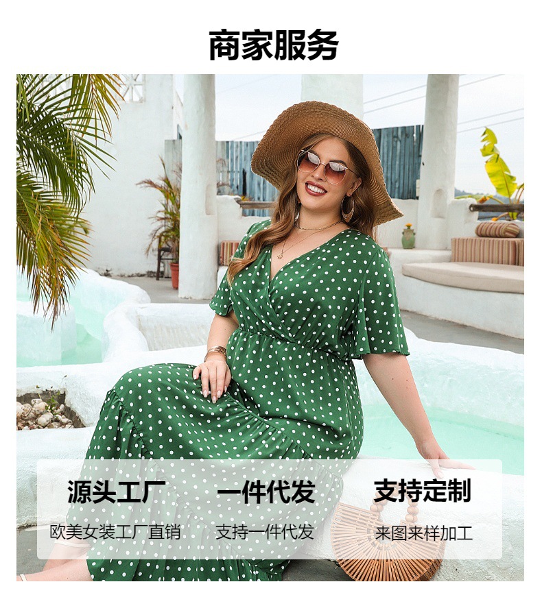 2025 여름 뉴 플러스 사이즈 여성 플러스 사이즈 웨이브 닷 캐주얼 휴가 원피스 V-넥 우아한 대형 스윙 중간 길이 원피스스토어 가기