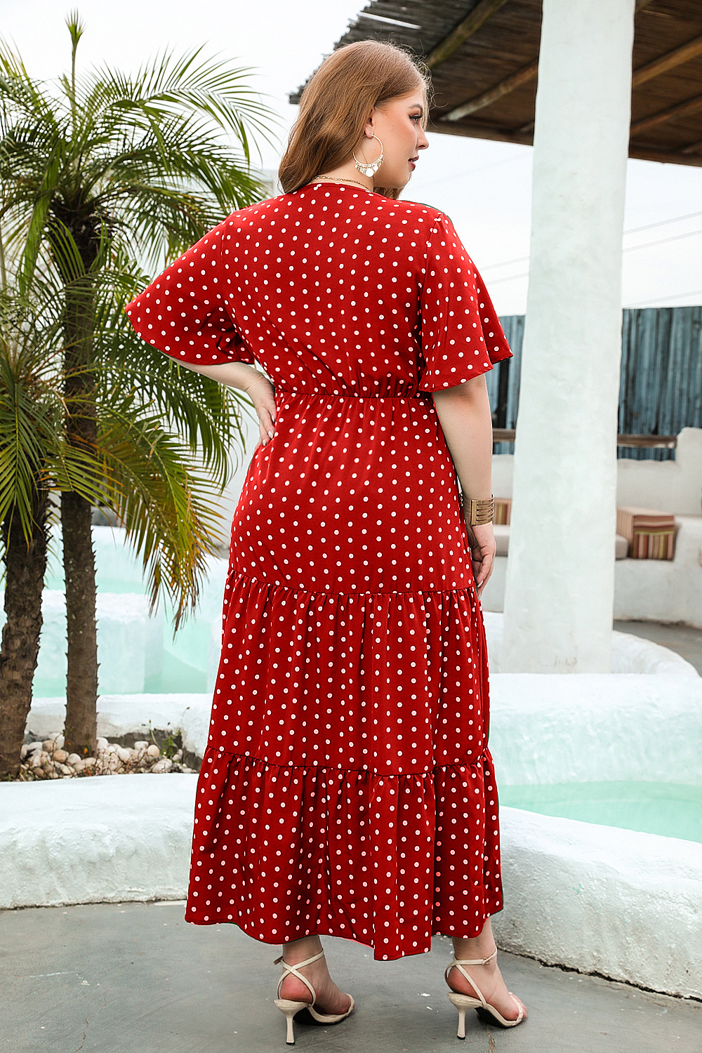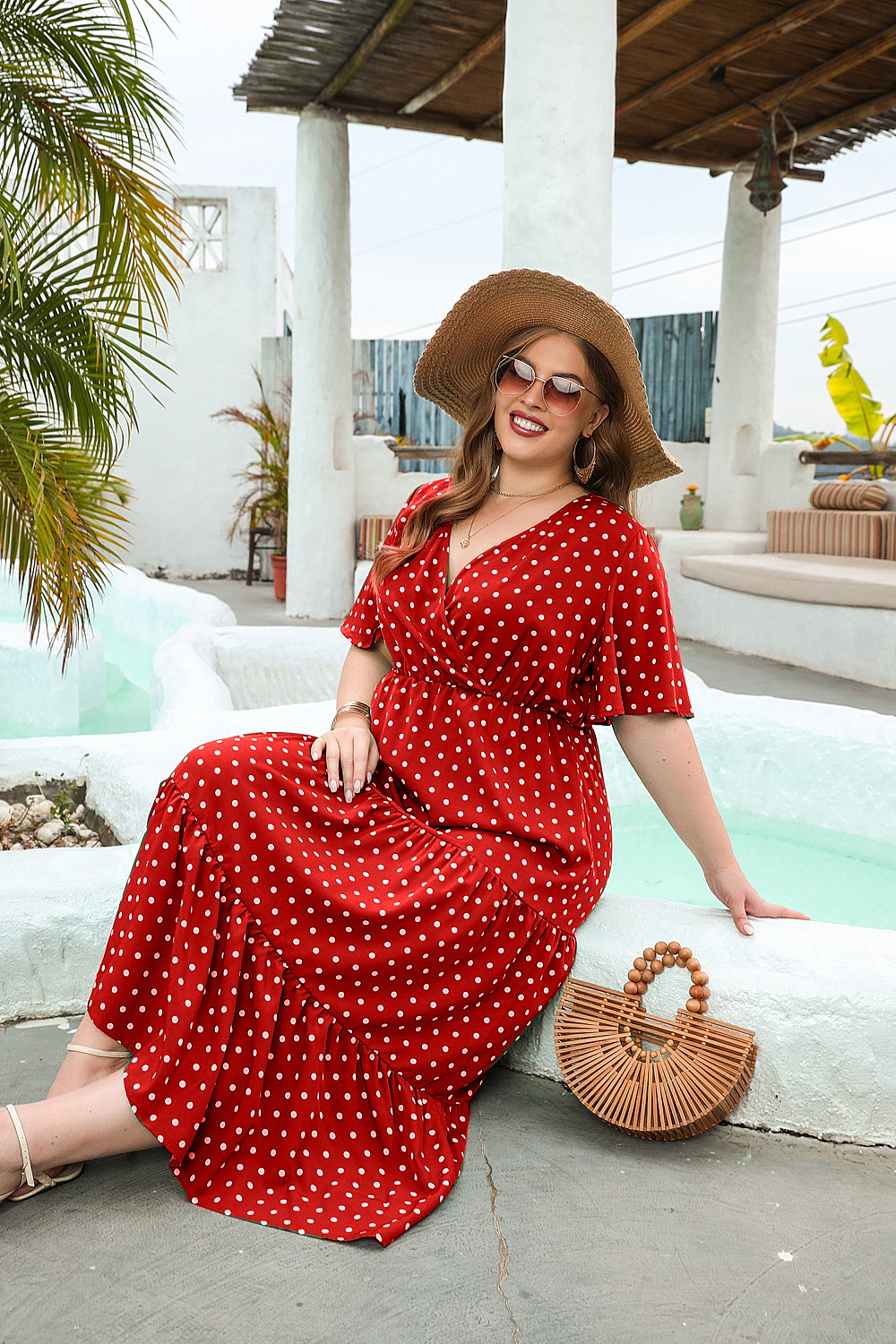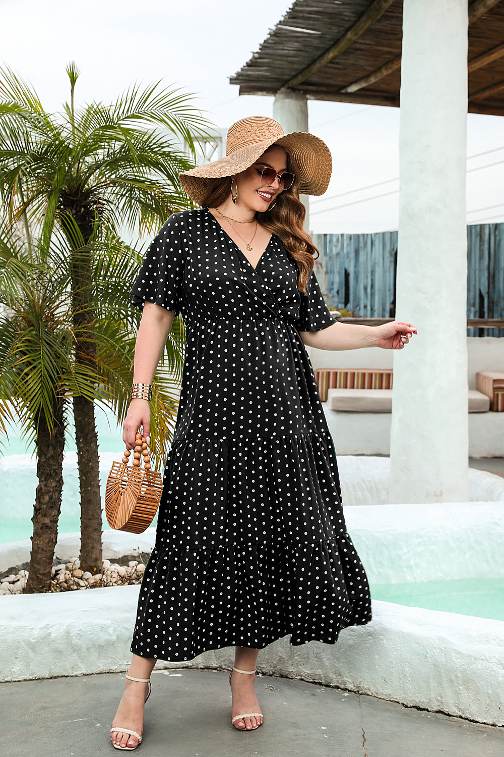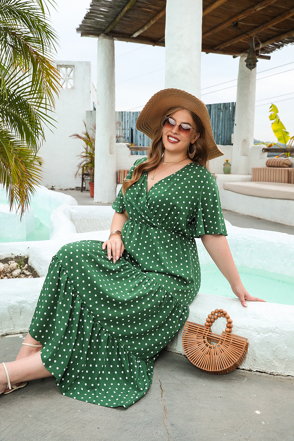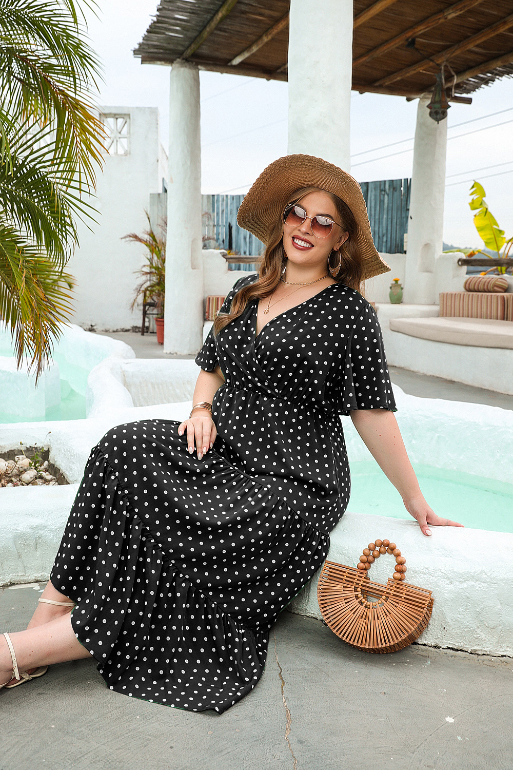 2025 여름 뉴 플러스 사이즈 여성 플러스 사이즈 웨이브 닷 캐주얼 휴가 원피스 V-넥 우아한 대형 스윙 중간 길이 원피스스토어 가기