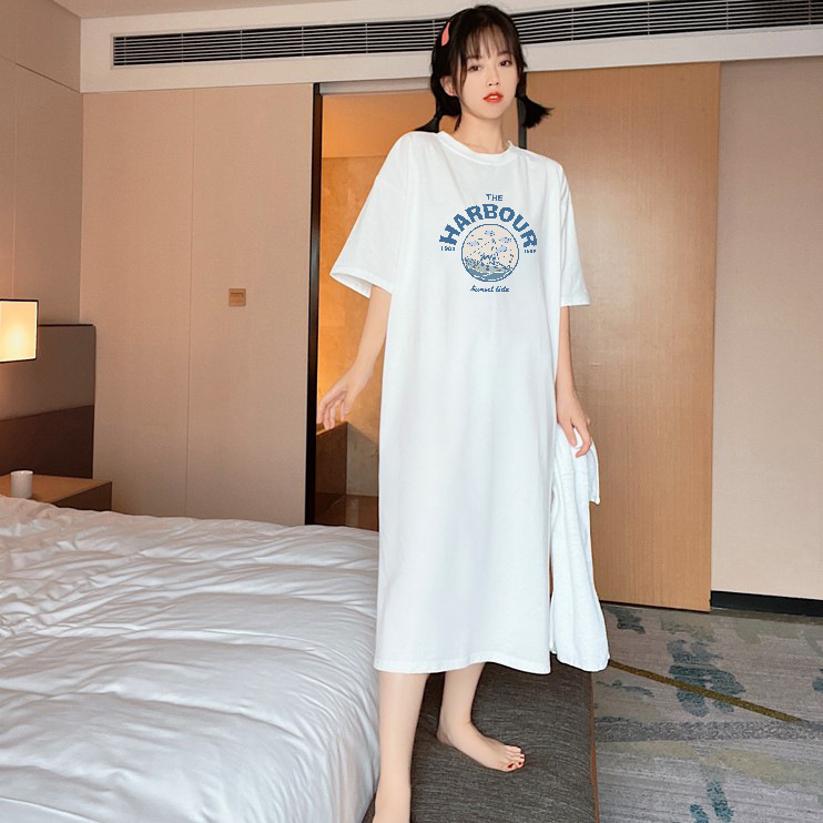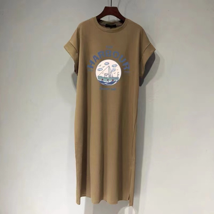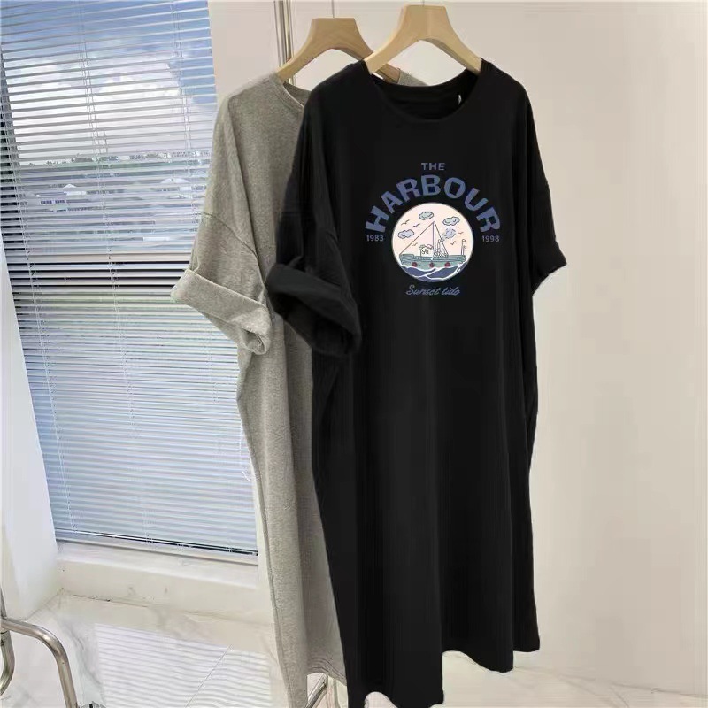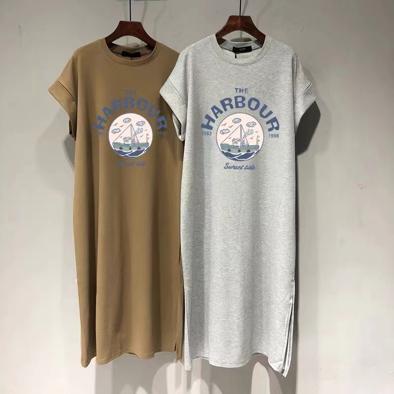 한국 여름 여성 의류 긴 무릎 길이 스커트 반팔 티셔츠 스커트 여성 패션 분할 편지 인쇄 드레스스토어 가기